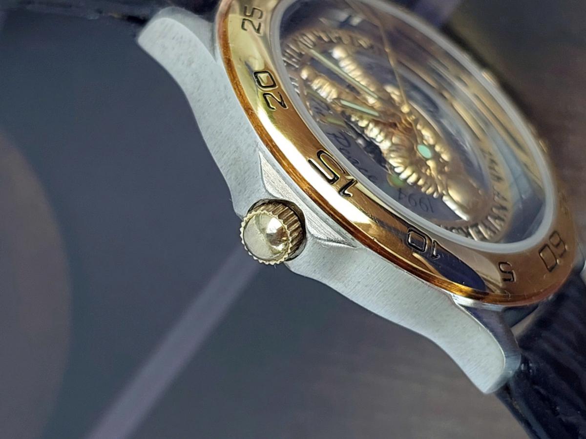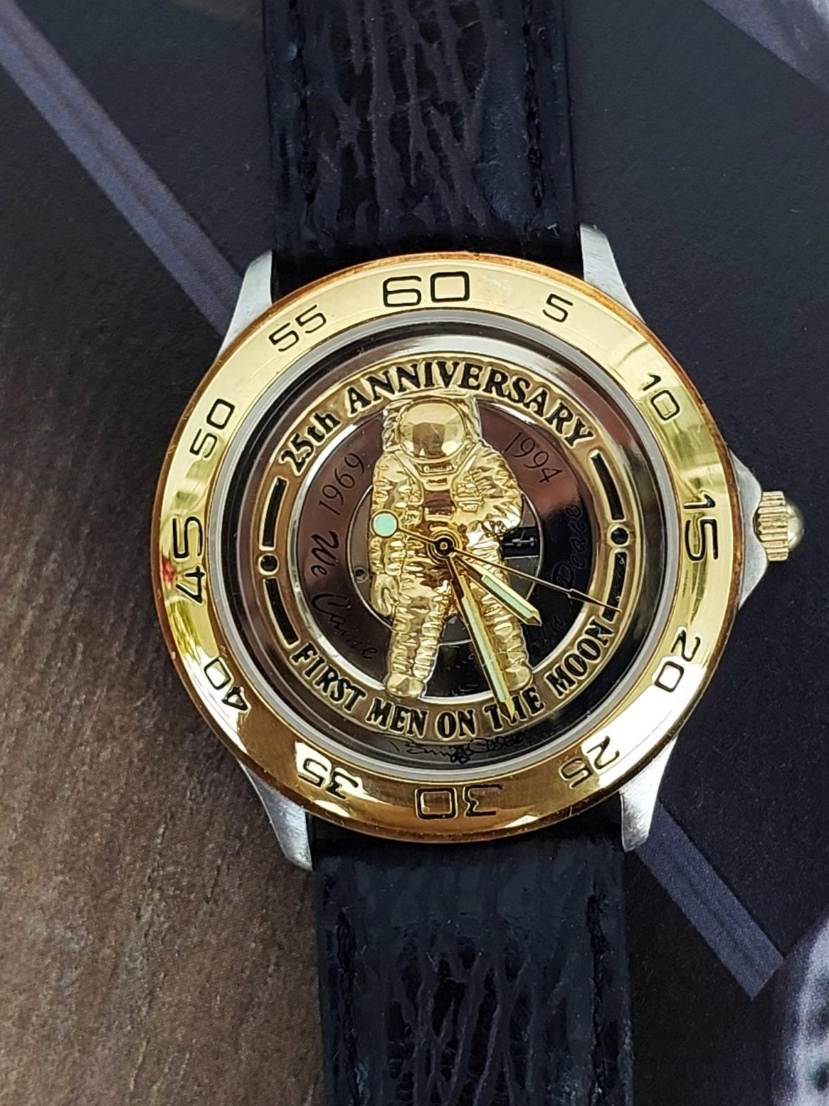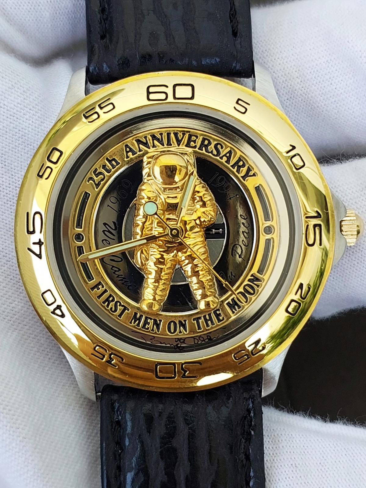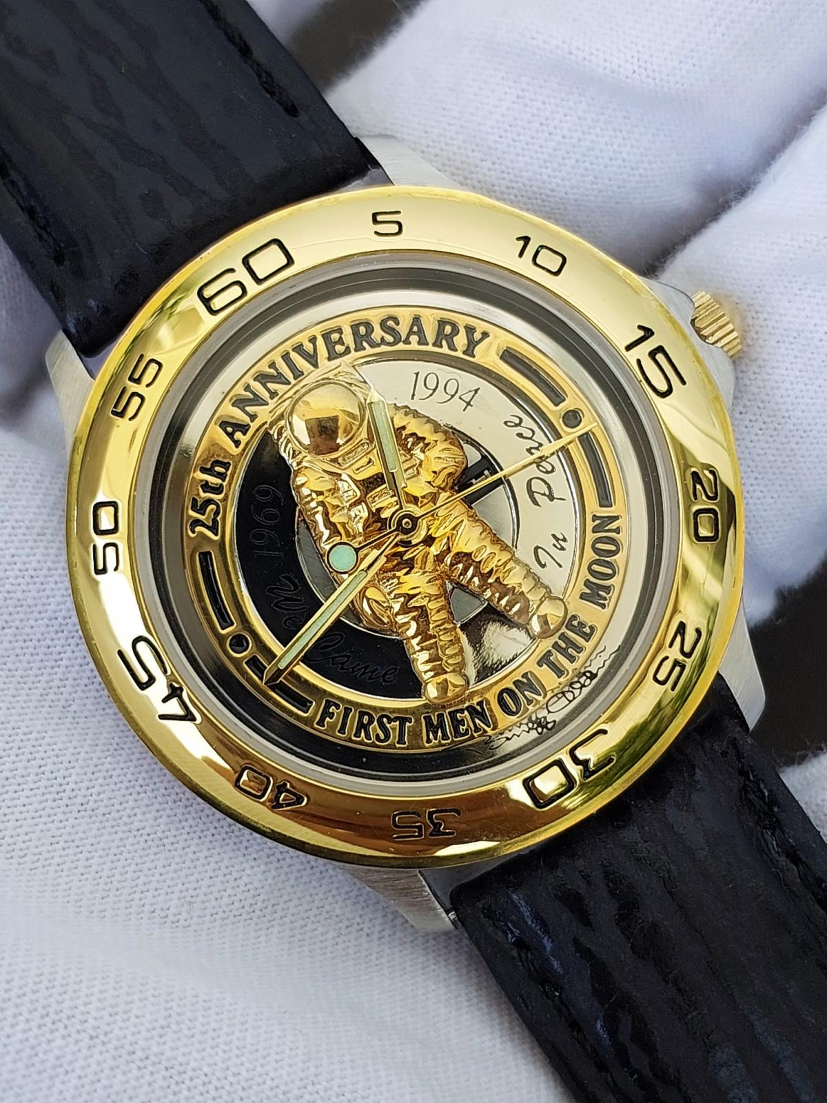 Mẫu ĐH Appolo được sản xuất giới hạn nhằm kỷ niệm 25 năm sự kiện con người lần đầu đặt chân lên Mặt Trăng (1969 - 1994), chiếc đồng hồ này là minh chứng cho khát vọng khám phá không gian vô tận. Mặt đồng hồ là một tác phẩm nghệ thuật 3D sống động, khắc họa hình ảnh phi hành gia huyền thoại Buzz Aldrin được mạ vàng 23k trong bộ đồ vũ trụ, bước đi trên bề mặt Mặt Trăng và góc 6h chữ ký của ông. Dòng chữ "25th ANNIVERSARY" và dòng chữ "FIRST MEN ON THE MOON" tôn vinh sự kiện lịch sử năm 1969, khi con người lần đầu tiên đặt chân lên Mặt Trăng – một khoảnh khắc vĩ đại mãi mãi đi vào sử sách. Mặt sau đồng hồ khắc dòng chữ khẳng định rằng mặt số của chiếc đồng hồ này chứa kim loại từ tàu vũ trụ Columbia và mô-đun Eagle – hai phương tiện đã đưa Neil Armstrong, Buzz Aldrin và Michael Collins thực hiện nhiệm vụ huyền thoại.. ĐH sd máy Pin Japan, sx năm 1994, dây khóa zin hãng ,size 39mm, độ mới tầm 97%.