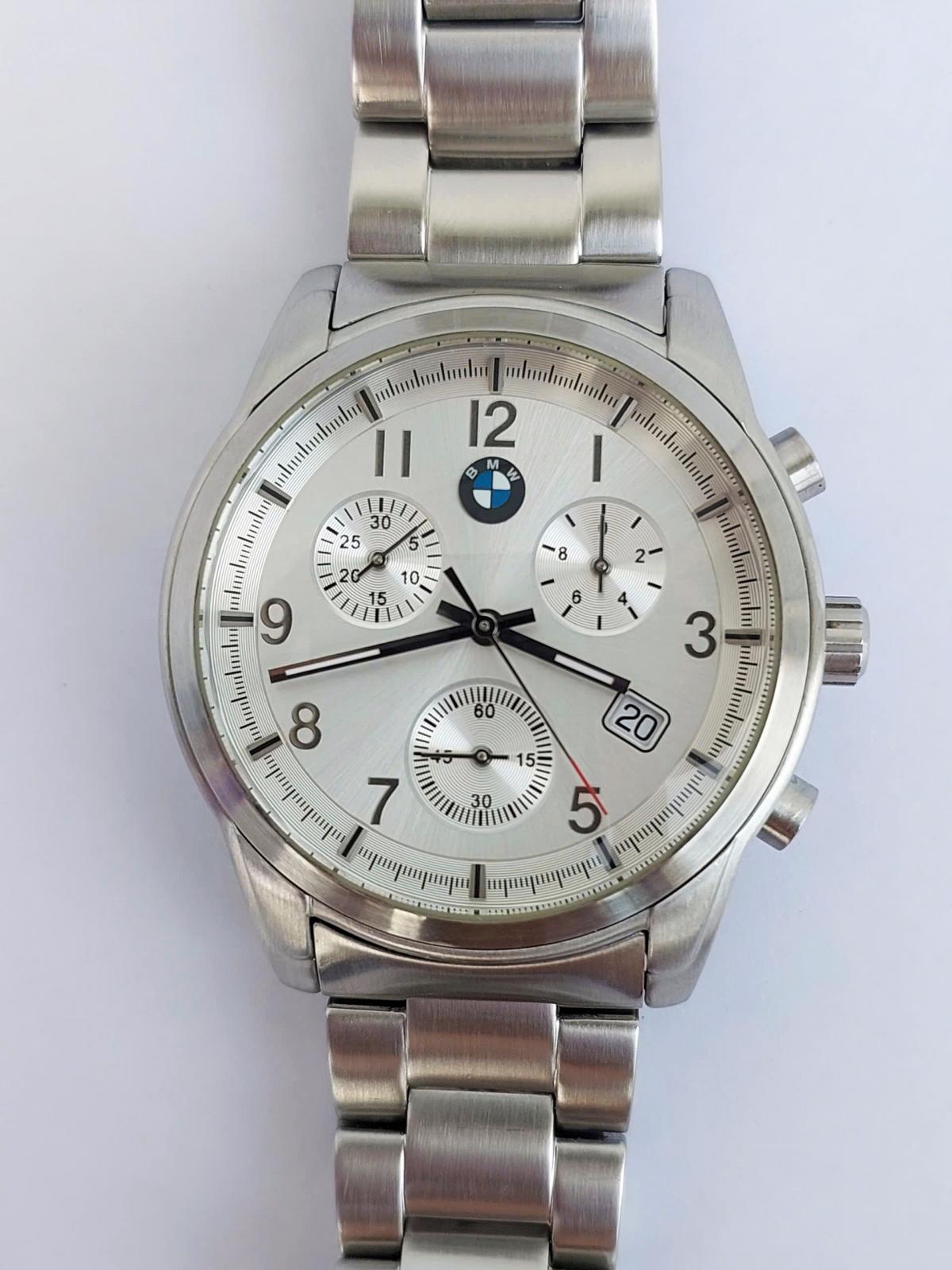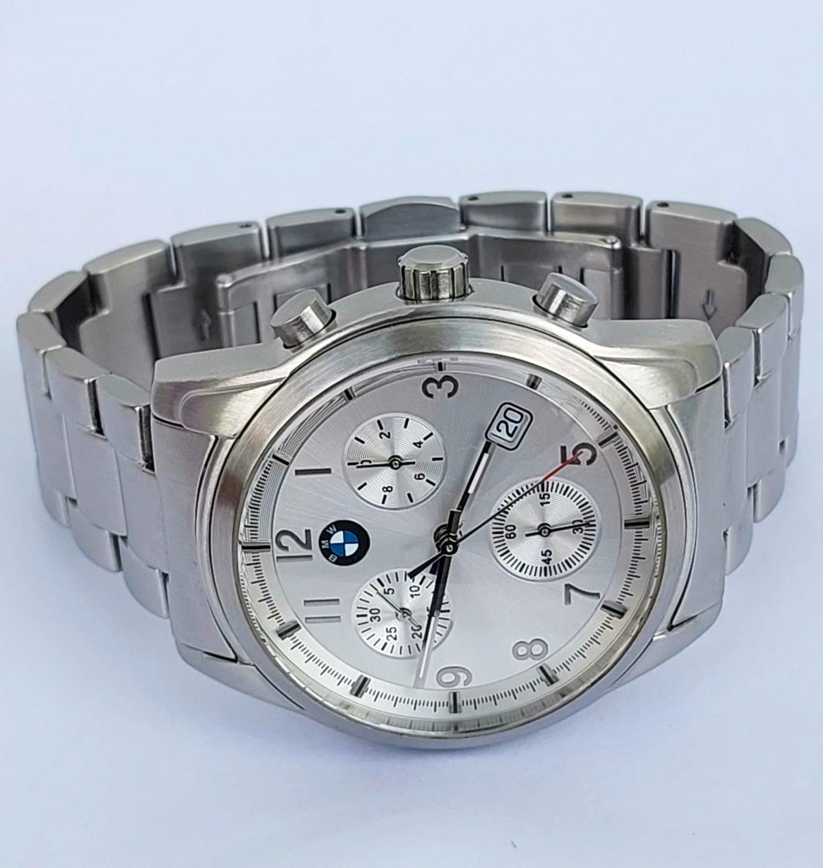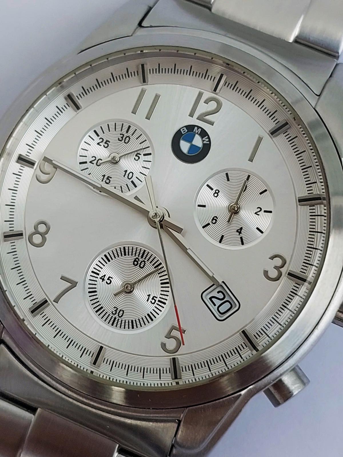 Sự kết hợp hoàn hảo giữa tinh thần thể thao mạnh mẽ và vẻ sang trọng cùng mẫu đồng hồ B.M. Sở hữu vẻ ngoài nổi bật với vỏ và dây thép không gỉ đánh vân đẹp mắt, chắc chắn và đầm tay. Mặt số Sunray bạc tinh tế, logo B.M.W tại vị trí 12 giờ tạo điểm nhấn đẳng cấp. Ba mặt số phụ chronograph cùng ô lịch đặt chéo mang đến diện mạo hiện đại, đa dụng. Một mẫu đh đẹp cho người đàn ông hiện đại, yêu thích phong cách lịch lãm nhưng vẫn muốn giữ lại nét gai góc, bản lĩnh của khát khao chinh phục tốc độ. Chính hãng B.M.W Đức, sd máy Pin Thụy Sỹ, nguyên bản, size 40mm, độ mới tầm 97%