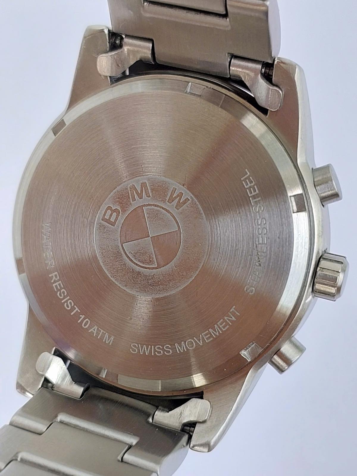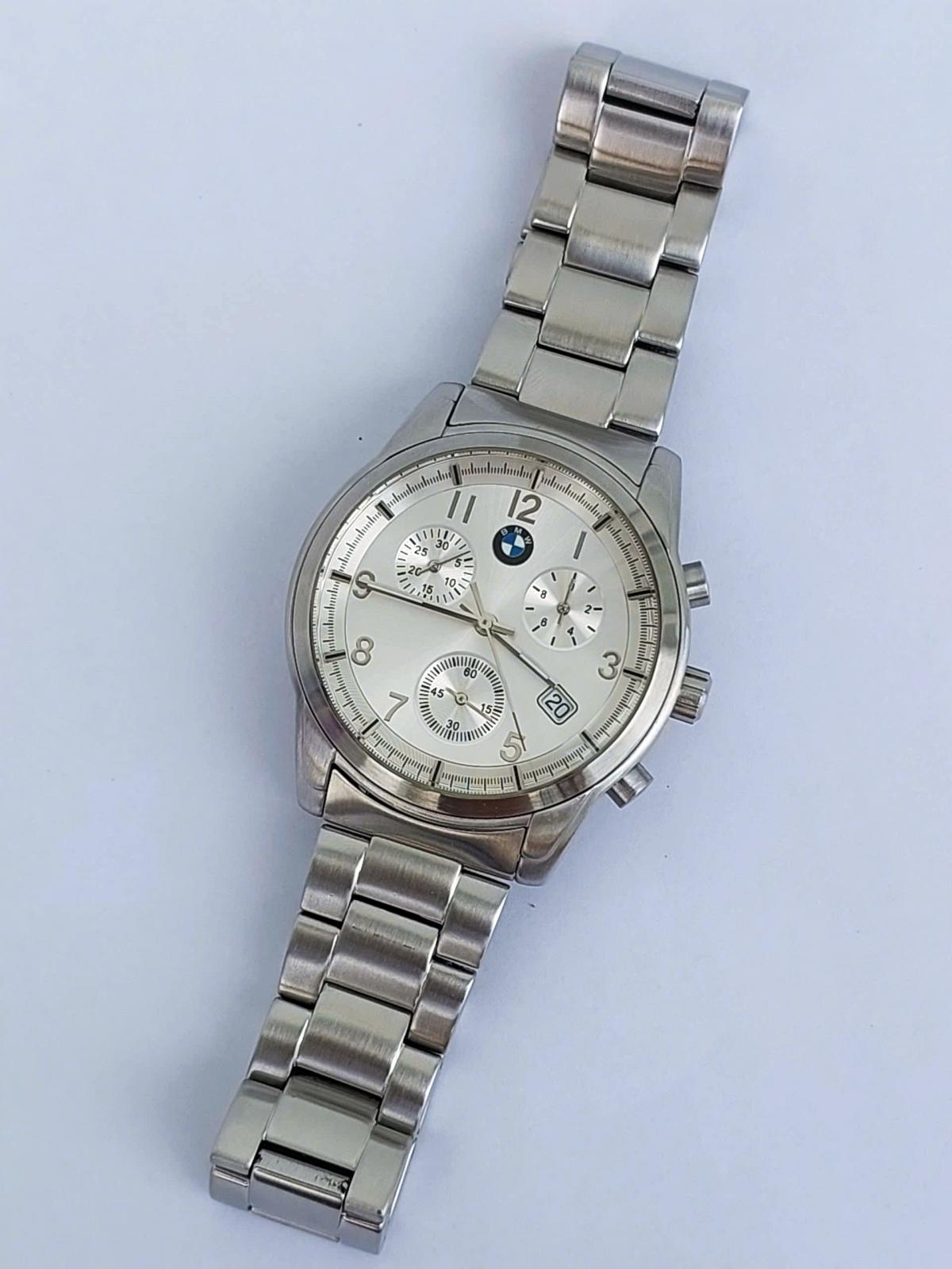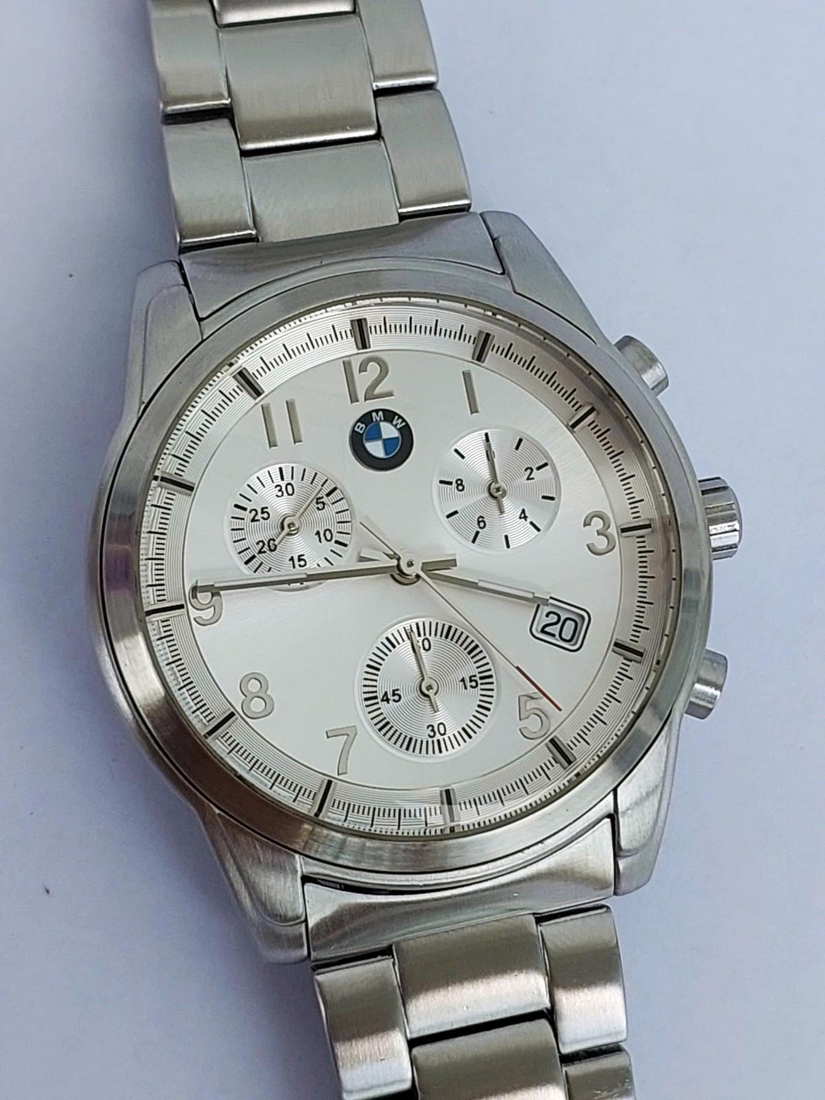 Sự kết hợp hoàn hảo giữa tinh thần thể thao mạnh mẽ và vẻ sang trọng cùng mẫu đồng hồ B.M. Sở hữu vẻ ngoài nổi bật với vỏ và dây thép không gỉ đánh vân đẹp mắt, chắc chắn và đầm tay. Mặt số Sunray bạc tinh tế, logo B.M.W tại vị trí 12 giờ tạo điểm nhấn đẳng cấp. Ba mặt số phụ chronograph cùng ô lịch đặt chéo mang đến diện mạo hiện đại, đa dụng. Một mẫu đh đẹp cho người đàn ông hiện đại, yêu thích phong cách lịch lãm nhưng vẫn muốn giữ lại nét gai góc, bản lĩnh của khát khao chinh phục tốc độ. Chính hãng B.M.W Đức, sd máy Pin Thụy Sỹ, nguyên bản, size 40mm, độ mới tầm 97%