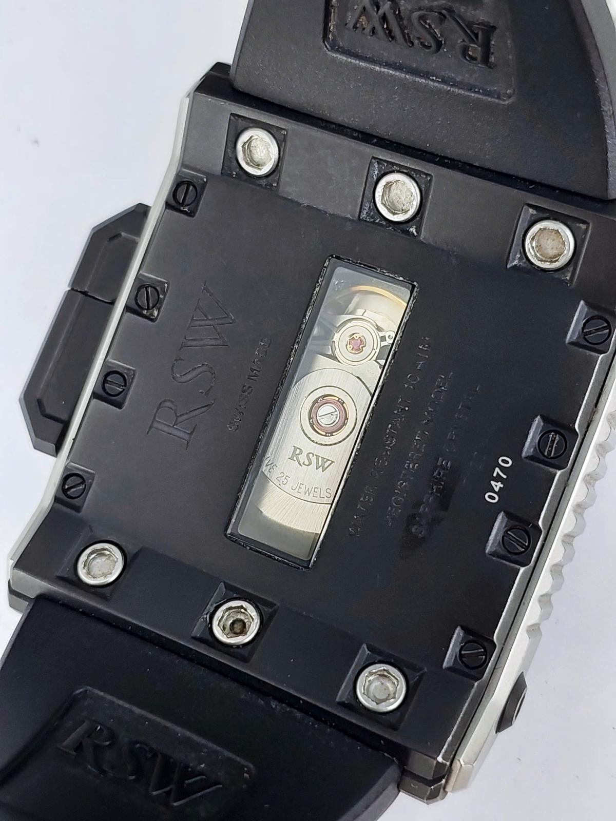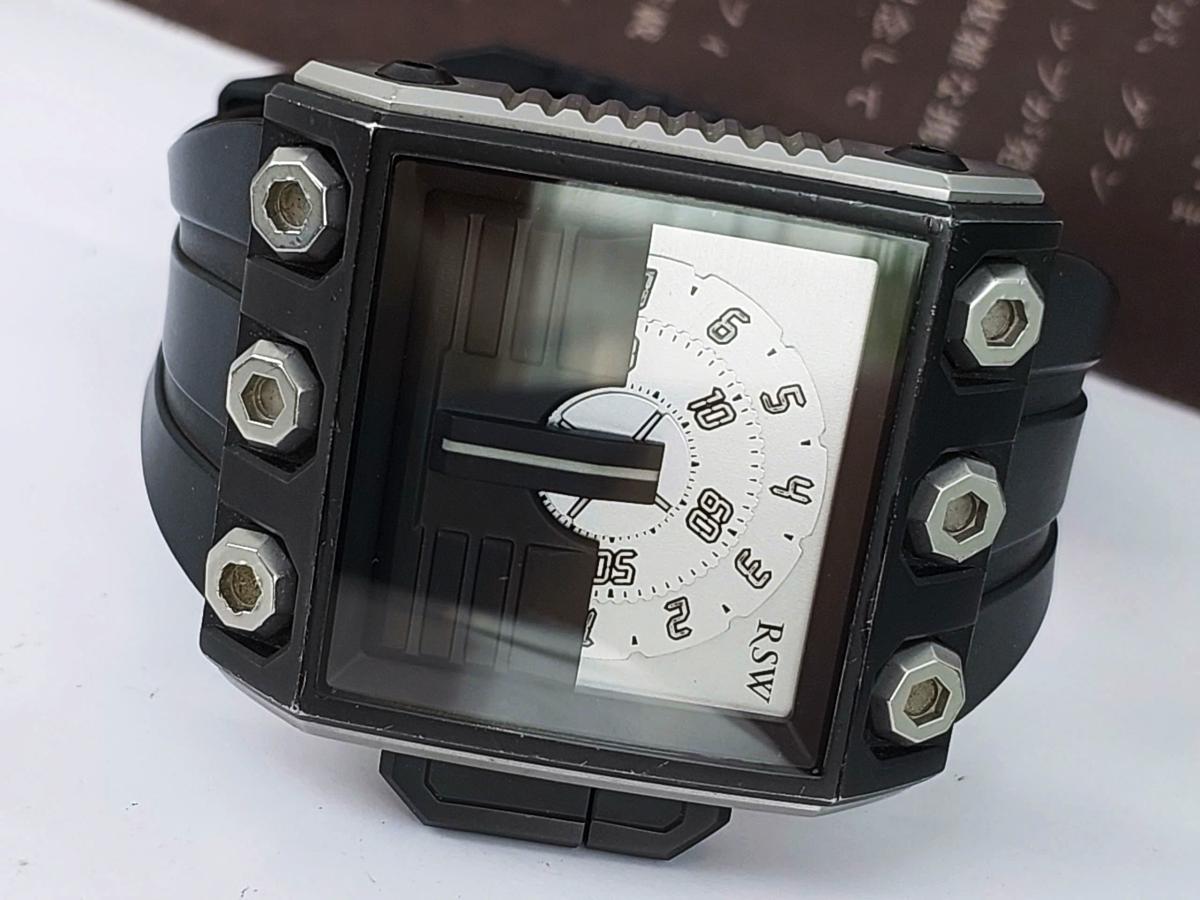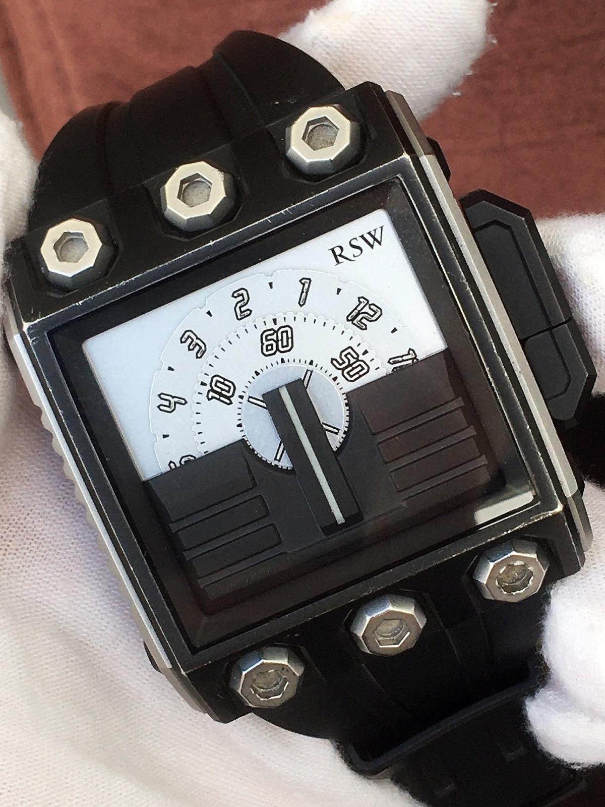Nằm trong phân khúc ĐH tự động cao cấp của hãng RSW Thụy Sỹ, Mẫu Outland với giá thời điểm 2010 giá xuất xưởng chóng mặt 3150 franc Thụy Sỹ tương đương 101tr Vnđ. Mang trong mình thiết kế hầm hố chỉ dành cho tay nam to, khỏe bởi thiết kế độc đáo, không đụng hàng. Vỏ đồng hồ được làm từ chất liệu kim loại cứng cáp, kết hợp với các đinh ốc chắc chắn quanh viền, tạo cảm giác như một chiếc đồng hồ của những người đam mê công nghệ hoặc thể thao mạnh mẽ. Mặt đồng hồ có thiết kế khá đặc biệt với kim chỉ giờ được thể hiện qua một dạng quay số độc đáo từ ngoài vào trong là Giờ - Phút - Giây tạo sự khác biệt rõ rệt so với những mẫu đồng hồ truyền thống. Mặt dưới của đồng hồ lộ cơ khí, cho thấy các bộ phận hoạt động của máy, búa có đóng tên thương hiệu. Dây cao su cứng cáp, bền bỉ càng tôn thêm tinh thần thể thao của mẫu nam đặc biệt này. Chính hãng R-S-W sx tại Thụy Sỹ, máy cơ tự động Thụy Sỹ, dây khóa zin, quan sát ảnh trên thân đồng hồ có nhiều vết xước càng tăng thêm nét phong trần từng trải tại những vùng đất xa xôi (Outland)![]()