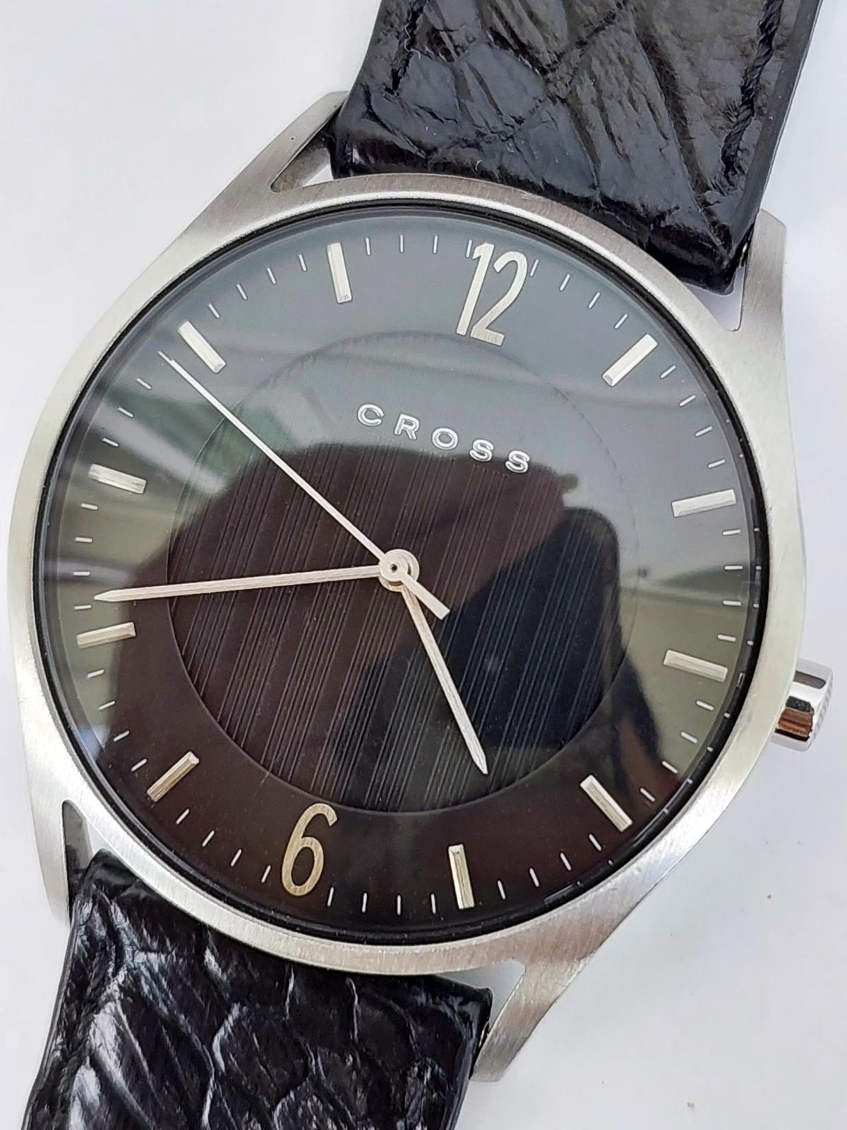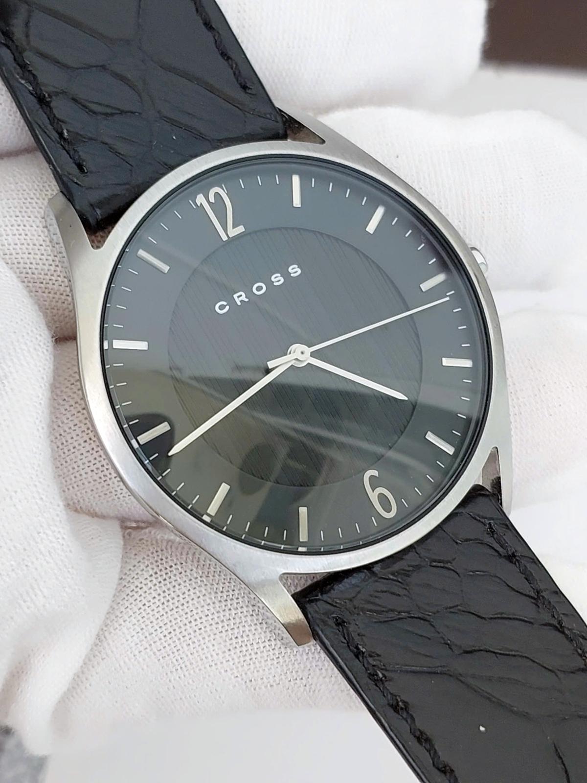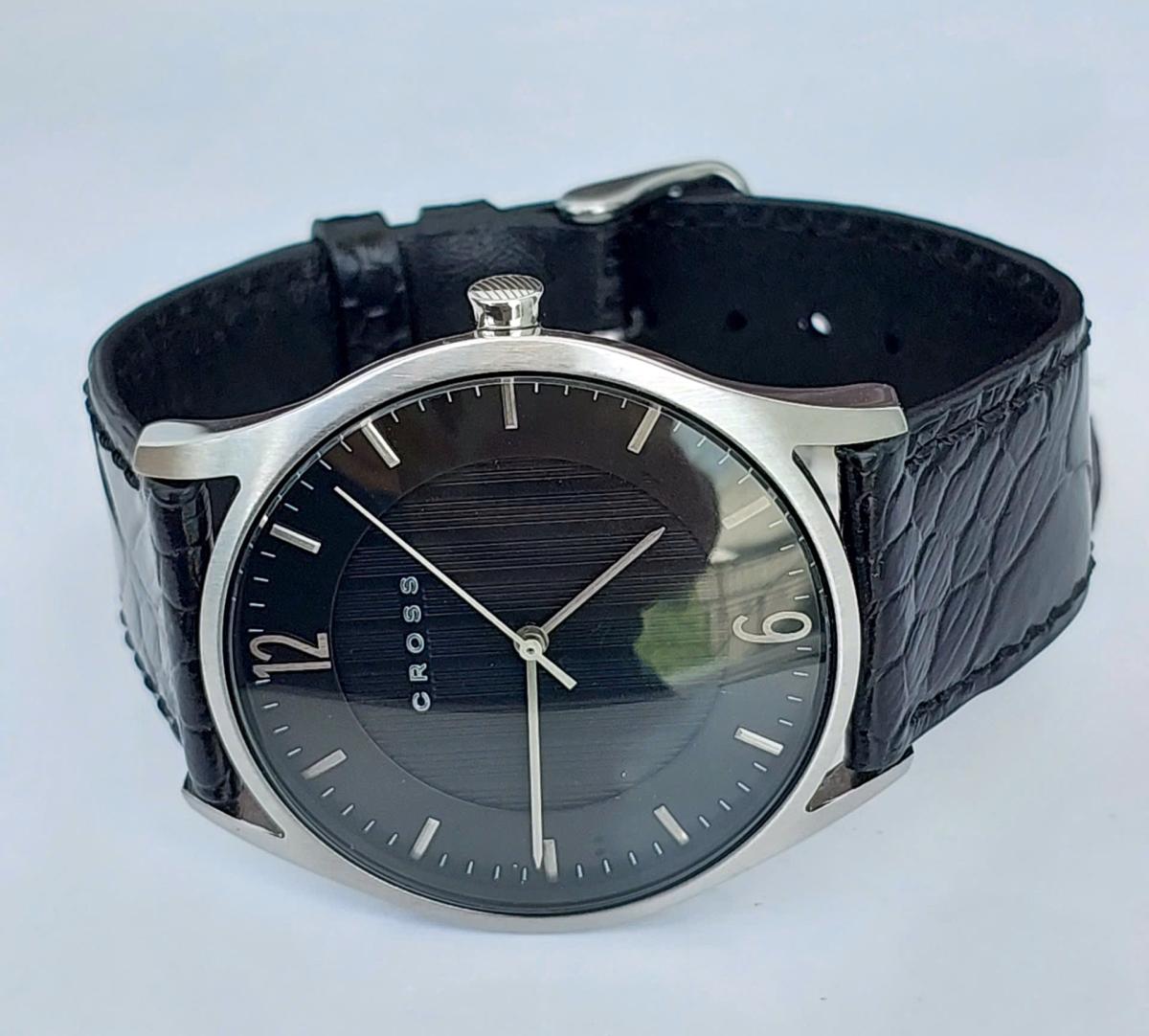 CR0SS nguyên zin chính hãng USA, thiết kế phong cách công sở với vẻ đẹp lịch lãm cho Nam. Thiết kế chất rất tốt, đẹp hài hòa với mặt số 2 lòng, vân trung tâm kẻ sọc, . Kim cọc thép đơn giản nhưng rất sắc nét,. Núm chỉnh và khóa có logo và tên thương hiệu,. Chính hãng Mỹ, sử dụng máy Pin Japan, khóa zin, dây da cá s.ấu thay thế, size 40mm, độ mởi tầm 97%.