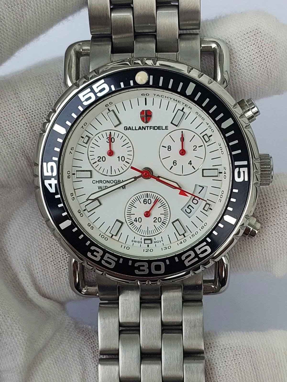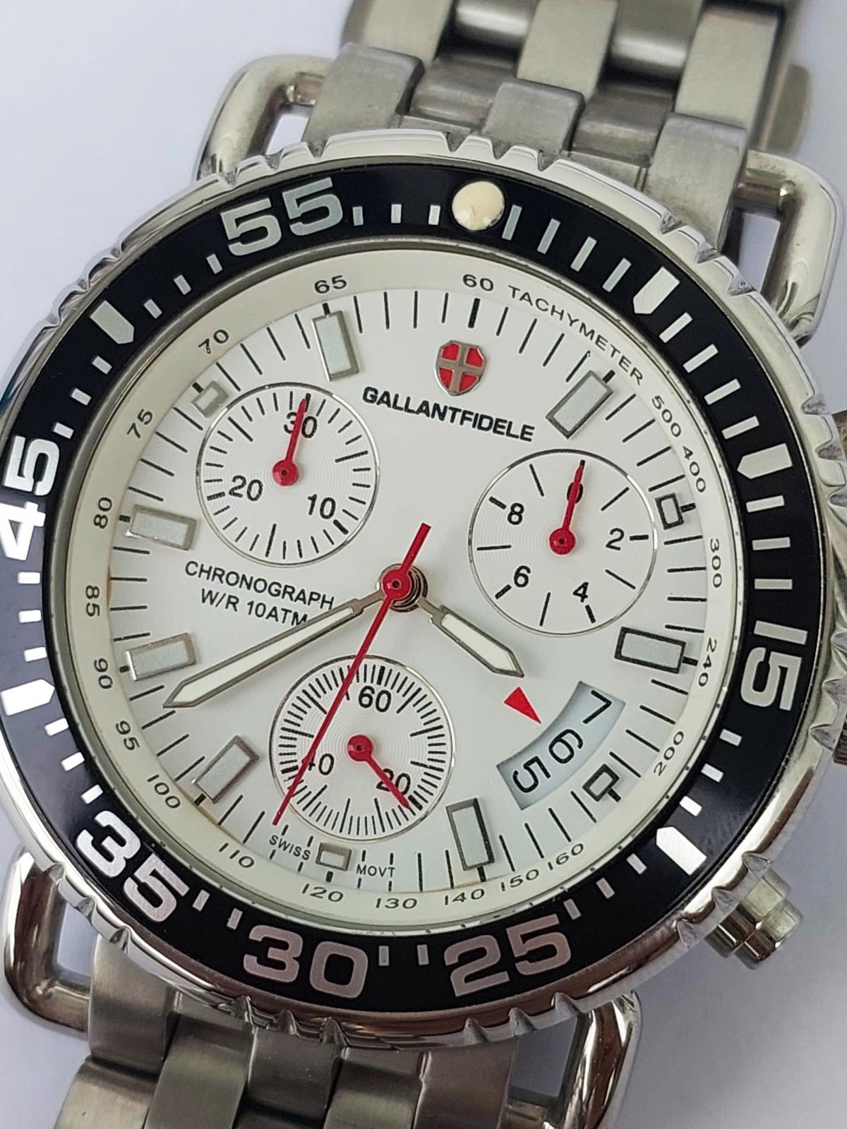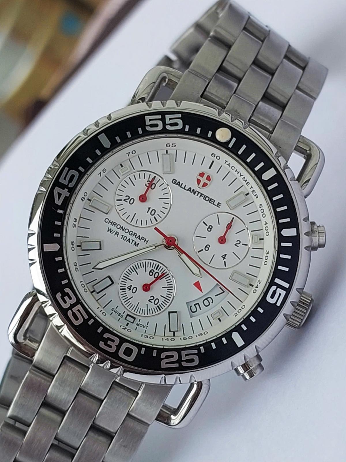 Khám phá vẻ đẹp đầy nam tính và mạnh mẽ của chiếc đồng hồ Gallantfidele , một "chiến binh" thời gian thực thụ dành cho các quý ông yêu thích phong cách thể thao sang trọng, nổi bật với mặt số trắng tinh khôi được bao bọc bởi vòng bezel đen xoay hầm hố tạo nên sự tương phản đầy cuốn hút, kết hợp cùng bộ kim và cọc số phủ dạ quang điểm xuyết sắc đỏ rực rỡ mang lại tinh thần năng động. Không chỉ sở hữu ngoại hình ấn tượng với thiết kế 6 kim 3 cốt Chronograph bấm giờ thể thao chuẩn xác và lịch ngày tiện lợi, case và dây full thép không gỉ đầm chắc giúp khẳng định đẳng cấp phái mạnh. Chính hãng Gallantfidele sx tại Thụy Sỹ, sd máy pin Thụy Sỹ, nguyên bản, size 41mm đẹp keng 98-99%.
