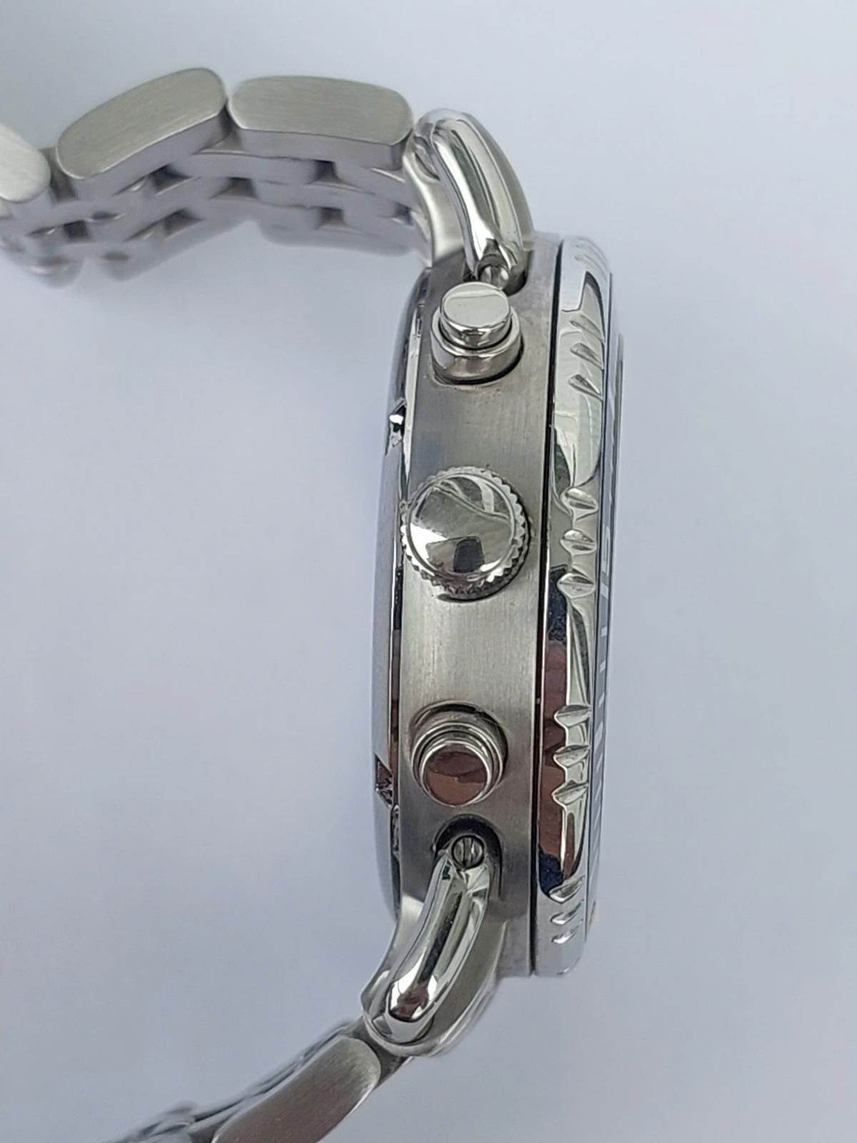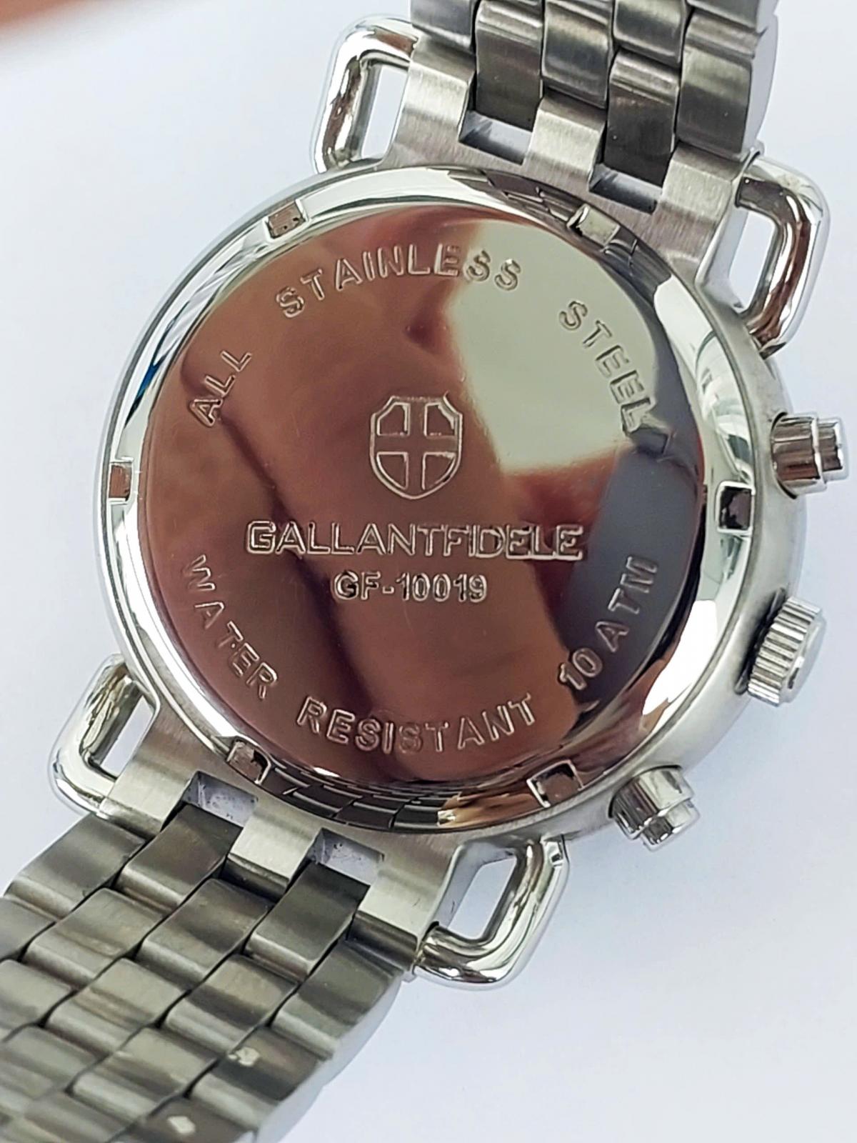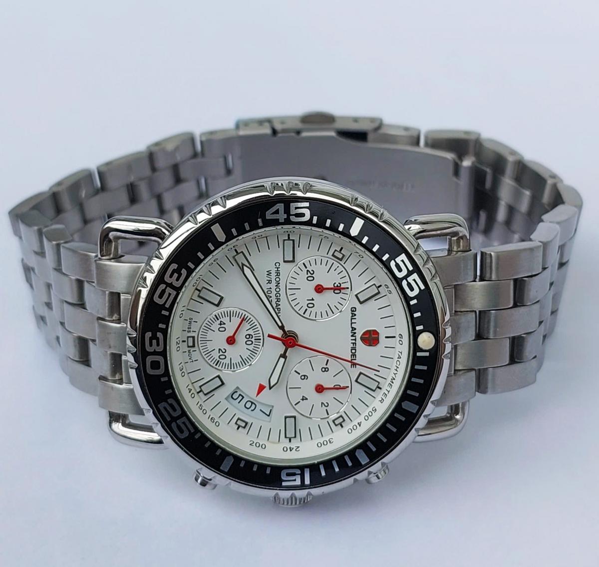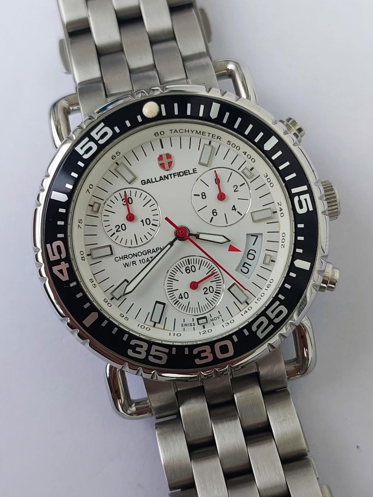 Khám phá vẻ đẹp đầy nam tính và mạnh mẽ của chiếc đồng hồ Gallantfidele , một "chiến binh" thời gian thực thụ dành cho các quý ông yêu thích phong cách thể thao sang trọng, nổi bật với mặt số trắng tinh khôi được bao bọc bởi vòng bezel đen xoay hầm hố tạo nên sự tương phản đầy cuốn hút, kết hợp cùng bộ kim và cọc số phủ dạ quang điểm xuyết sắc đỏ rực rỡ mang lại tinh thần năng động. Không chỉ sở hữu ngoại hình ấn tượng với thiết kế 6 kim 3 cốt Chronograph bấm giờ thể thao chuẩn xác và lịch ngày tiện lợi, case và dây full thép không gỉ đầm chắc giúp khẳng định đẳng cấp phái mạnh. Chính hãng Gallantfidele sx tại Thụy Sỹ, sd máy pin Thụy Sỹ, nguyên bản, size 41mm đẹp keng 98-99%.