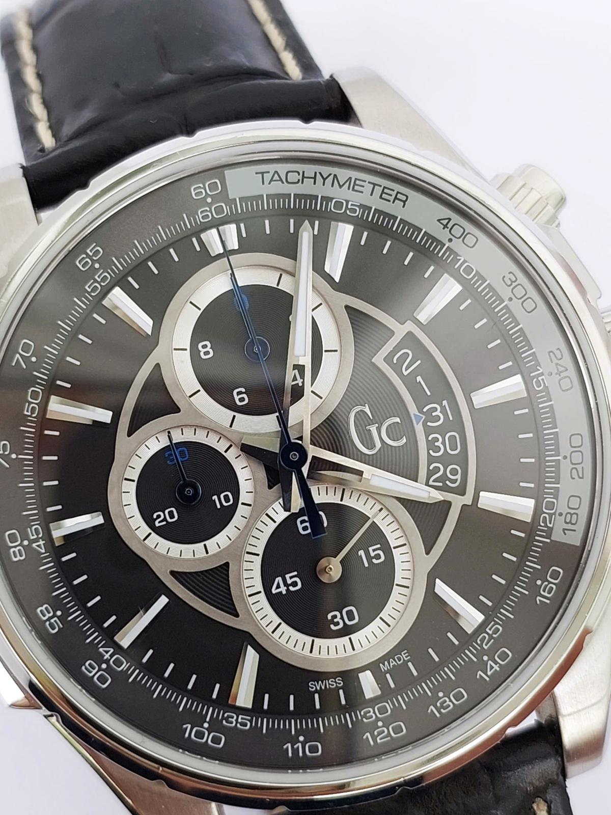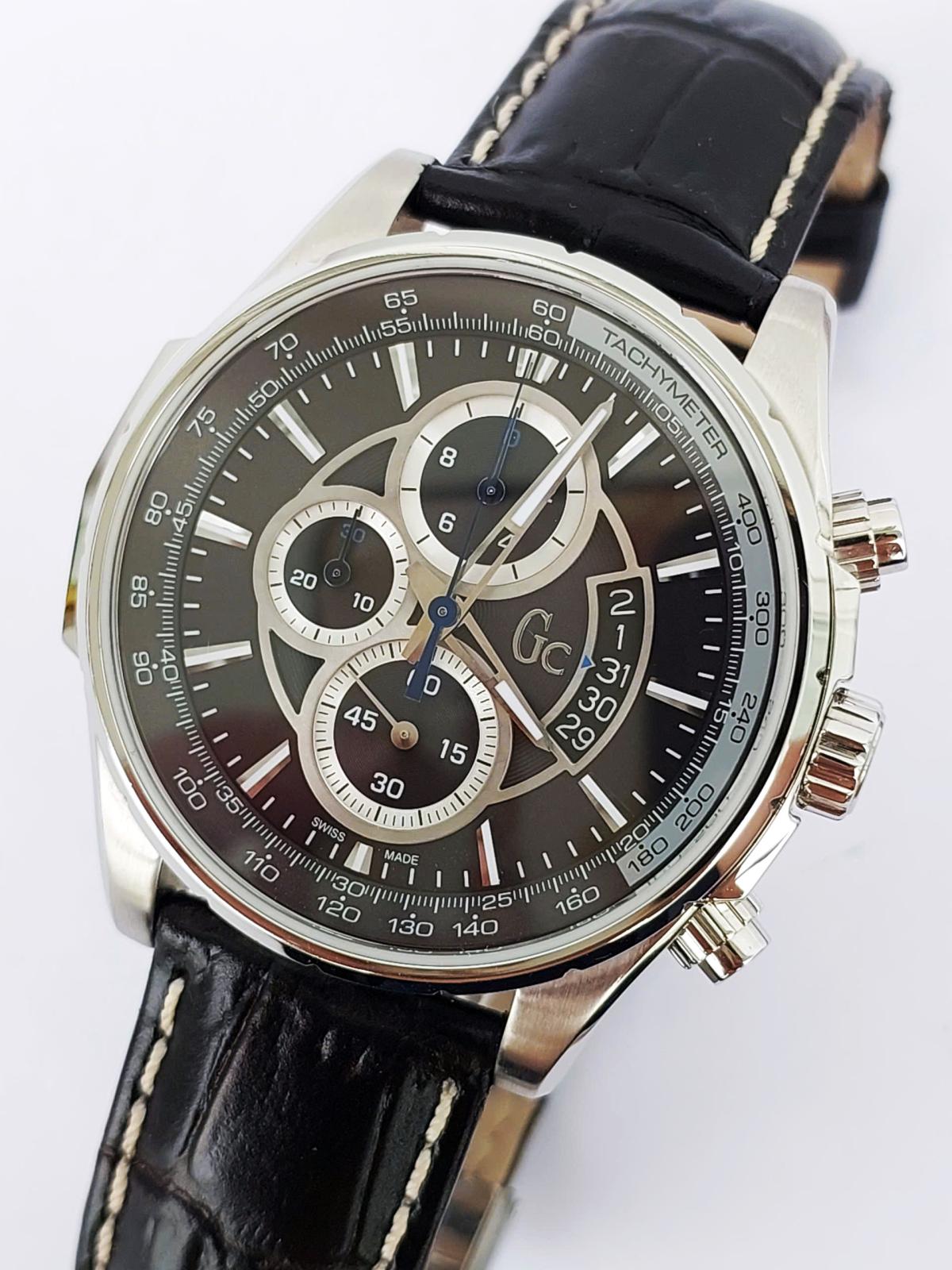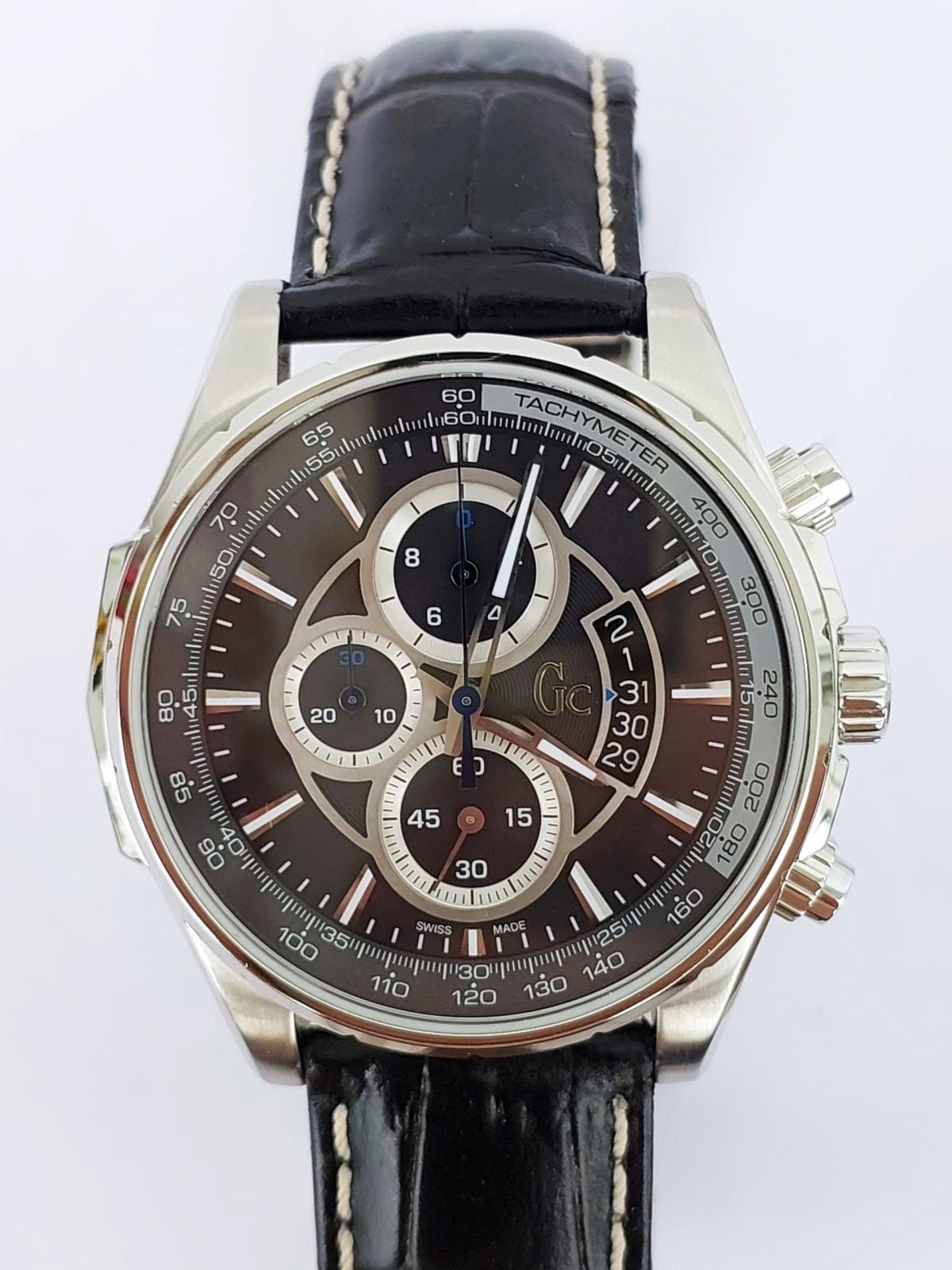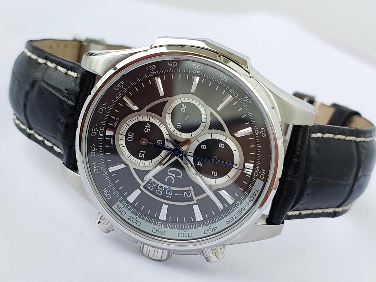 Phân khúc chuẩn Thụy Sỹ, serries cao cấp của Gu.ess GC với thiết kế hội tụ đầy đủ khí chất mạnh mẽ của phái mạnh với điểm nhấn trung tâm là mặt số màu xám khóichải tia sunburst đồng tâm cực kỳ sang trọng và ma mị. Nổi bật trên nền xám thời thượng là thiết kế 6 kim Chronograph thể thao được bố trí cân đối cùng các cọc số nổi khối cứng cáp và ô lịch ngày thiết kế vòng cung đầy phá cách tại góc 4 giờ dưới lớp kính Sapphire trong vắt. Case thép 316L chất lượng cao, chải xước kết hợp góc cạnh đầy nam tính. Khóa và núm chỉnh đính logo thương hiệu sắc xảo. Chính hãng Gu.ess GC sx tại Thụy Sỹ, sd máy pin Thụy Sỹ, nguyên bản dây khóa hãng, size 44mm cho Nam, độ mới tầm 97-98%.