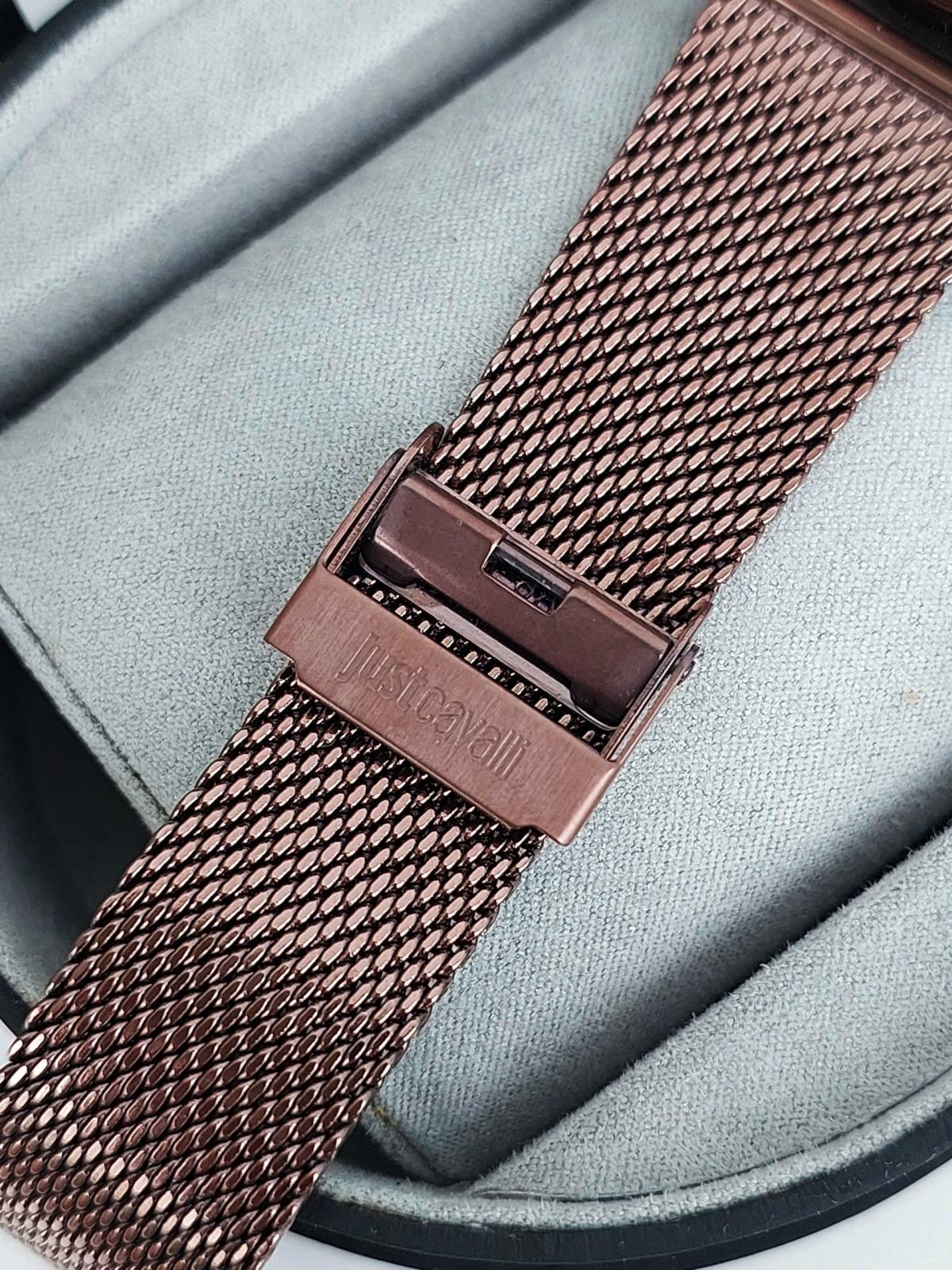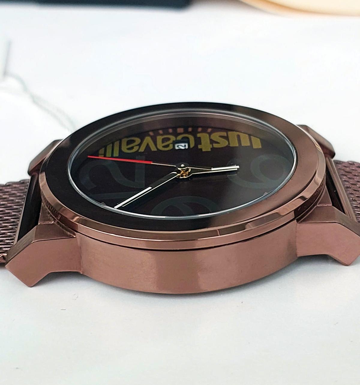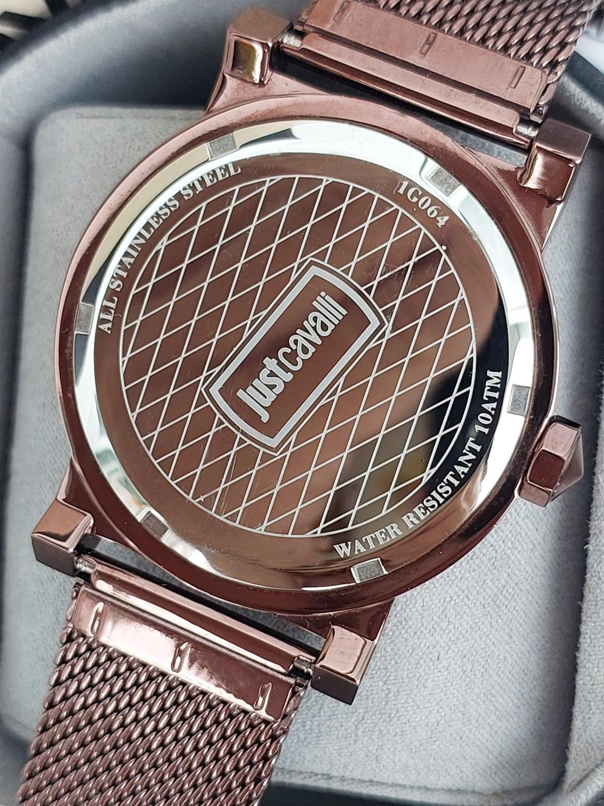 Chiếc đồng hồ nam này mang một phong cách hiện đại và đầy cá tính với mặt số màu nâu trầm ấn tượng. Đặc biệt, thiết kế cách điệu cọc giờ 6-9-12 bản lớn phong cách rất Ý, tên thương hiệu kẻ đứng cá tính, núm vỏ hình trụ , vát cạnh bat giác độc đáo. Mặt kính được phủ một lớp bóng bẩy, kết hợp với dây đeo kim loại lưới màu nâu có tăng đưa tiện lợi, tạo nên một vẻ ngoài sang trọng nhưng không kém phần trẻ trung. Cặp kim giờ và phút được thiết kế tinh tế với màu vàng và đỏ, tạo điểm nhấn nổi bật trên nền màu tối của mặt đồng hồ. Chính hãng J.ust Cavalli Ý, máy pin chuẩn hãng, full hộp, catalog, dây & khóa zin hãng, size 42mm, mới keng 98-99%.