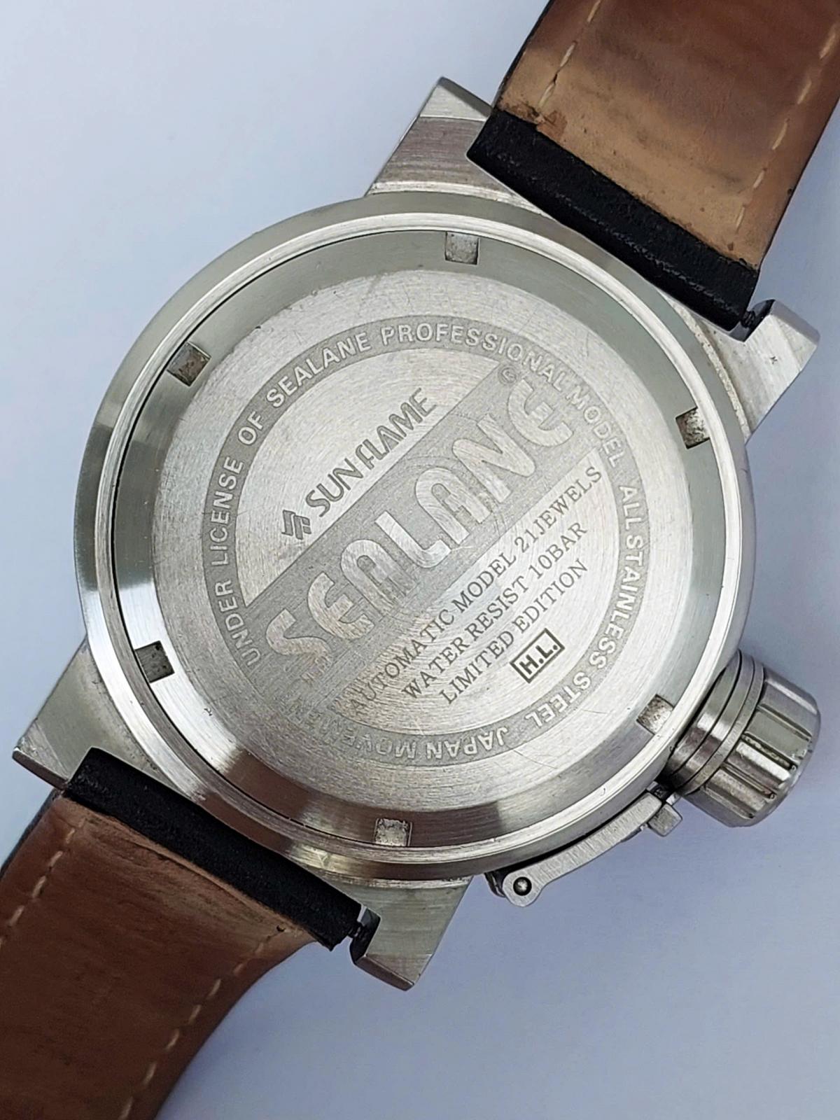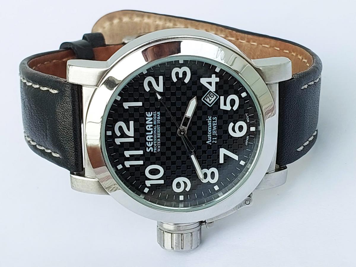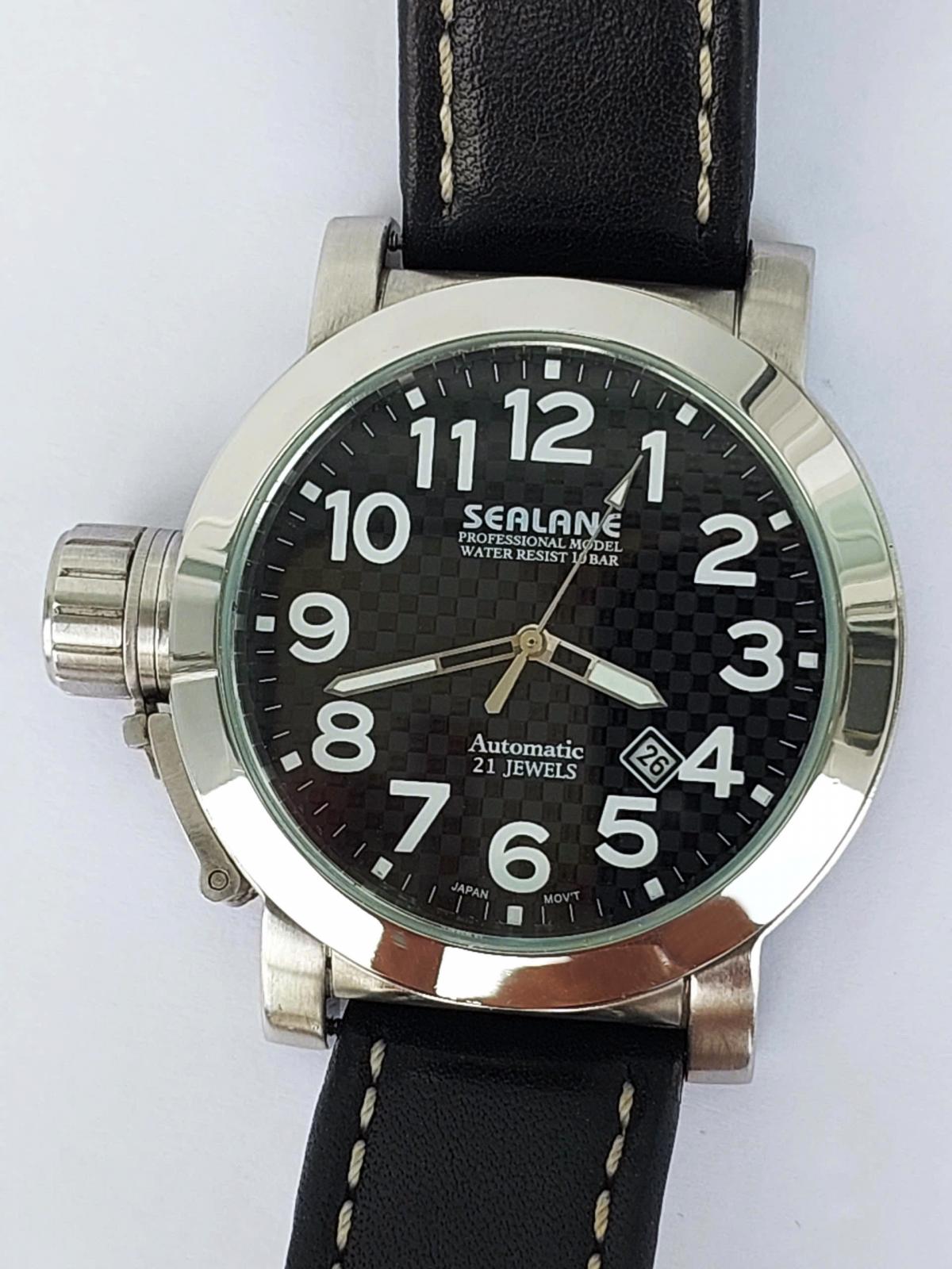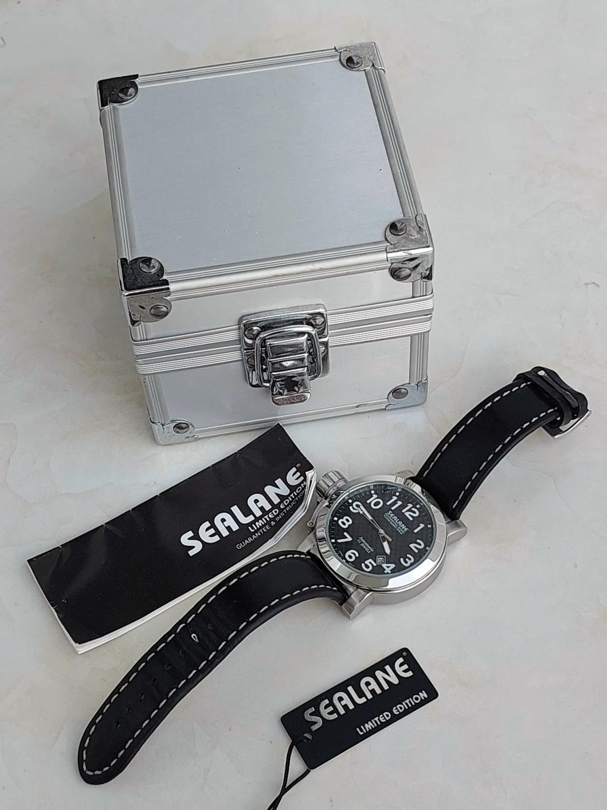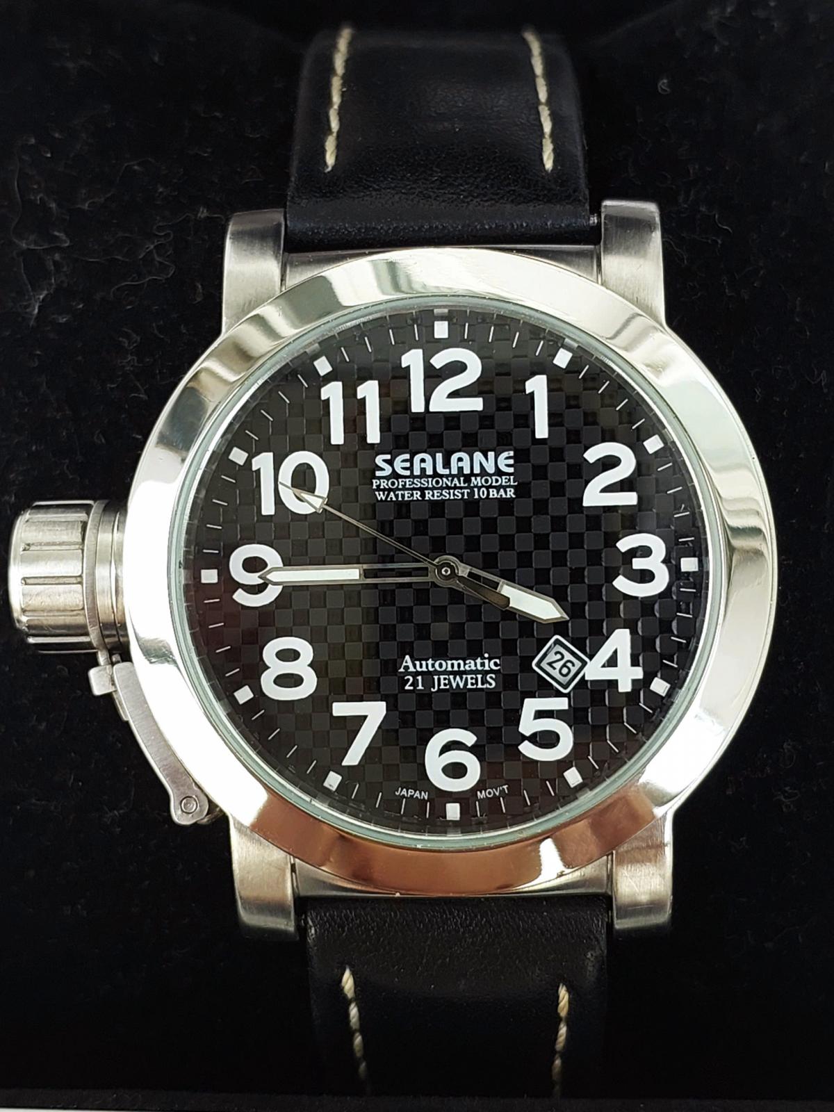 Sealane Professional Model Limited Edition mang phong cách mạnh mẽ quân đội hầm hố khi sở hữu mặt số vân carbon caro đen tuyền tạo chiều sâu hút mắt, làm nền hoàn hảo cho các cọc số Ả Rập to bản và sắc nét giúp hiển thị giờ rõ ràng . Điểm nhấn đắt giá và độc đáo nhất chính là thiết kế núm chỉnh giờ đặt bên trái (destro) được bảo vệ bởi một cơ cấu khung thép vặn cực kỳ gân guốc và chắc chắn, mang lại vẻ ngoài "cơ bắp" khác biệt hoàn toàn so với những mẫu đồng hồ thông thường. Case full thép không gỉ cứng cáp vận hành máy cơ Automatic Nhật Bản 21 chân kính bền bỉ, mượt mà,tất cả được đặt trang trọng trong chiếc hộp nhôm chuyên dụng tạo nên sự khác biệt của một phiên bản giới hạn xứng tầm để khẳng định bản lĩnh phái mạnh. Chính hãng Sealane sx tại Nhật, máy cơ tự động Japan, nguyên bản, size 45mm, độ mới tầm 97%.