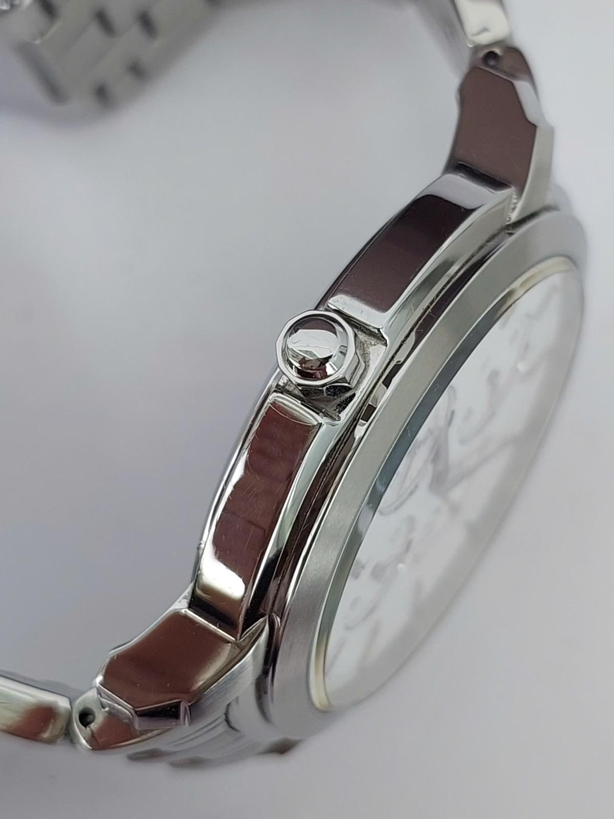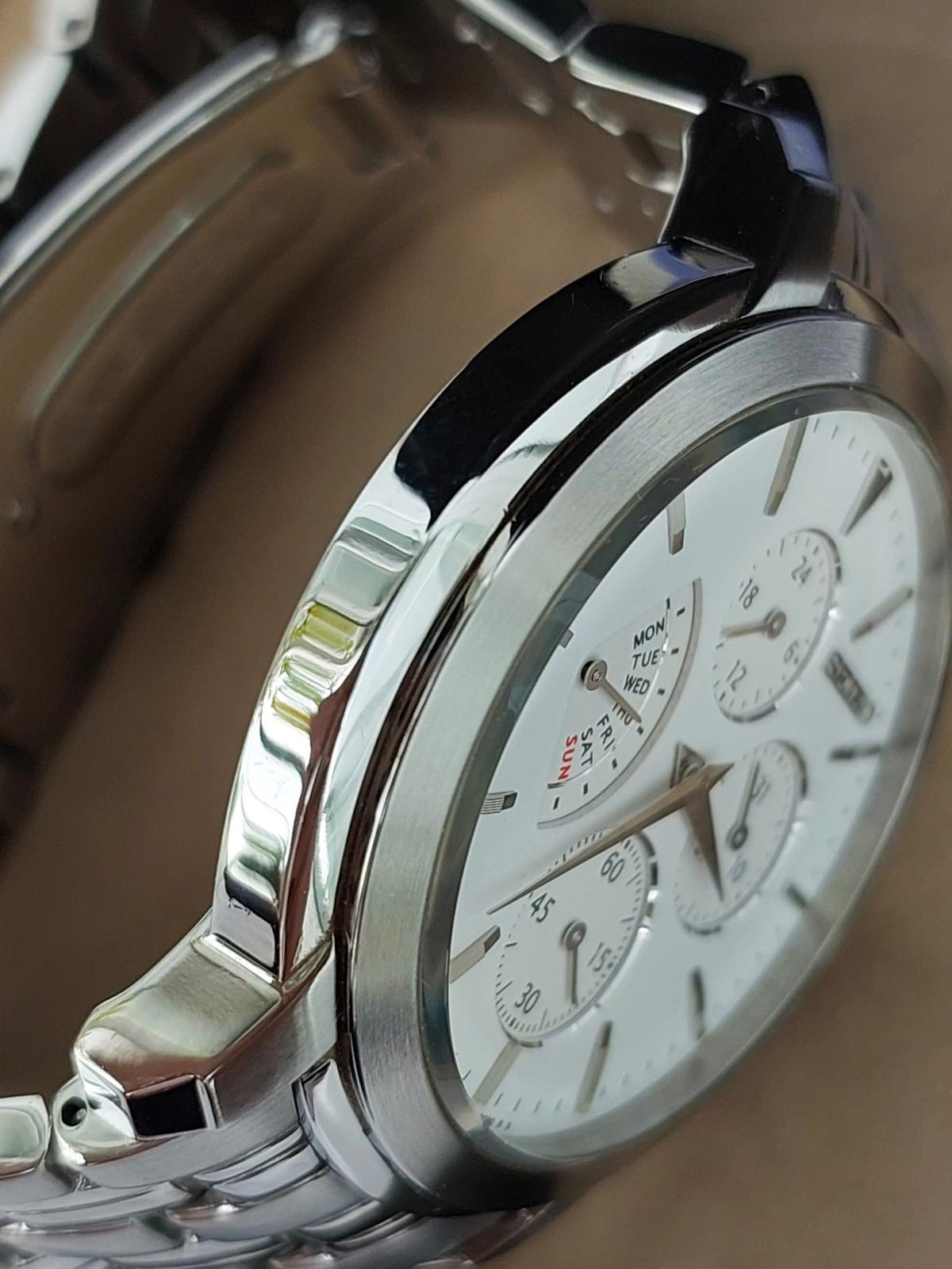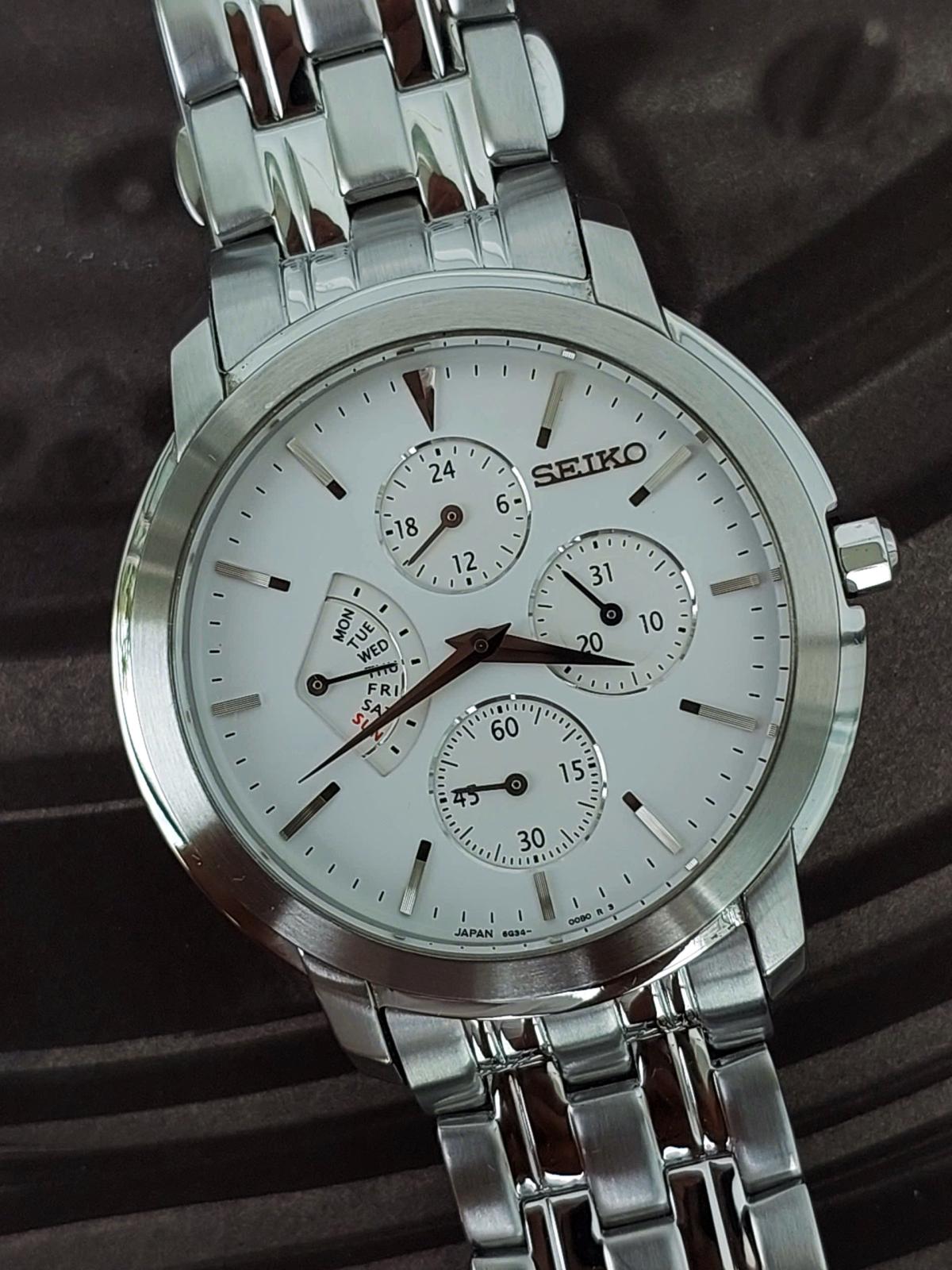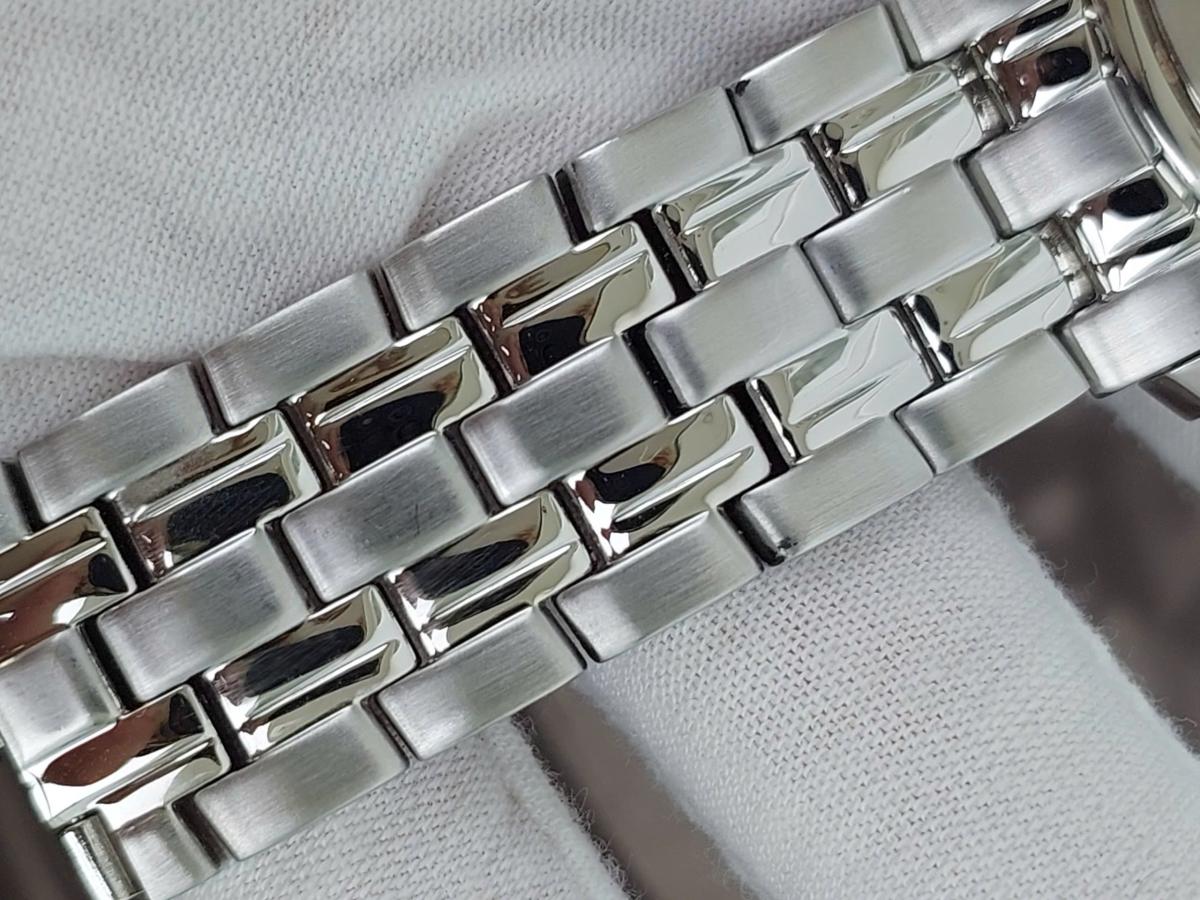 Mẫu đồng hồ nam mang vẻ đẹp thanh lịch, sang trọng với thiết kế hoàn hảo, đầy cuốn hút. Điểm nhấn độc đáo nvới mặt số phụ hiển thị lịch thứ dạng cánh quạt lạ mắt, tạo nên nét chấm phá tinh tế giữa nền mặt trắng ko tì vết. Ba mặt số phụ còn lại bao gồm kim dâym lịch ngày và giờ GMT gđược bố trí hài hòa, cân đối – vừa đảm bảo tính tiện dụng, vừa tôn lên vẻ hiện đại, lịch lãm. Bộ kim thép và cọc số thanh mảnh, sắc nét, cùng bộ vỏ, dây thép không gỉ sáng bóng chất lượng cao bền mãi với thời gian. Chính hãng Seik0, sx nộiđịa Nhật, sd máy Pin Japan, full hộp, sổ, size 40mm cho Nam. Độ mới tầm 98%.