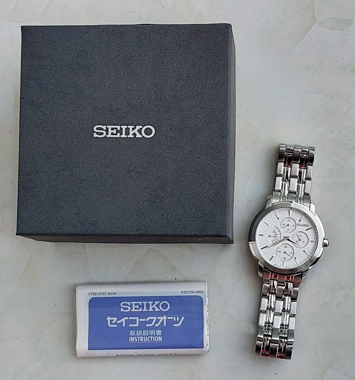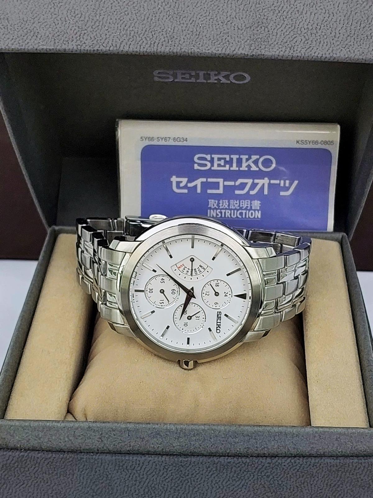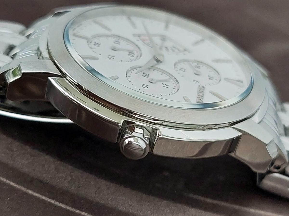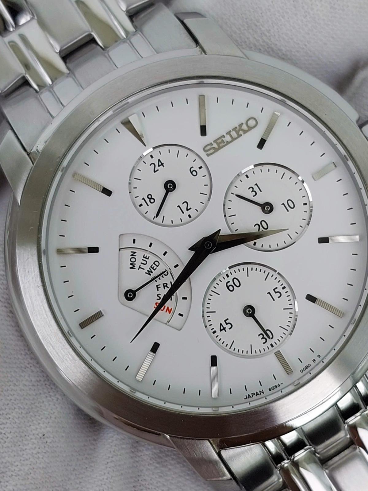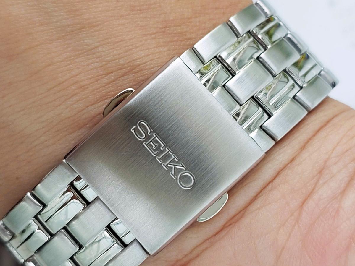 Mẫu đồng hồ nam mang vẻ đẹp thanh lịch, sang trọng với thiết kế hoàn hảo, đầy cuốn hút. Điểm nhấn độc đáo nvới mặt số phụ hiển thị lịch thứ dạng cánh quạt lạ mắt, tạo nên nét chấm phá tinh tế giữa nền mặt trắng ko tì vết. Ba mặt số phụ còn lại bao gồm kim dâym lịch ngày và giờ GMT gđược bố trí hài hòa, cân đối – vừa đảm bảo tính tiện dụng, vừa tôn lên vẻ hiện đại, lịch lãm. Bộ kim thép và cọc số thanh mảnh, sắc nét, cùng bộ vỏ, dây thép không gỉ sáng bóng chất lượng cao bền mãi với thời gian. Chính hãng Seik0, sx nộiđịa Nhật, sd máy Pin Japan, full hộp, sổ, size 40mm cho Nam. Độ mới tầm 98%.