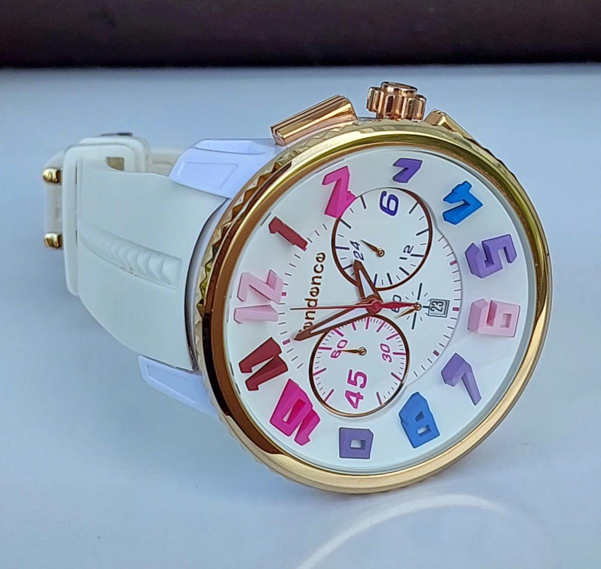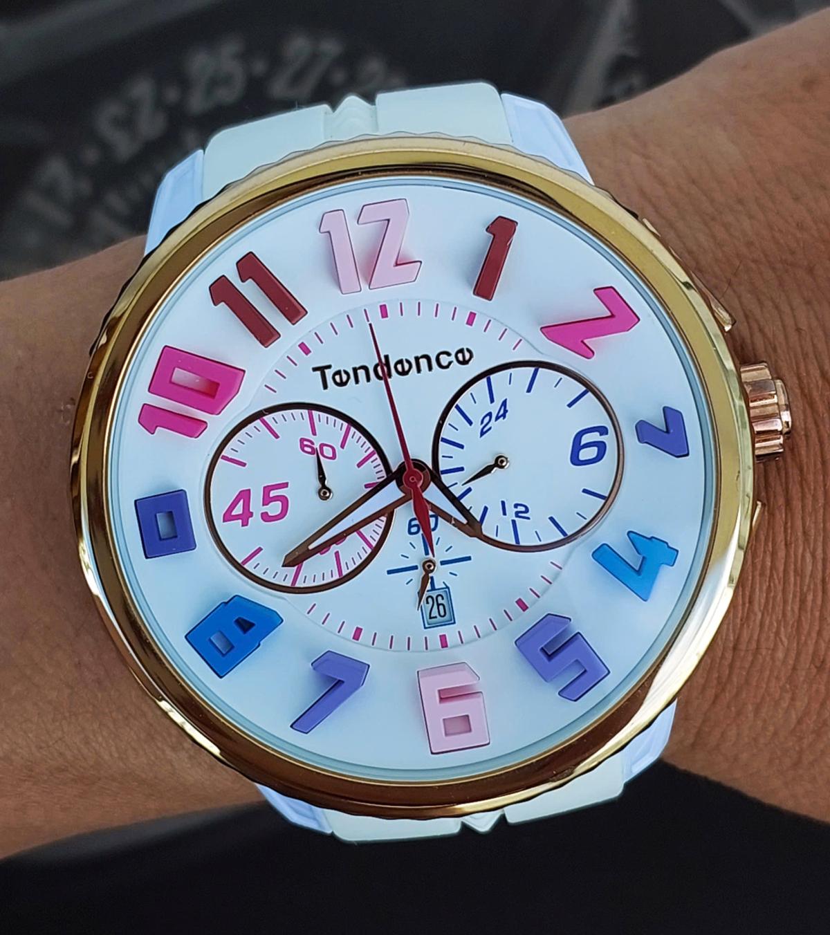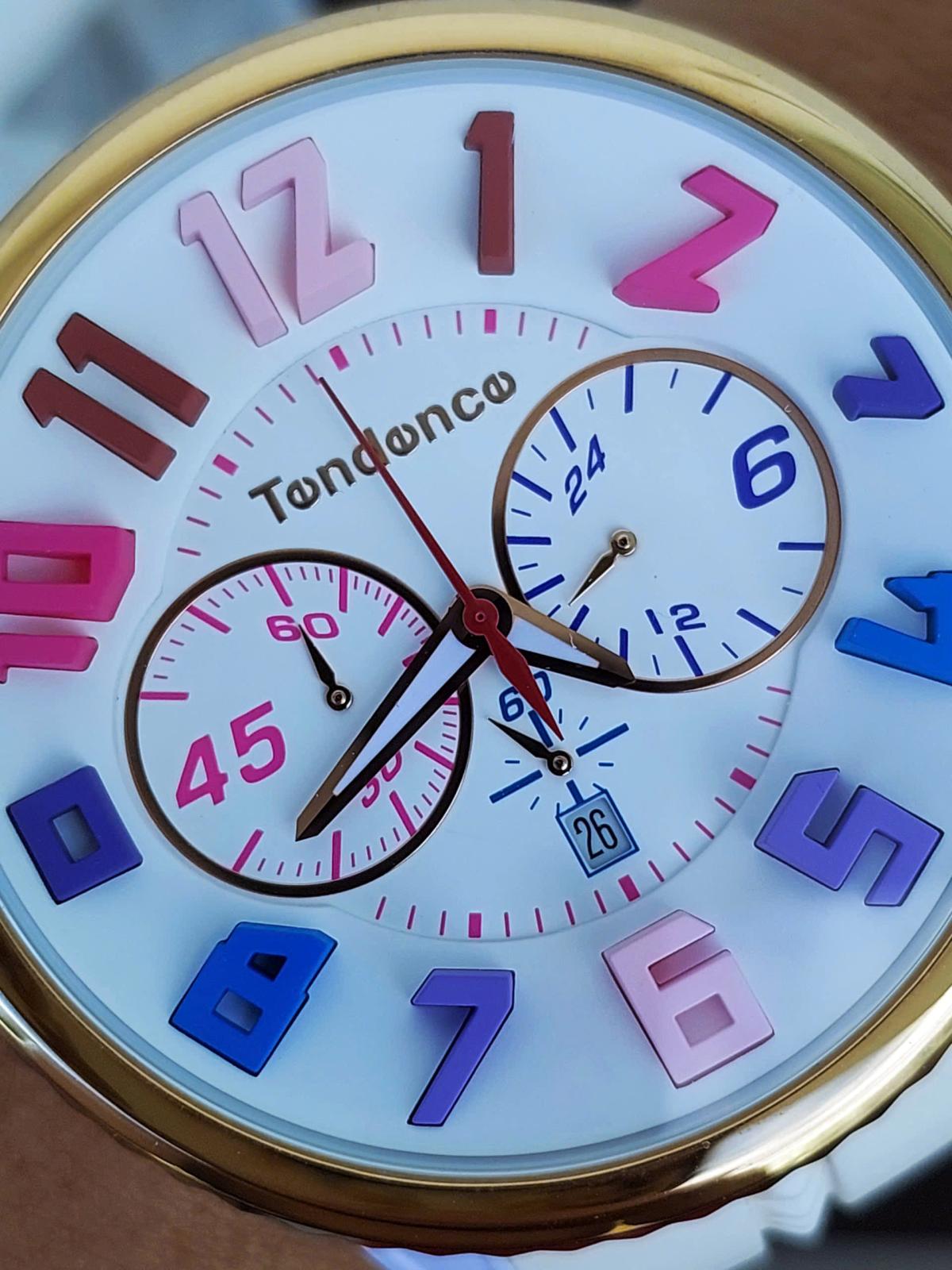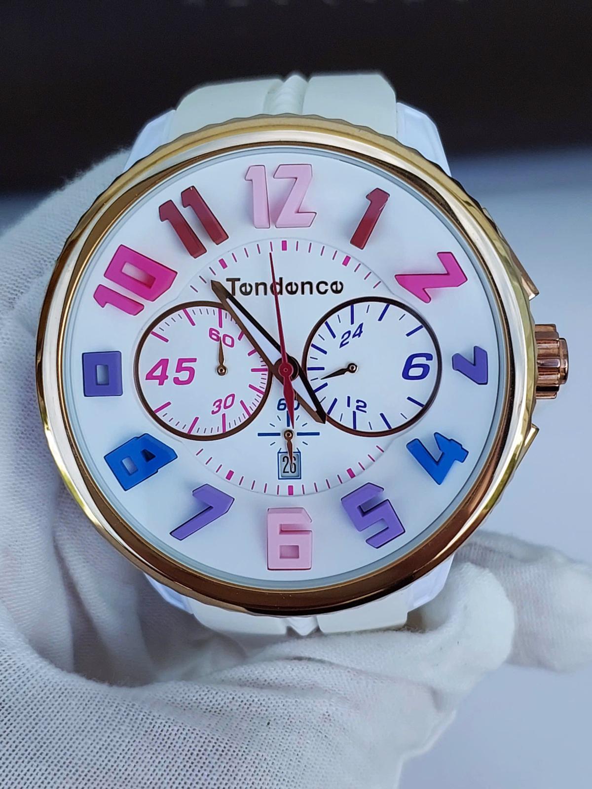 Mang tên "Cầu Vồng" thuộc series nổi bật của thương hiệu Tendence Nhật Bản là một lựa chọn tuyệt vời cho những ai yêu thích phong cách trẻ trung, năng động và thời thượng. Mặt đồng hồ tròn với thiết kế vạch số lớn phong cách 3D độc đáo và đầy màu sắc pastel, bao gồm các gam màu đẹp mắt tạo nên sự tương phản nổi bật và dễ dàng theo dõi thời gian. Thiết kế khá to nhưng với chất liệu polycarbonate cao cấp mang đến cảm giác nhẹ nhàng nhưng vẫn đảm bảo sự bền bỉ và chắc chắn cho sản phẩm. Các mặt đồng hồ phụ được thiết kế rõ ràng, có chức năng chrono, giờ GMT giúp người dùng dễ dàng theo dõi thời gian một cách tiện lợi. Với thiết kế sắc nét và hiện đại, đồng hồ "Cầu Vồng" sẽ là lựa chọn hoàn hảo cho những ai muốn thể hiện cá tính và phong cách sống năng động. ĐH Sx tại Japan, sd máy pin Japan, full hộp, khăn, nguyên bản dây khóa hãng, size 50mm khá to cho Nam hoặc Nữ có size tay phù hợp. Độ mới tàm 97%