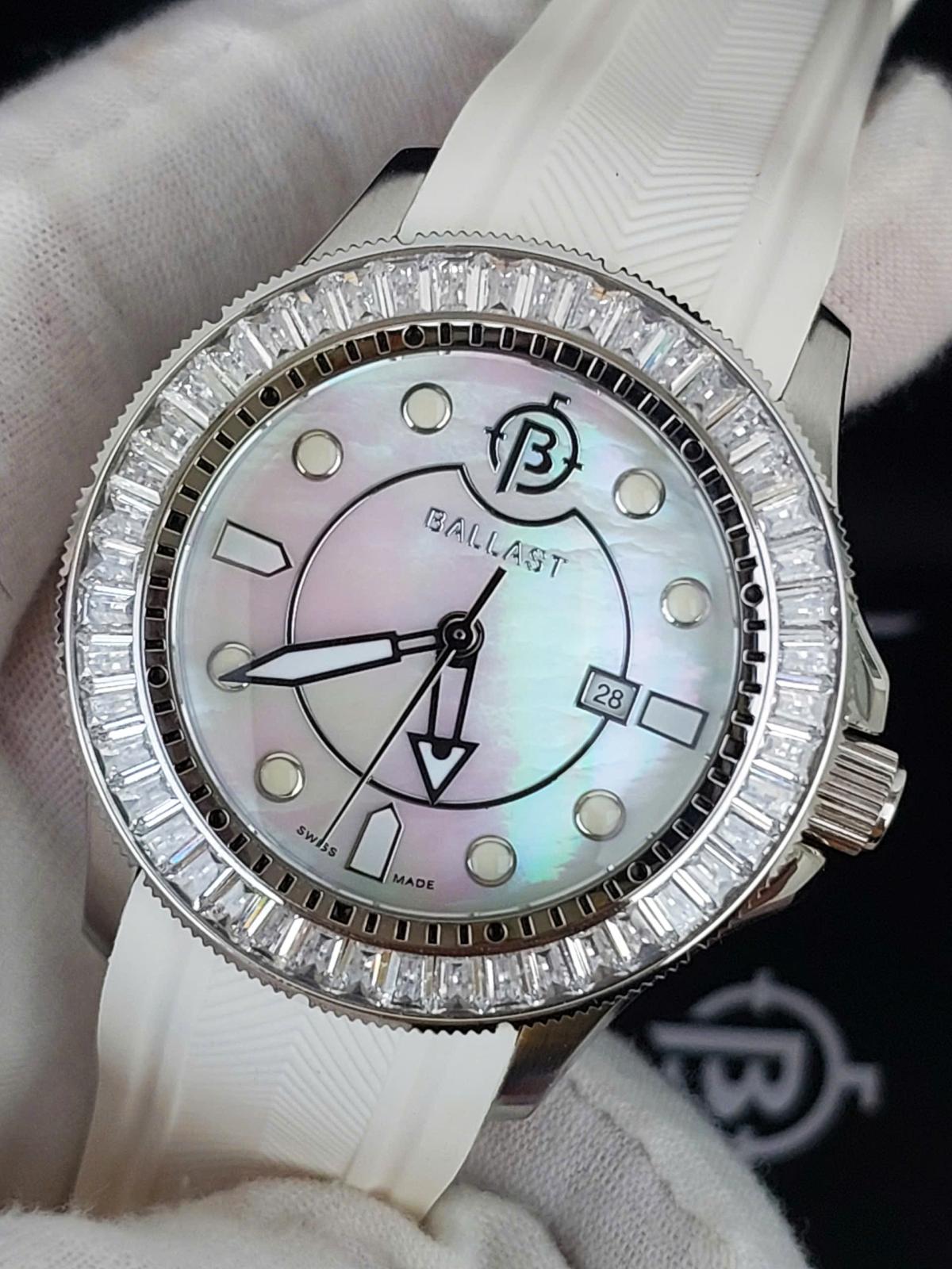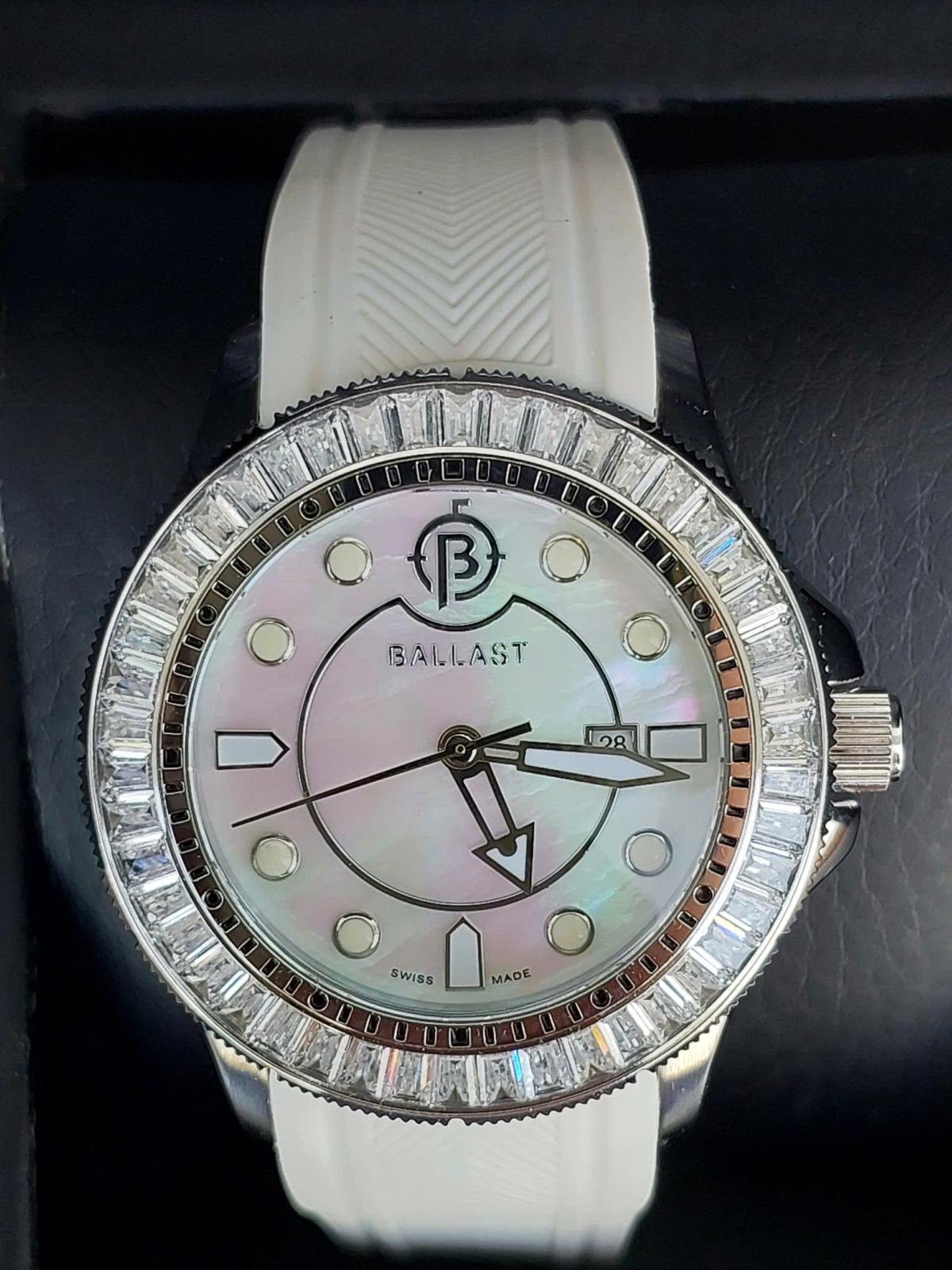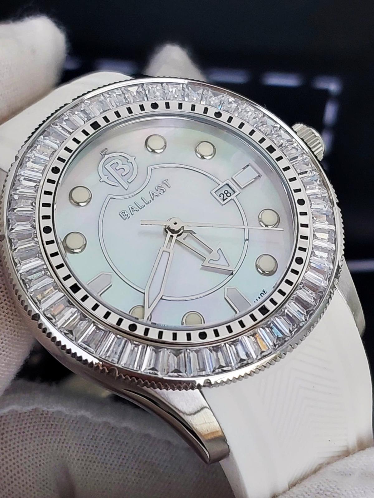 Mẫu nữ Ballast này mang sự giao thoa giữa nét thể thao khỏe khoắn và vẻ đẹp kiêu sa lộng lẫy, nổi bật ngay từ cái nhìn đầu tiên là phần niềng bezel được nạm kín những viên đá pha lê cắt dáng baguette sang trọng tạo nên hiệu ứng bắt sáng lấp lánh mê hoặc theo từng cử động của cổ tay. Ẩn dưới lớp kính là mặt số khảm xà cừ ) thiên nhiên phản chiếu ánh ngũ sắc huyền ảo đầy nữ tính, làm nền cho các cọc số chấm tròn và bộ kim phủ dạ quang to bản giúp việc xem giờ trở nên dễ dàng và thu hút hơn bao giờ hết. Sự tinh tế còn được thể hiện qua ô lịch ngày tiện dụng đặt tại góc 3 giờ cùng bộ dây đeo cao su cao cấp màu trắng tinh khôi với họa tiết vân xương cá độc đáo, không chỉ mang lại cảm giác êm ái, ôm tay tuyệt đối. Chính hãng Ballast sx tại Thụy Sỹ, sd máy Pin Thụy Sỹ, full hộp thẻ, nguyên bản size 37mm cho nữ, độ mới cao tầm 98%.