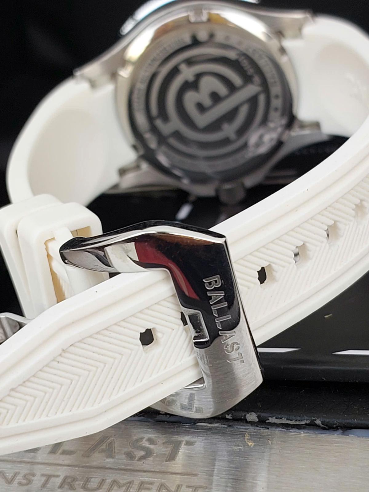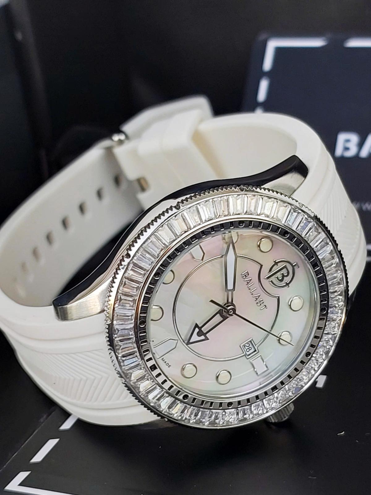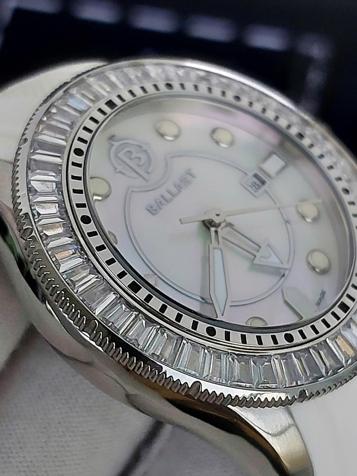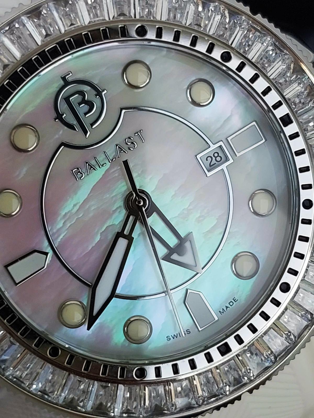 Mẫu nữ Ballast này mang sự giao thoa giữa nét thể thao khỏe khoắn và vẻ đẹp kiêu sa lộng lẫy, nổi bật ngay từ cái nhìn đầu tiên là phần niềng bezel được nạm kín những viên đá pha lê cắt dáng baguette sang trọng tạo nên hiệu ứng bắt sáng lấp lánh mê hoặc theo từng cử động của cổ tay. Ẩn dưới lớp kính là mặt số khảm xà cừ ) thiên nhiên phản chiếu ánh ngũ sắc huyền ảo đầy nữ tính, làm nền cho các cọc số chấm tròn và bộ kim phủ dạ quang to bản giúp việc xem giờ trở nên dễ dàng và thu hút hơn bao giờ hết. Sự tinh tế còn được thể hiện qua ô lịch ngày tiện dụng đặt tại góc 3 giờ cùng bộ dây đeo cao su cao cấp màu trắng tinh khôi với họa tiết vân xương cá độc đáo, không chỉ mang lại cảm giác êm ái, ôm tay tuyệt đối. Chính hãng Ballast sx tại Thụy Sỹ, sd máy Pin Thụy Sỹ, full hộp thẻ, nguyên bản size 37mm cho nữ, độ mới cao tầm 98%.
