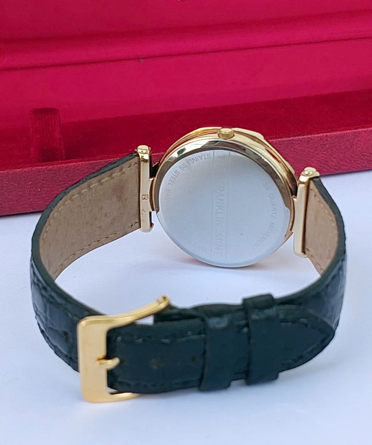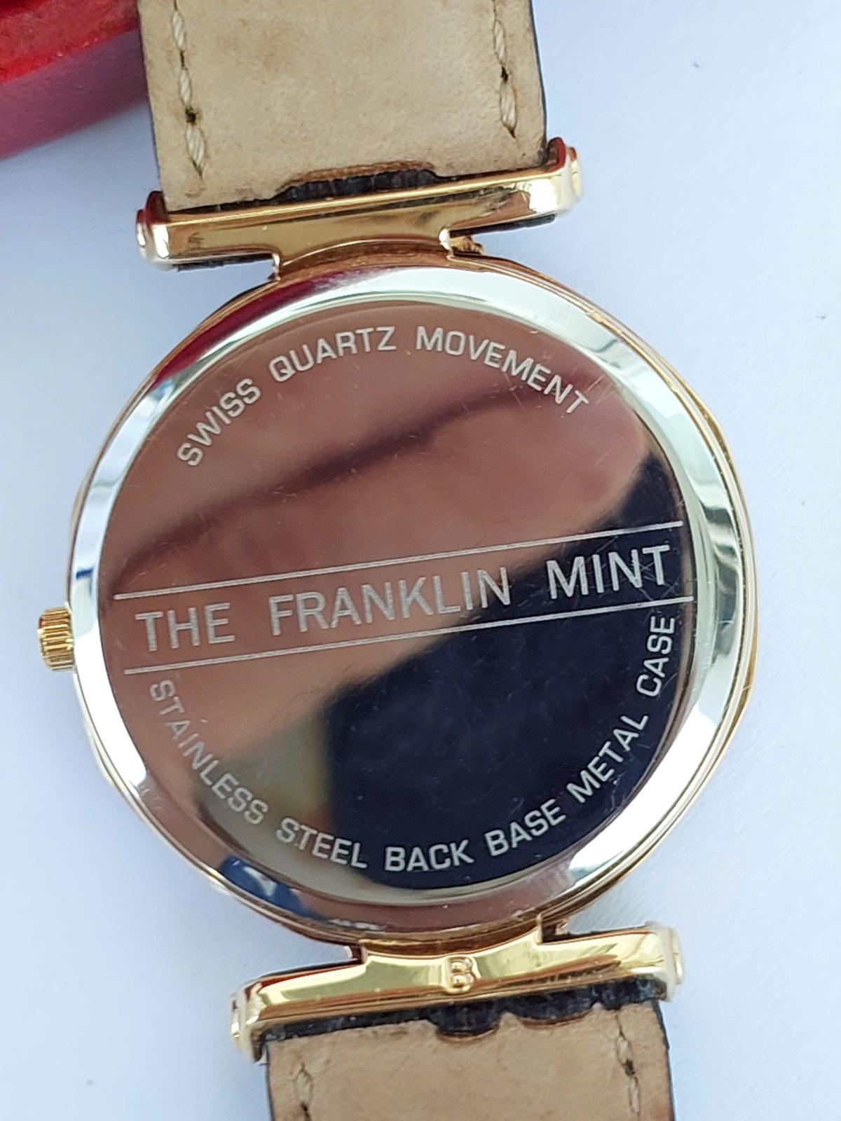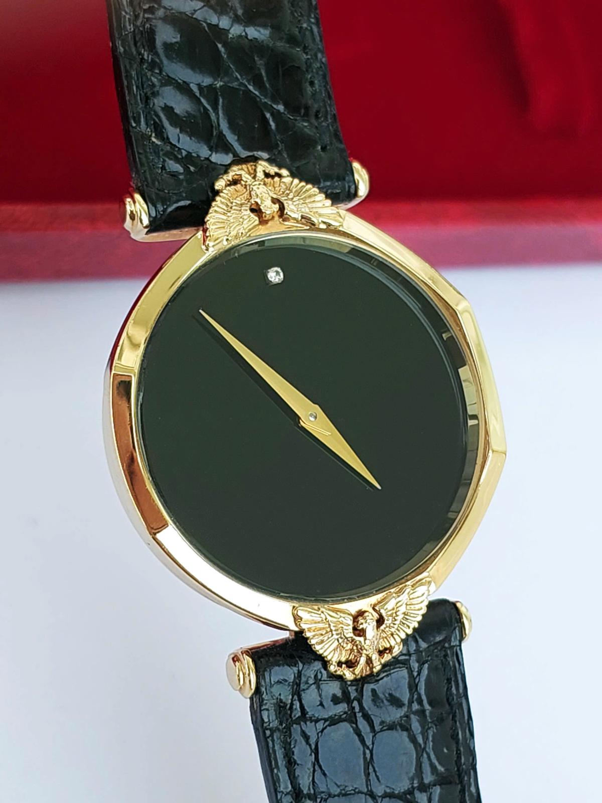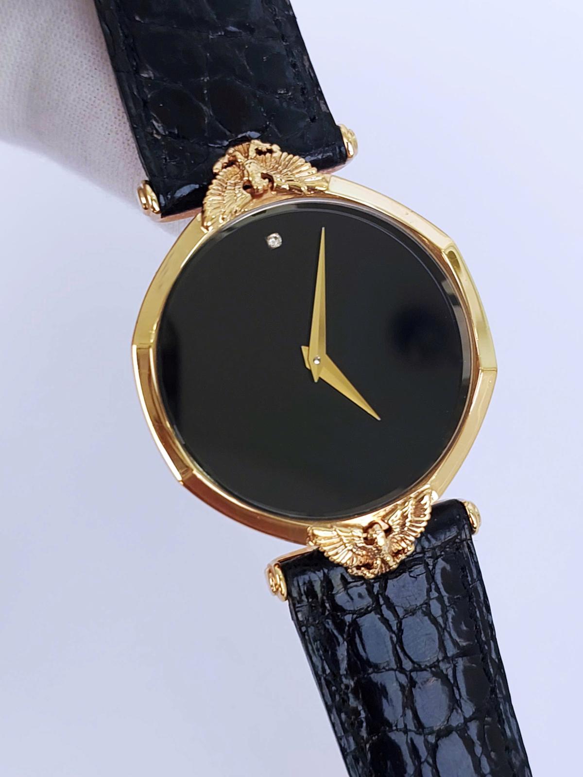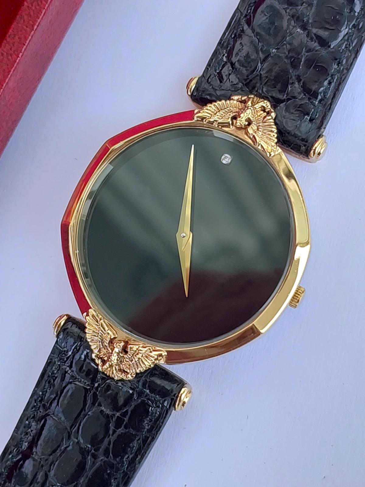 Mẫu nữ độc đáo đến từ The Franklin Mint Eagle như một tác phẩm nghệ thuật điêu khắc trên cổ tay, nổi bật với cặp càng nối dây hình đại bàng tung cánh được đúc hoàn toàn từ vàng 10k sắc sảo đến từng lớp lông vũ, mang ý nghĩa phong thủy về sự tự do và thịnh vượng. Vẻ đẹp quyền uy của chúa tể bầu trời hòa quyện tuyệt đối với mặt số đen tuyền huyền bí mang phong cách Museum tối giản, nơi sự sang trọng được định nghĩa bằng bộ kim vát cạnh sáng bóng cùng viên đá quý lấp lánh tạo nên độ tương phản Black & Gold mê hoặc. Chính hãng Franklin Mint sx tại Thụy Sỹ, sd máy pin Thụy Sỹ, nguyên bản, size 33mm cho Nữ, độ mới tàm 97-98%.