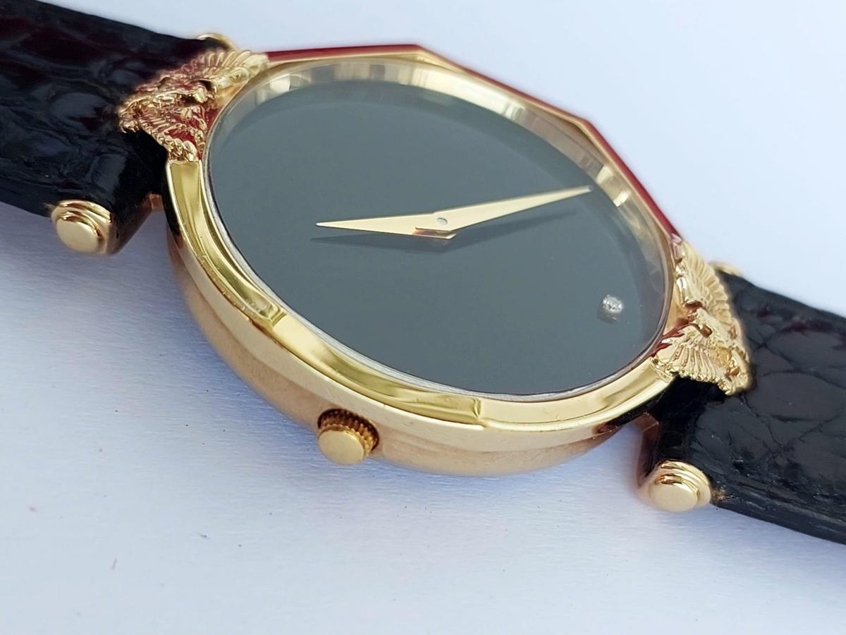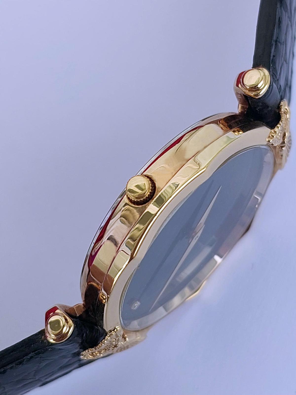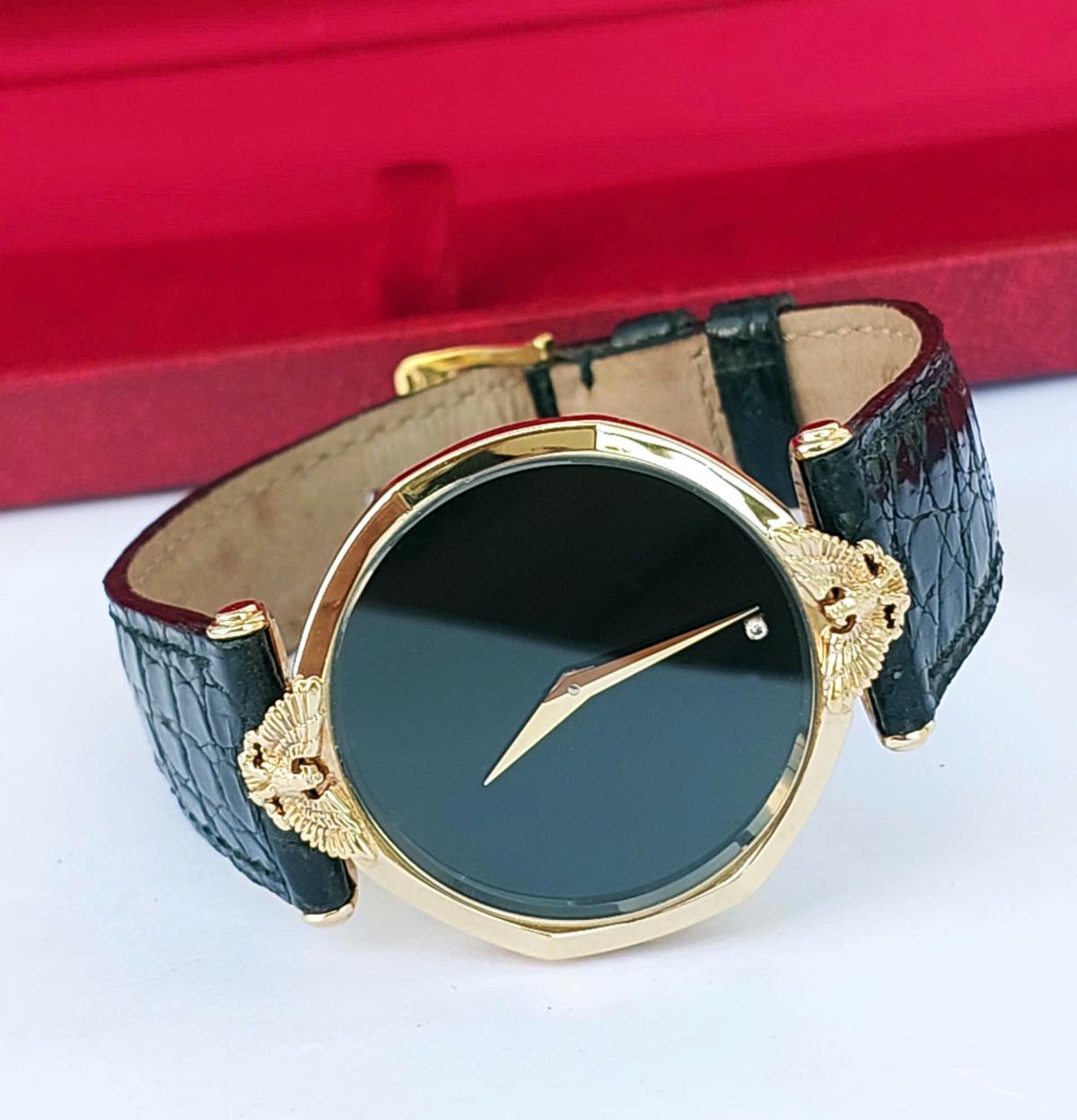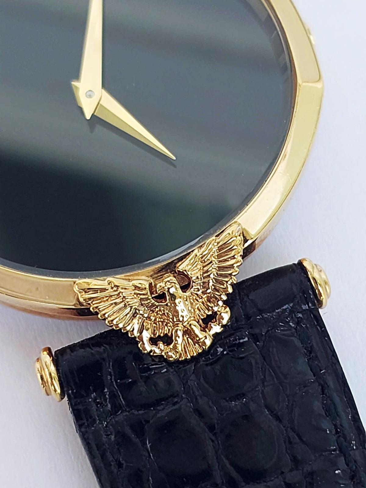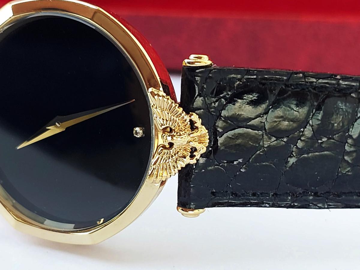 Mẫu nữ độc đáo đến từ The Franklin Mint Eagle như một tác phẩm nghệ thuật điêu khắc trên cổ tay, nổi bật với cặp càng nối dây hình đại bàng tung cánh được đúc hoàn toàn từ vàng 10k sắc sảo đến từng lớp lông vũ, mang ý nghĩa phong thủy về sự tự do và thịnh vượng. Vẻ đẹp quyền uy của chúa tể bầu trời hòa quyện tuyệt đối với mặt số đen tuyền huyền bí mang phong cách Museum tối giản, nơi sự sang trọng được định nghĩa bằng bộ kim vát cạnh sáng bóng cùng viên đá quý lấp lánh tạo nên độ tương phản Black & Gold mê hoặc. Chính hãng Franklin Mint sx tại Thụy Sỹ, sd máy pin Thụy Sỹ, nguyên bản, size 33mm cho Nữ, độ mới tàm 97-98%.