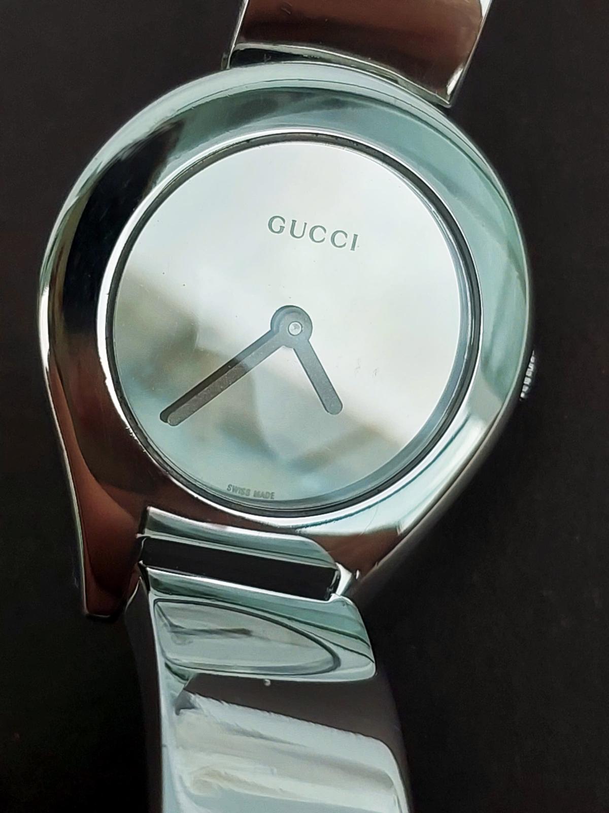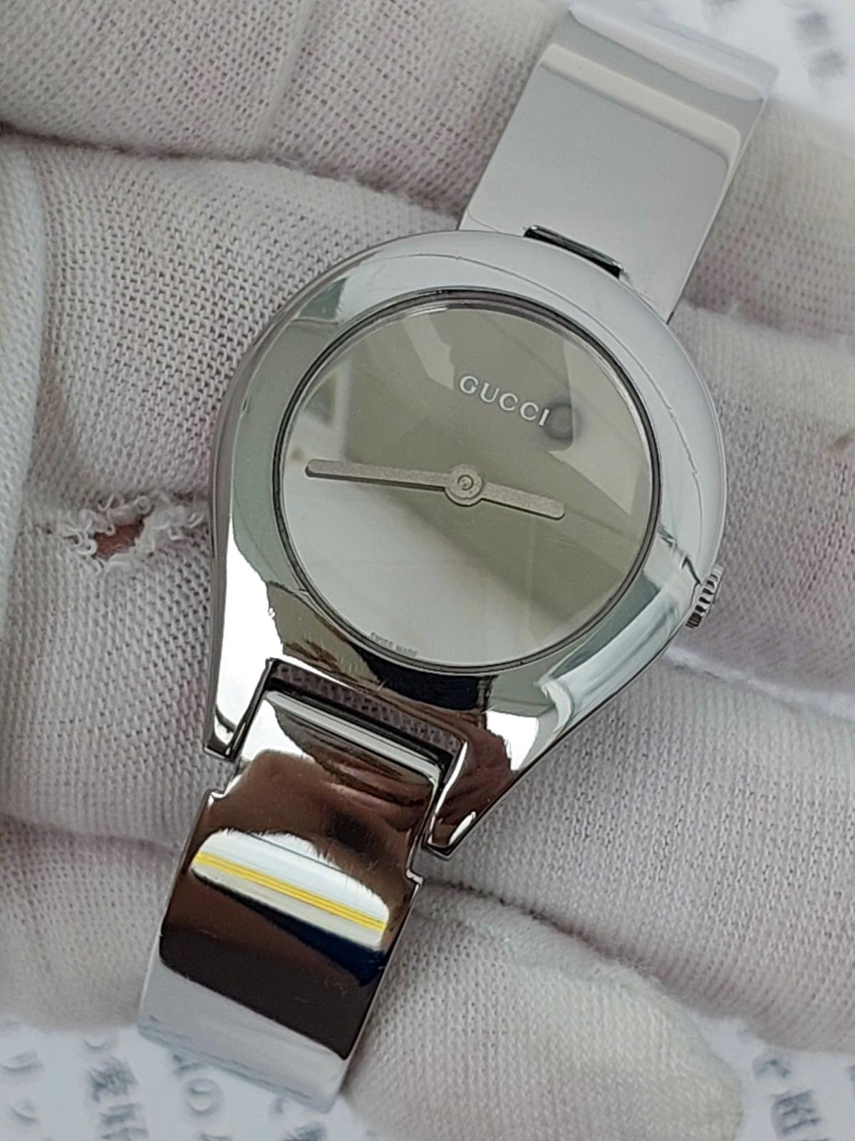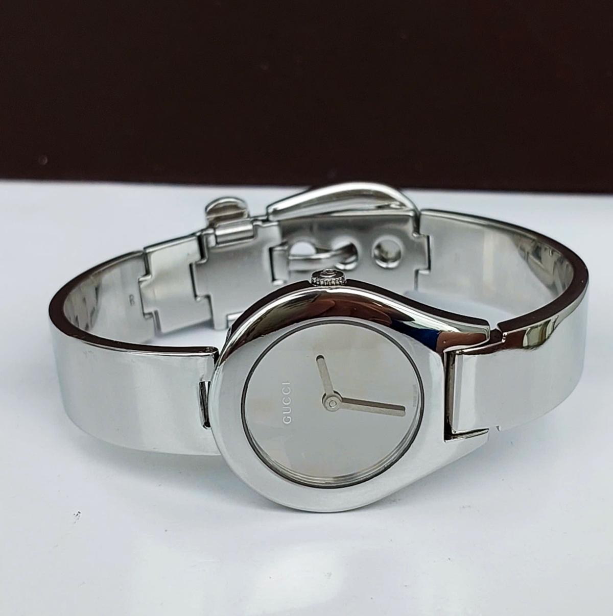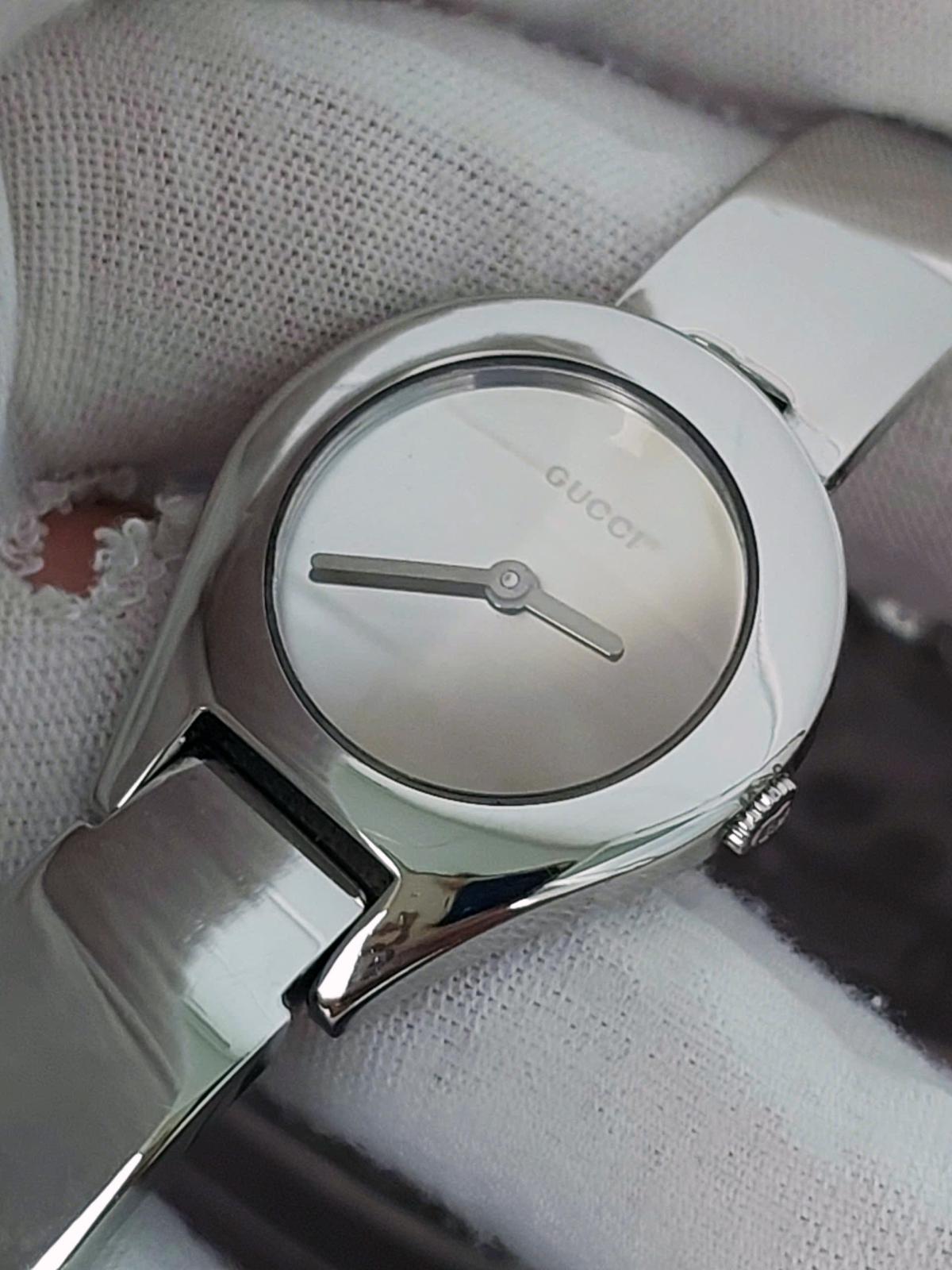 Mẫu nữ Gu.cci mang đậm phong cách thời trang cao cấp đến từ nước Ý, với thiết kế mặt số nhỏ nhắn, phom giọt nước mềm mại, tôn lên sự dịu dàng và quý phái. Dây kim loại sáng bóng dạng lắc tay cực kỳ nữ tính và sang trọng và có dạng gài như dây da bởi 1 thiết kế thông minh, tiện lợi. Nền mặt tráng gương độc đáo, kim chỉ giờ và logo Gu.cci sắc sảo. Một mẫu nữ tuyệt hảo giúp tôn lên cổ tay của phái đẹp một cách đầy tinh tế, phù hợp cho cả đi tiệc, công sở hay dạo phố. Chính hãng Gu.cci sx tại Thụy Sỹ, sd máy Pin Thụy Sỹ, nguyên bản size 26mm, độ mới tầm 97-98%.