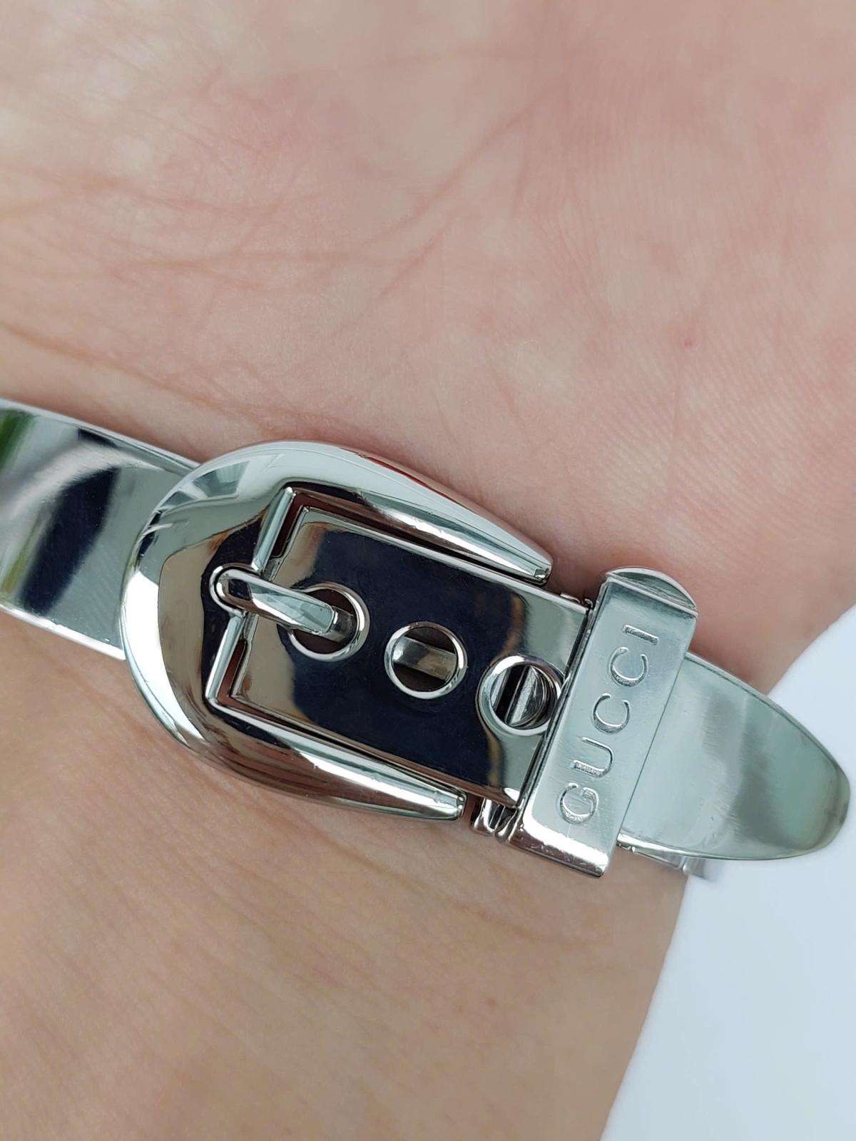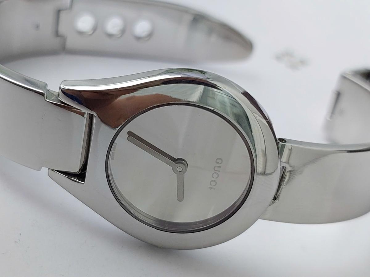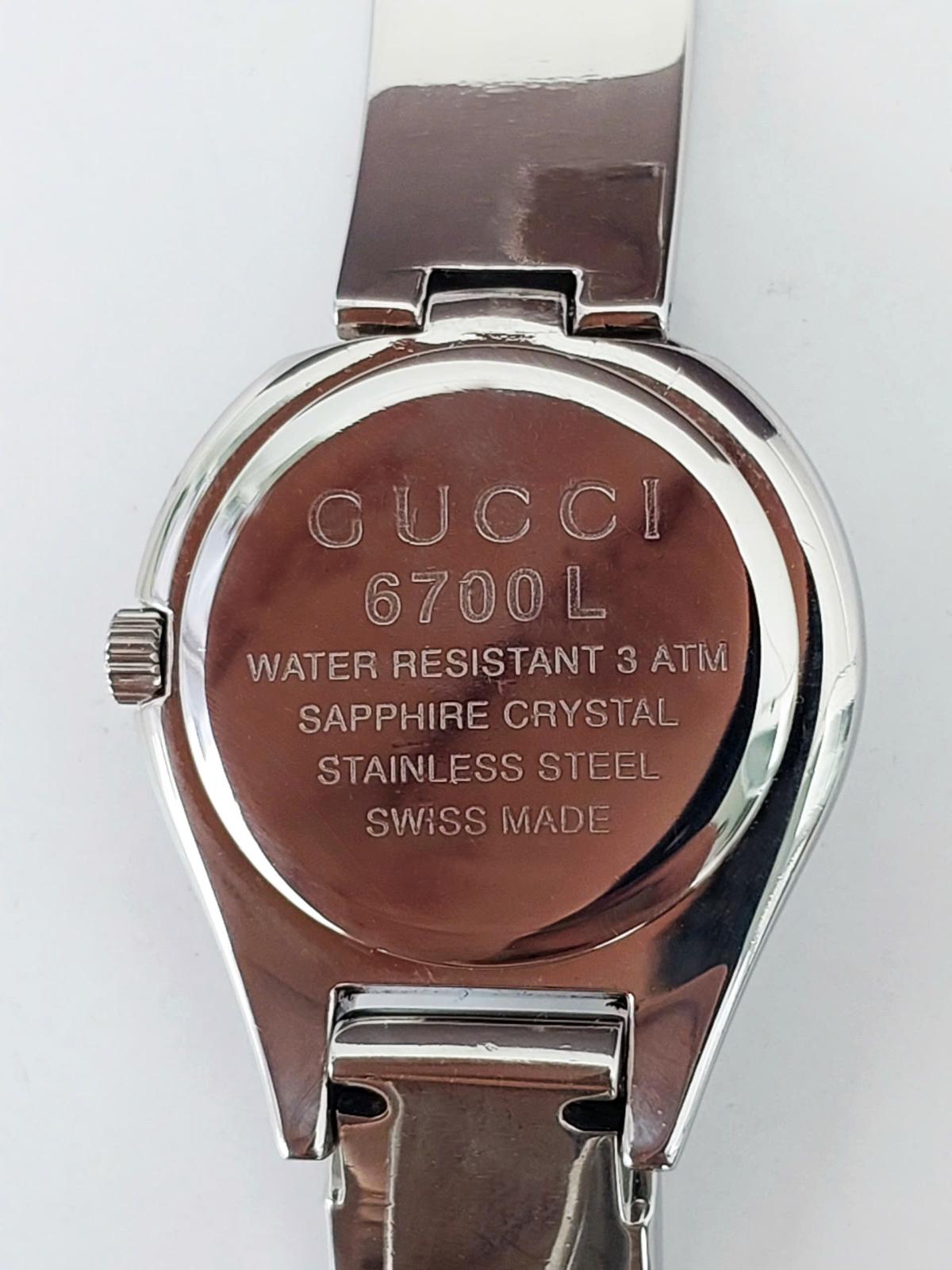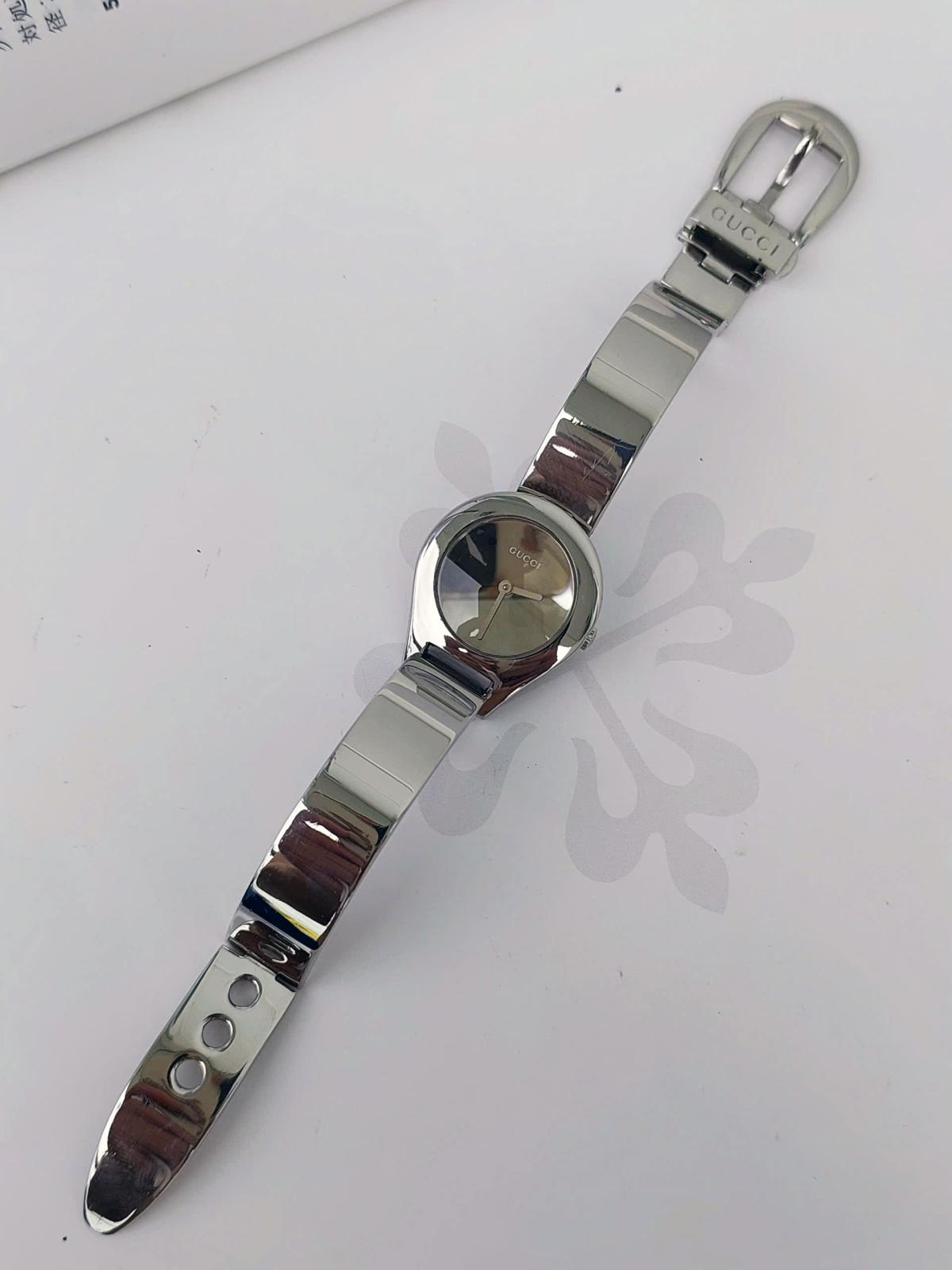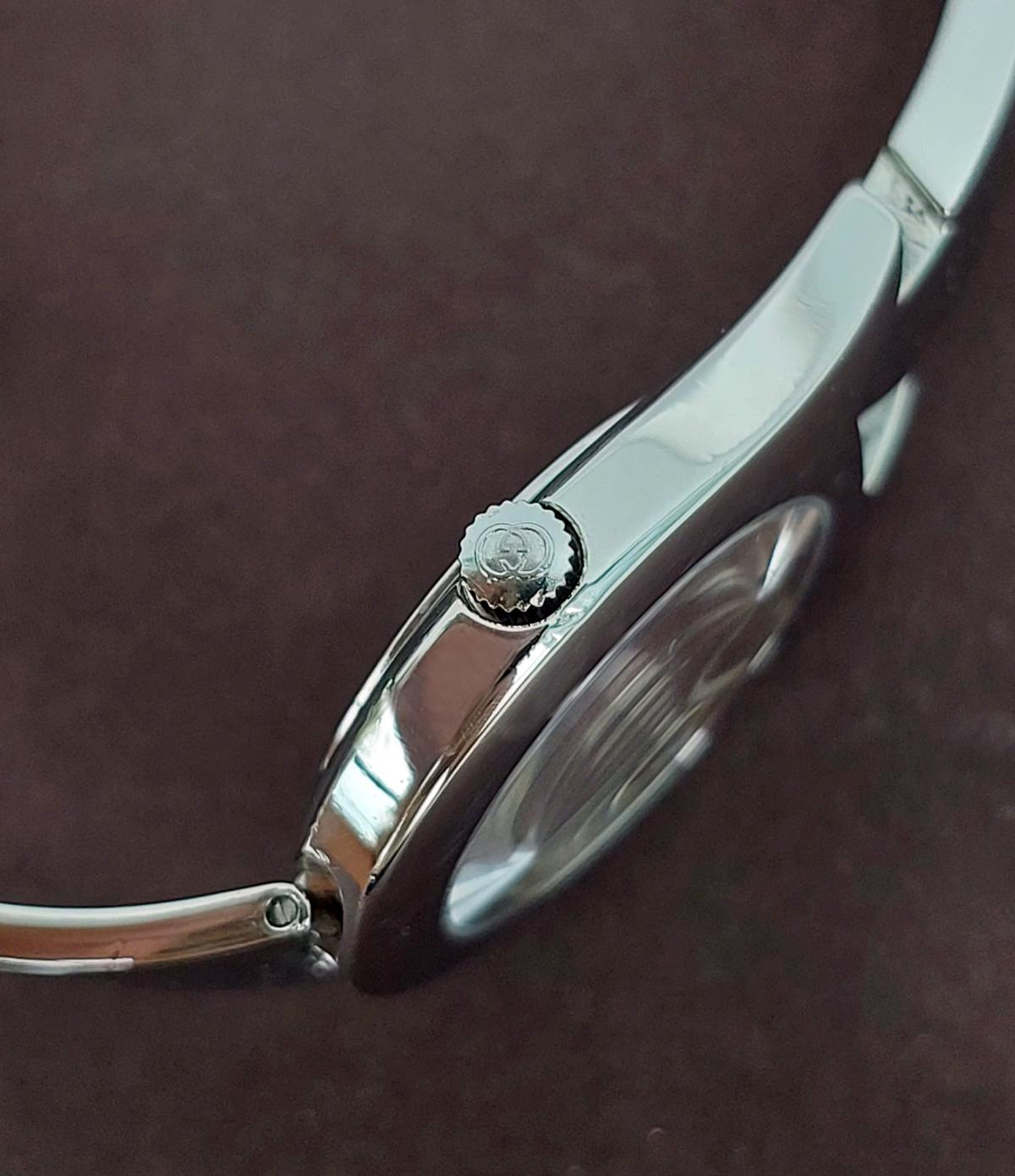 Mẫu nữ Gu.cci mang đậm phong cách thời trang cao cấp đến từ nước Ý, với thiết kế mặt số nhỏ nhắn, phom giọt nước mềm mại, tôn lên sự dịu dàng và quý phái. Dây kim loại sáng bóng dạng lắc tay cực kỳ nữ tính và sang trọng và có dạng gài như dây da bởi 1 thiết kế thông minh, tiện lợi. Nền mặt tráng gương độc đáo, kim chỉ giờ và logo Gu.cci sắc sảo. Một mẫu nữ tuyệt hảo giúp tôn lên cổ tay của phái đẹp một cách đầy tinh tế, phù hợp cho cả đi tiệc, công sở hay dạo phố. Chính hãng Gu.cci sx tại Thụy Sỹ, sd máy Pin Thụy Sỹ, nguyên bản size 26mm, độ mới tầm 97-98%.