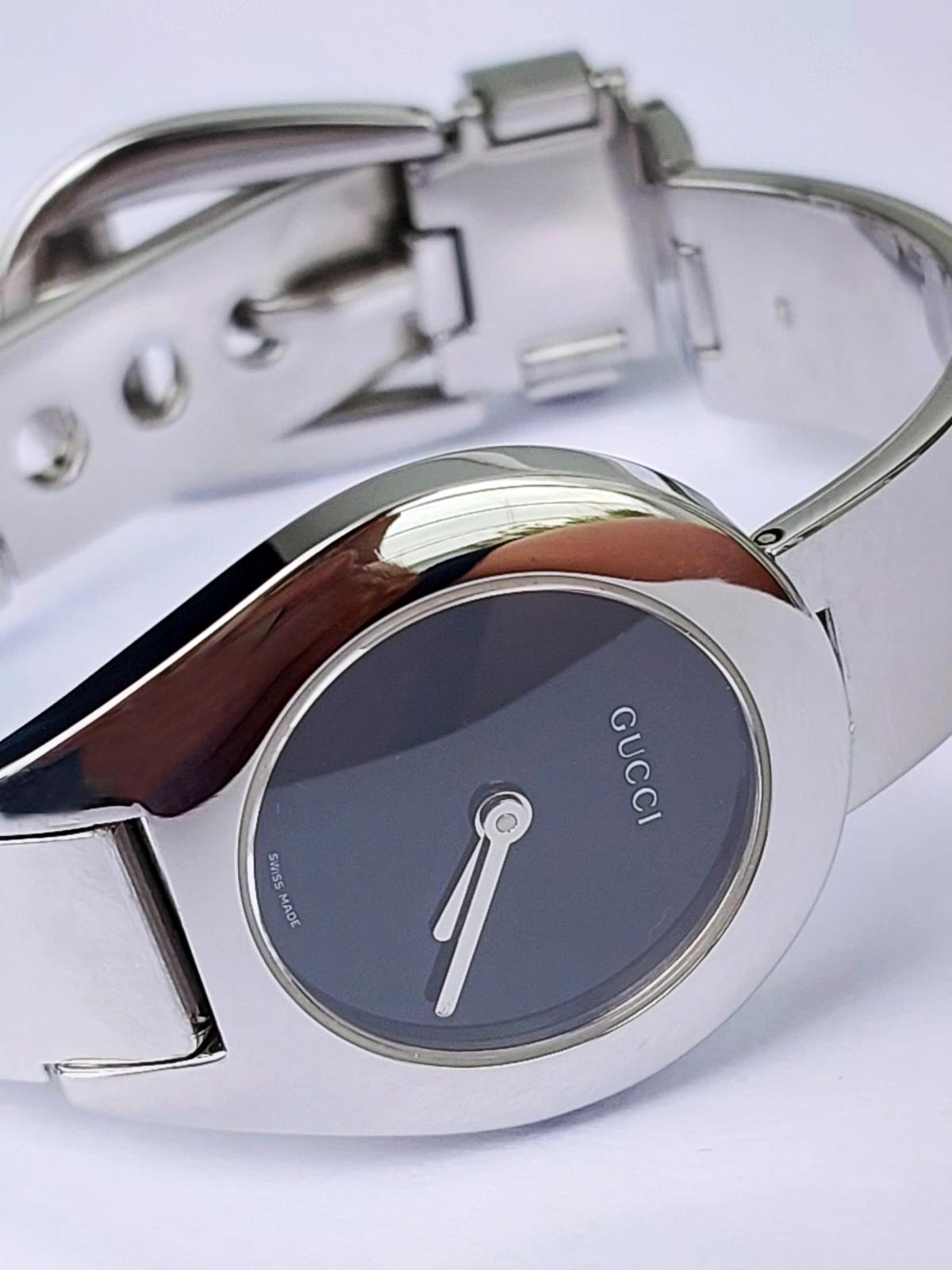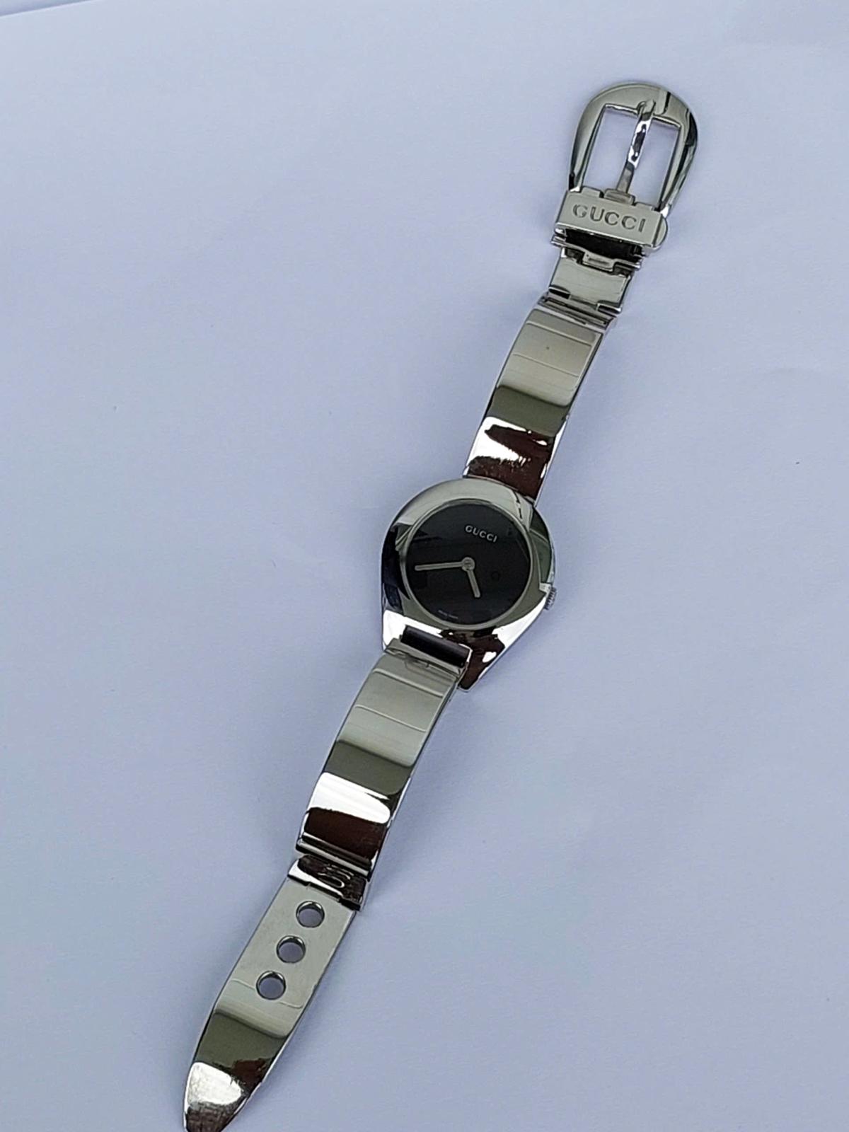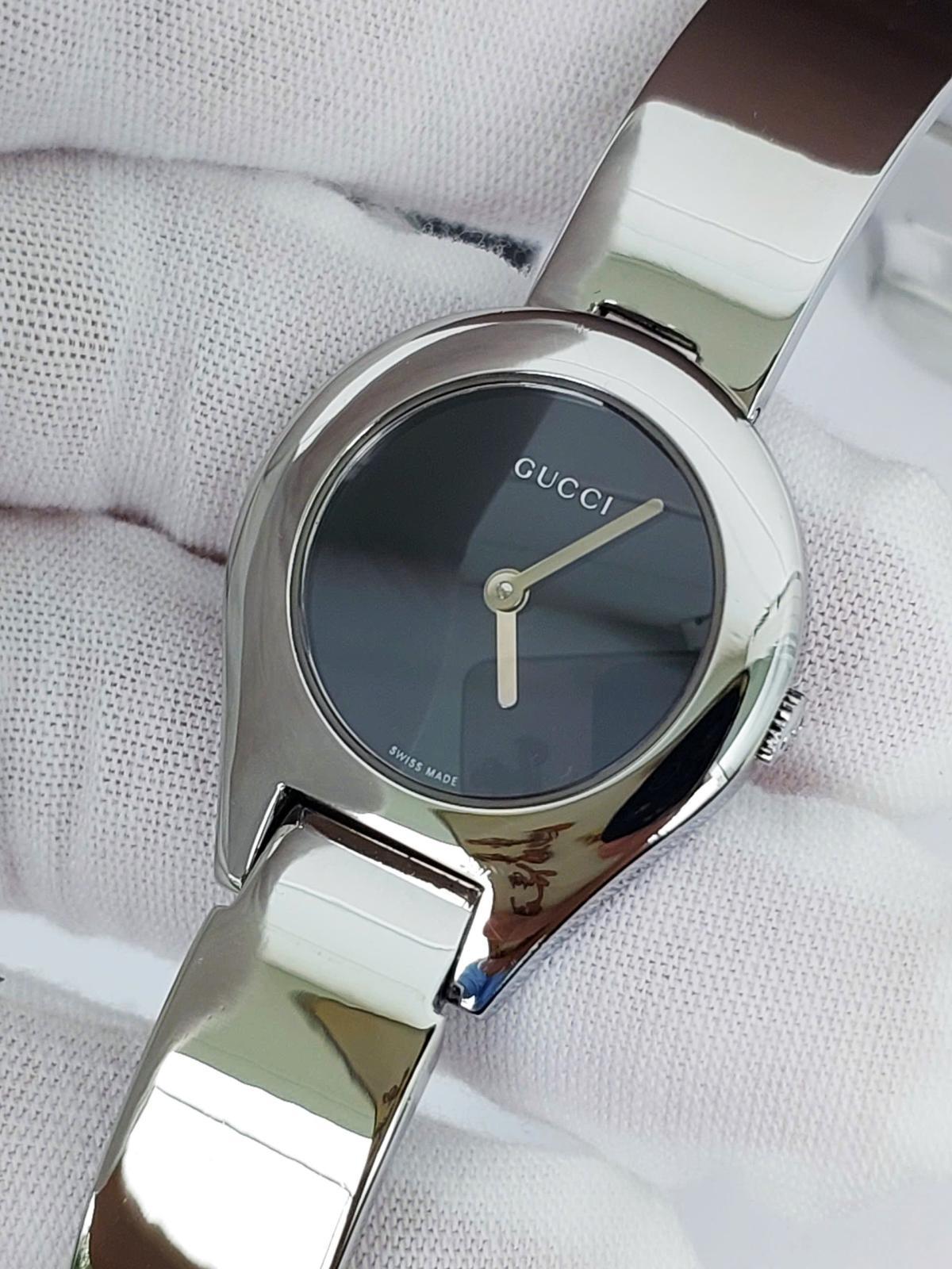 Mẫu nữ Gu.cci mang đậm phong cách thời trang cao cấp đến từ nước Ý, với thiết kế mặt số nhỏ nhắn, phom giọt nước mềm mại, tôn lên sự dịu dàng và quý phái. Dây kim loại sáng bóng dạng lắc tay cực kỳ nữ tính và sang trọng và có dạng gài như dây da bởi 1 thiết kế thông minh, tiện lợi. Dia mặt đen tối giản làm nổi bật kim chỉ giờ và logo Gu.cci sắc sảo. Một mẫu nữ tuyệt hảo giúp tôn lên cổ tay của phái đẹp một cách đầy tinh tế, phù hợp cho cả đi tiệc, công sở hay dạo phố. Chính hãng Gu.cci sx tại Thụy Sỹ, sd máy Pin Thụy Sỹ, , nguyên bản size 26mm, độ mới cao tầm 98%.