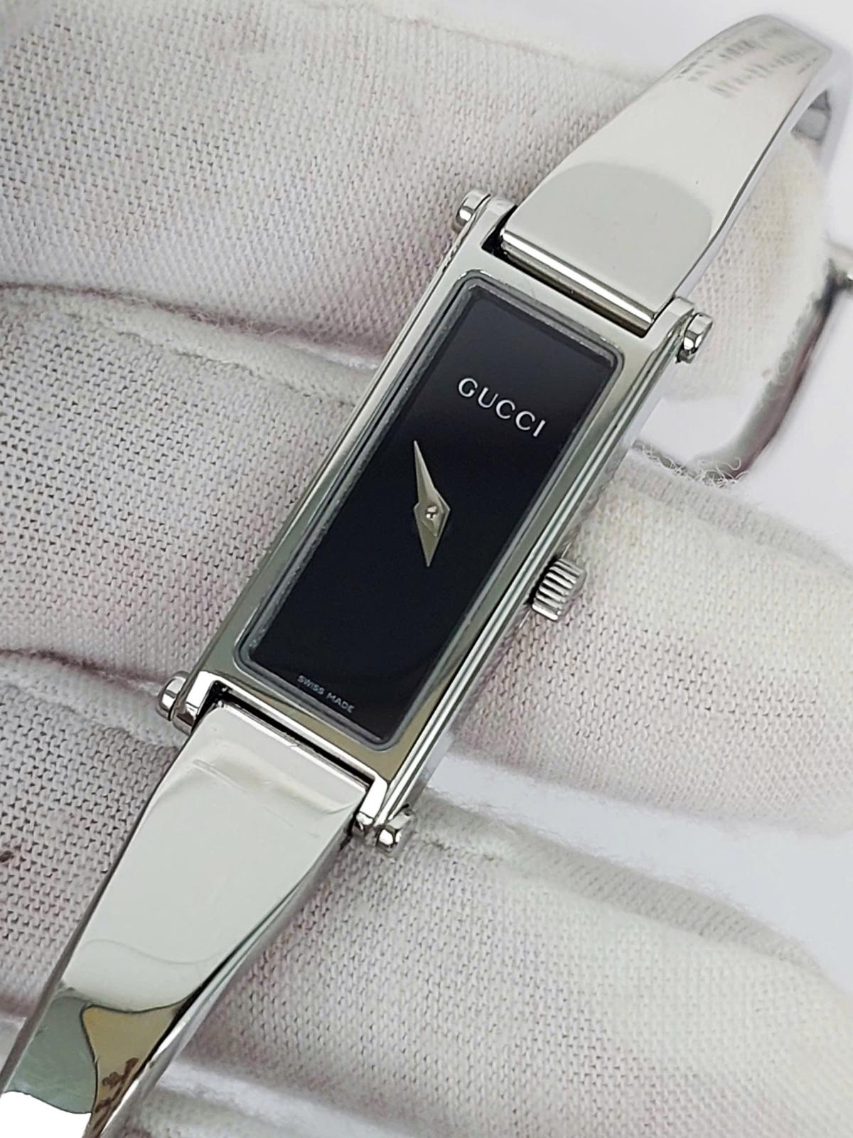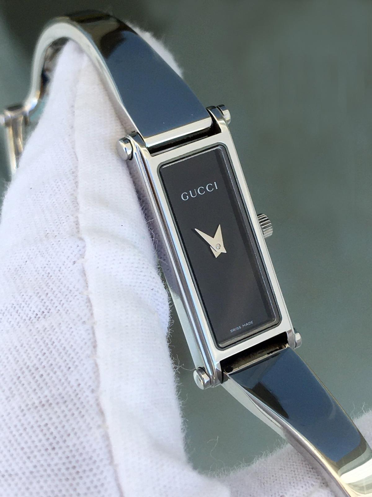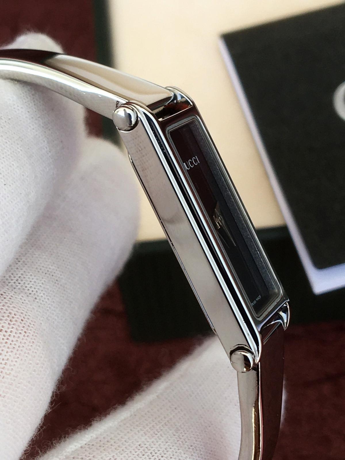 Với thiết kế mặt chữ nhật hài hòa, mẫu Gu.cci này toát lên vẻ đẹp tinh tế và nhẹ nhàng. Thiết kế tối giản nhưng đầy cuốn hút, là sự lựa chọn hoàn hảo cho những quý cô yêu thích phong cách cổ điển và thanh lịch. Mặt số đen bóng huyền bí kết hợp cùng kim thép lá lúa nổi bật. Dáng kiềng chất liệu kim loại sáng bóng, được chế tác tỉ mỉ, mang lại cảm giác chắc chắn nhưng không kém phần duyên dáng. Chính hãng Gu.cci sx tại Thụy Sỹ, sd máy Pin Thụy Sỹ, nguyên bản, size 12x30mm, độ rộng kiềng phù hợp cho tay nữ từ 16 - 17,5mm, độ mới tầm 97-98%.