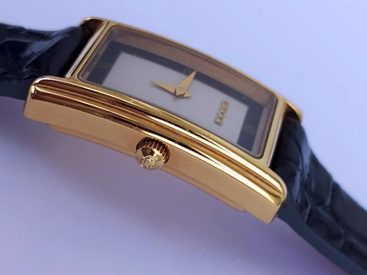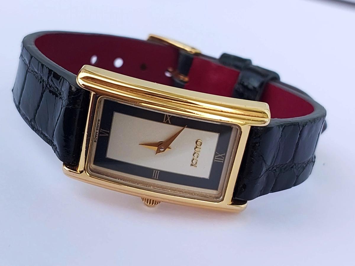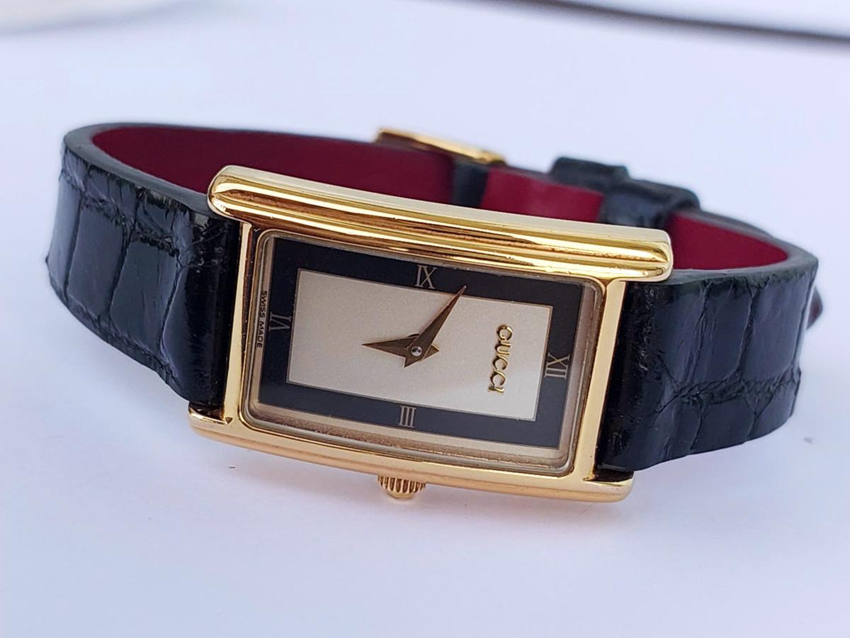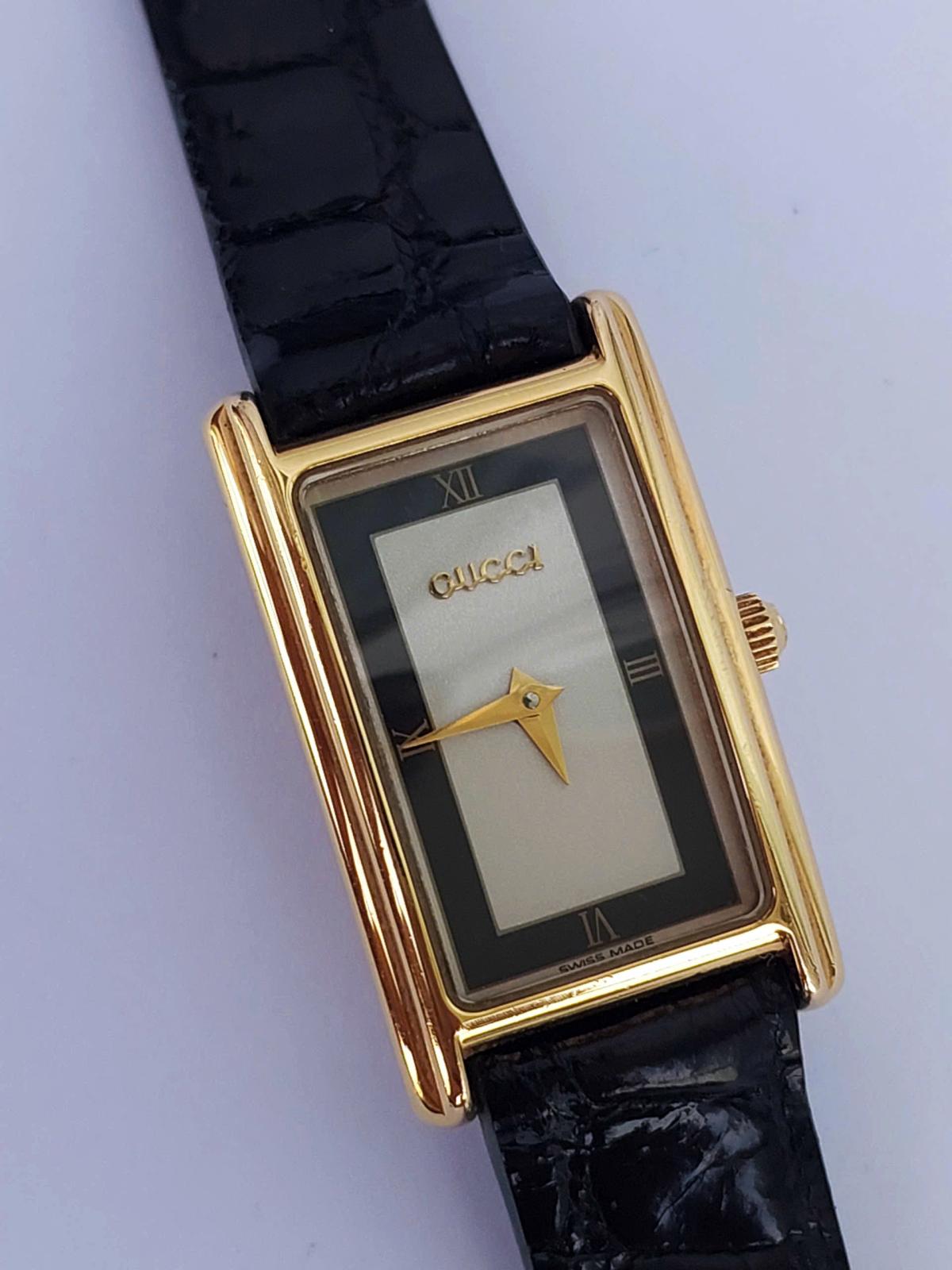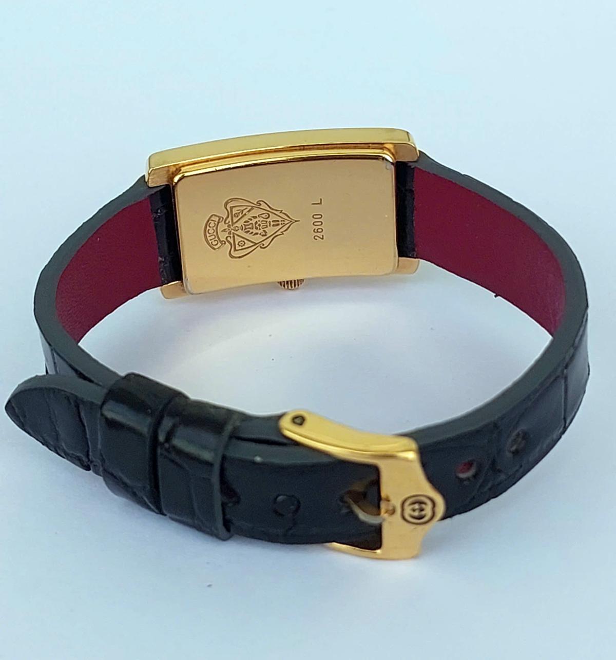 Mẫu nữ Gu.c.ci mang phong cách thanh lịch và cổ điển vượt thời gian, sở hữu thiết kế mặt hình chữ nhật cong nhẹ và nhỏ nhắn với các góc bo mềm mại được bao bọc bởi lớp vỏ mạ vàng sáng bóng toát lên vẻ sang trọng, quý phái. Điểm nhấn tinh tế nằm ở mặt số với sự phối màu tương phản độc đáo giữa viền đen huyền bí bao quanh phần trung tâm màu bạc trang nhã, kết hợp cùng cọc số La Mã tối giản tại vị trí 6 và 12 giờ tạo nên nét hoài cổ đầy cuốn hút. Chính hãng Gu.cci sx tại Thụy Sỹ, sd máy Pin Thụy Sỹ, khóa zin, dây da cá sấu thay thế, size 20x30mm. Độ mới tầm 95%