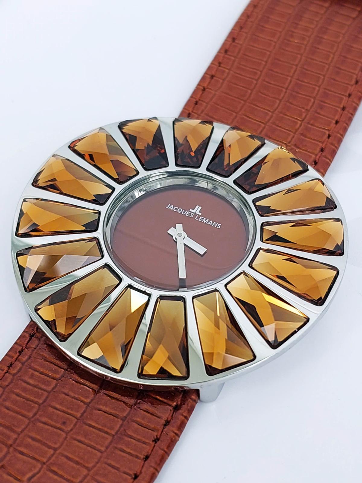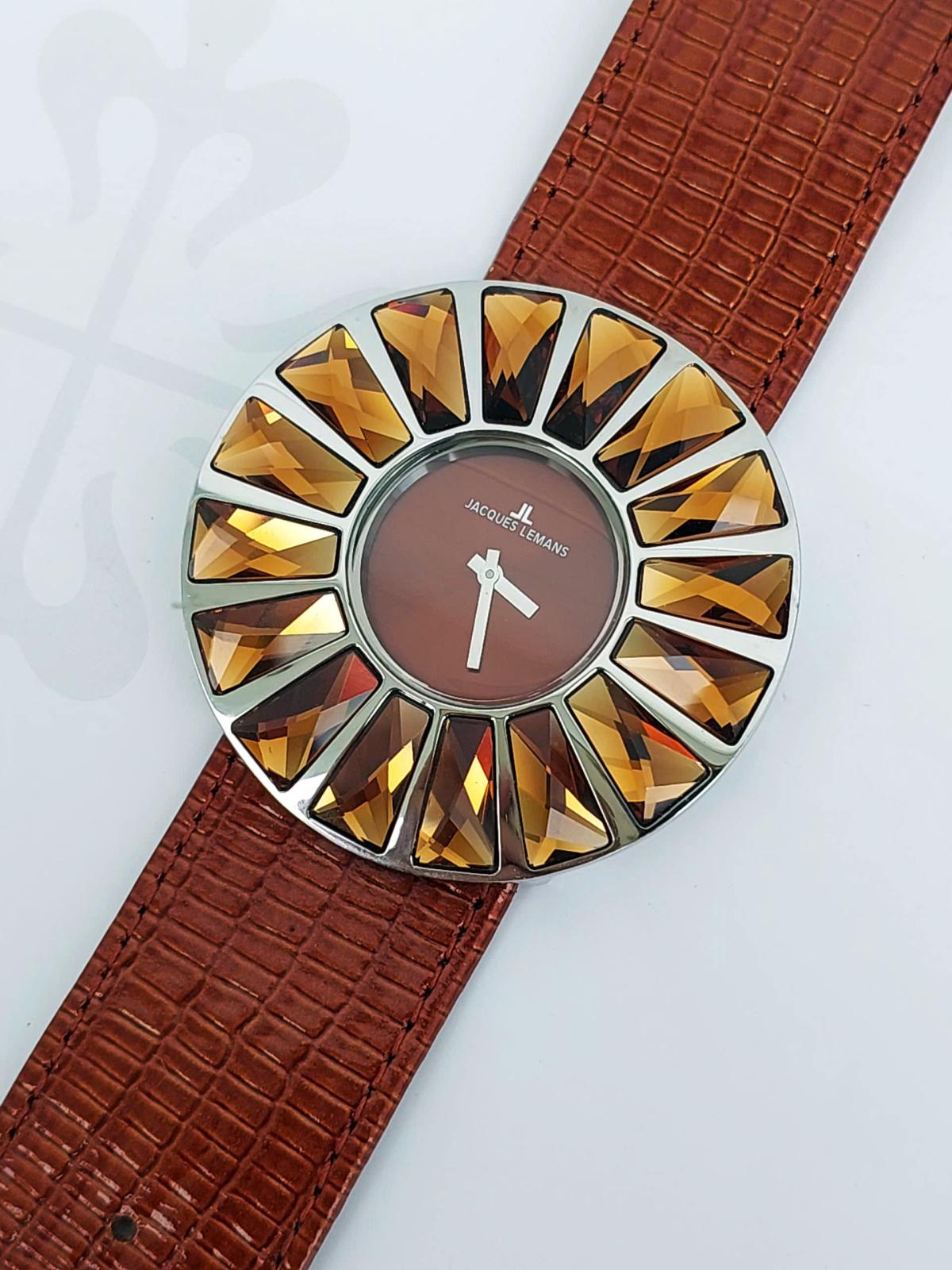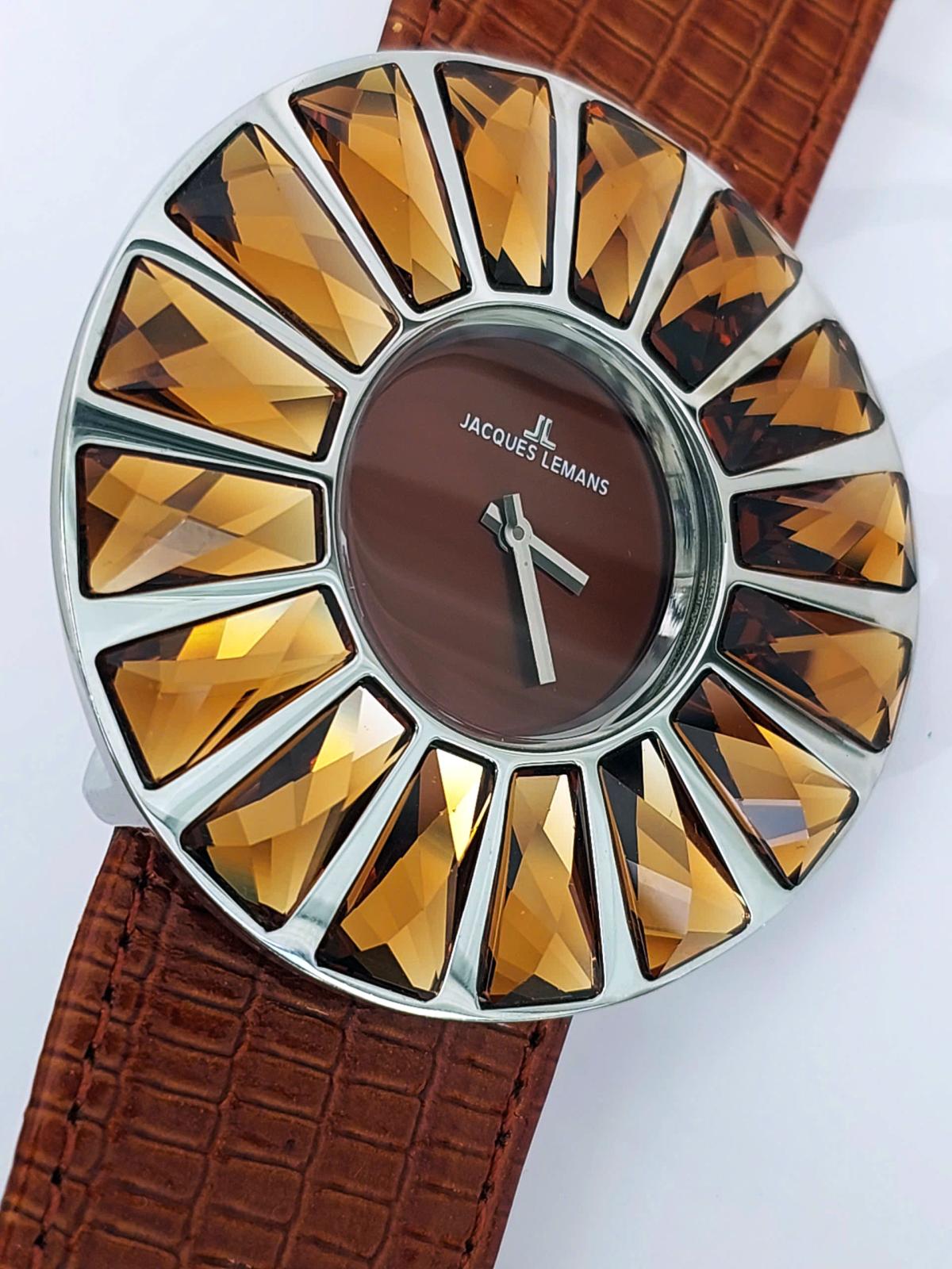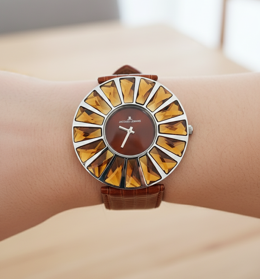 Series pha lê cao cấp của Jacques Lemans này là một trong những mẫu nữ mang đậm dấu ấn nghệ thuật và sự táo bạo trong thiết kế, nổi bật với mặt số tròn được bao quanh bởi những viên pha lê cắt giác tinh xảo, ánh lên sắc vàng hổ phách đầy mê hoặc như những tia nắng mặt trời tỏa rực. Từng viên pha lê được sắp đặt khéo léo tạo hiệu ứng thị giác lấp lánh, khiến chiếc đồng hồ không chỉ là công cụ xem giờ mà còn trở thành món trang sức sang trọng và quyến rũ. Mặt số tối giản với hai kim thanh mảnh trên nền nâu trầm ấm, vừa giữ sự tinh tế vừa tôn lên vẻ huyền bí của tổng thể. Kết hợp cùng dây da vân cá sấu màu nâu đỏ cổ điển, chiếc đồng hồ mang lại cảm giác quyền lực, thanh lịch nhưng cũng đầy cá tính, rất thích hợp cho những quý cô yêu thích sự khác biệt và đặt biệt cổ tay to tròn bởi kích thước khá lớn 49 mm mà thực ra với mẫu nay càng to thì càng đẹp . Chính hãng Jacques Lemans Áo, sd máy pin Japan, dây khóa zin, size 49 mm, độ mới cao tầm 98%.