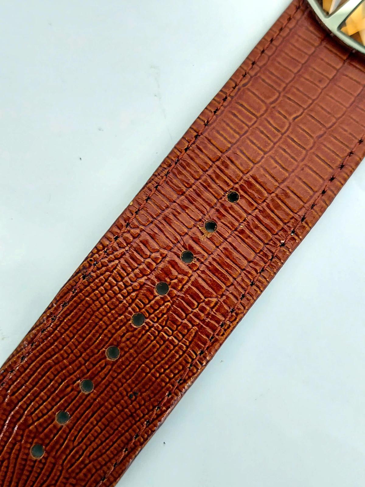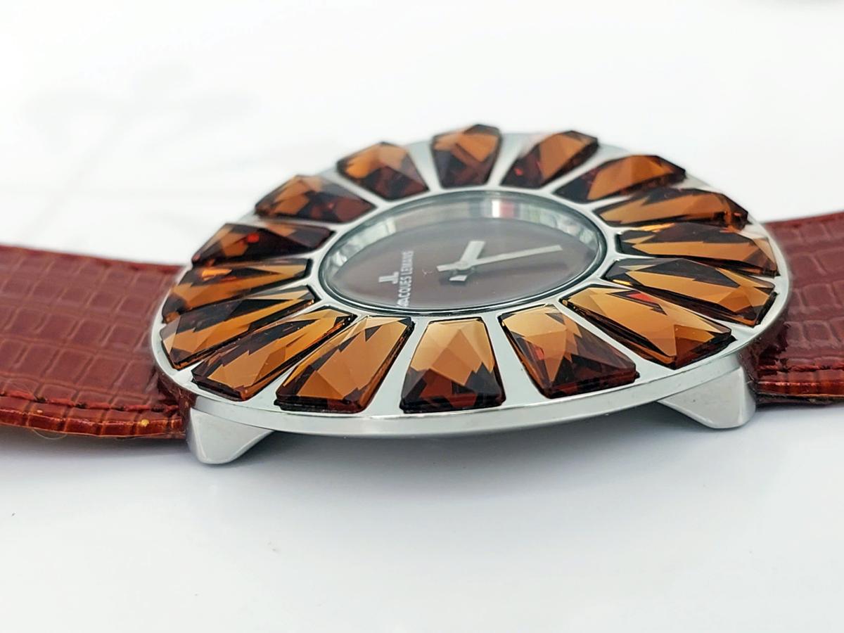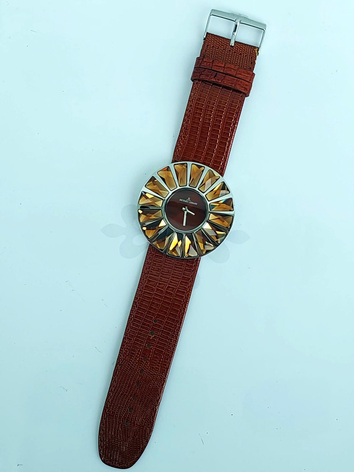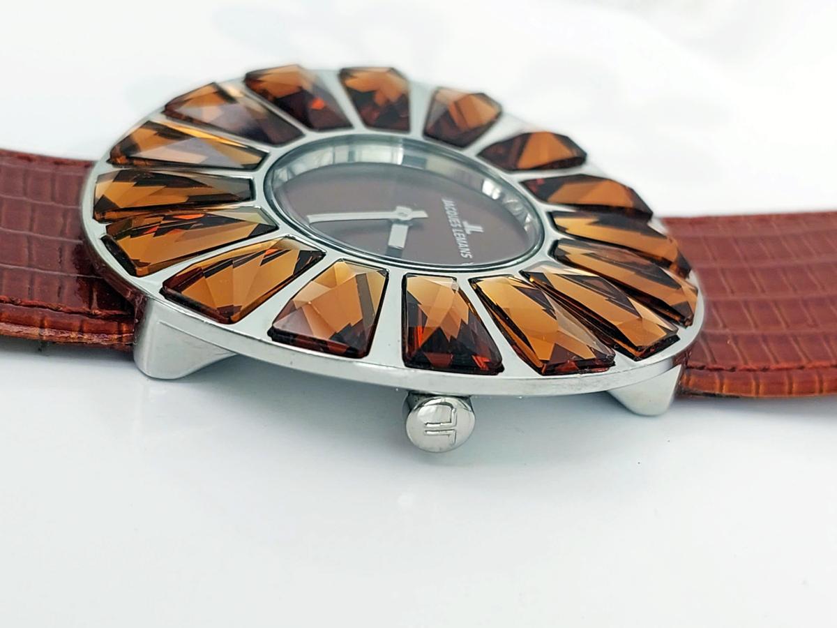 Series pha lê cao cấp của Jacques Lemans này là một trong những mẫu nữ mang đậm dấu ấn nghệ thuật và sự táo bạo trong thiết kế, nổi bật với mặt số tròn được bao quanh bởi những viên pha lê cắt giác tinh xảo, ánh lên sắc vàng hổ phách đầy mê hoặc như những tia nắng mặt trời tỏa rực. Từng viên pha lê được sắp đặt khéo léo tạo hiệu ứng thị giác lấp lánh, khiến chiếc đồng hồ không chỉ là công cụ xem giờ mà còn trở thành món trang sức sang trọng và quyến rũ. Mặt số tối giản với hai kim thanh mảnh trên nền nâu trầm ấm, vừa giữ sự tinh tế vừa tôn lên vẻ huyền bí của tổng thể. Kết hợp cùng dây da vân cá sấu màu nâu đỏ cổ điển, chiếc đồng hồ mang lại cảm giác quyền lực, thanh lịch nhưng cũng đầy cá tính, rất thích hợp cho những quý cô yêu thích sự khác biệt và đặt biệt cổ tay to tròn bởi kích thước khá lớn 49 mm mà thực ra với mẫu nay càng to thì càng đẹp . Chính hãng Jacques Lemans Áo, sd máy pin Japan, dây khóa zin, size 49 mm, độ mới cao tầm 98%.