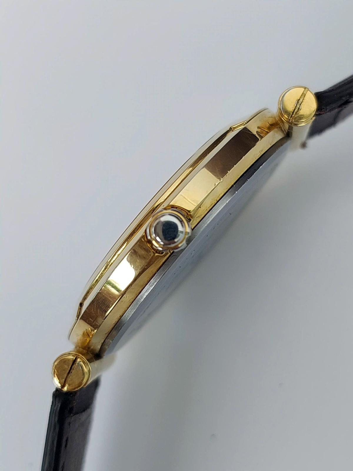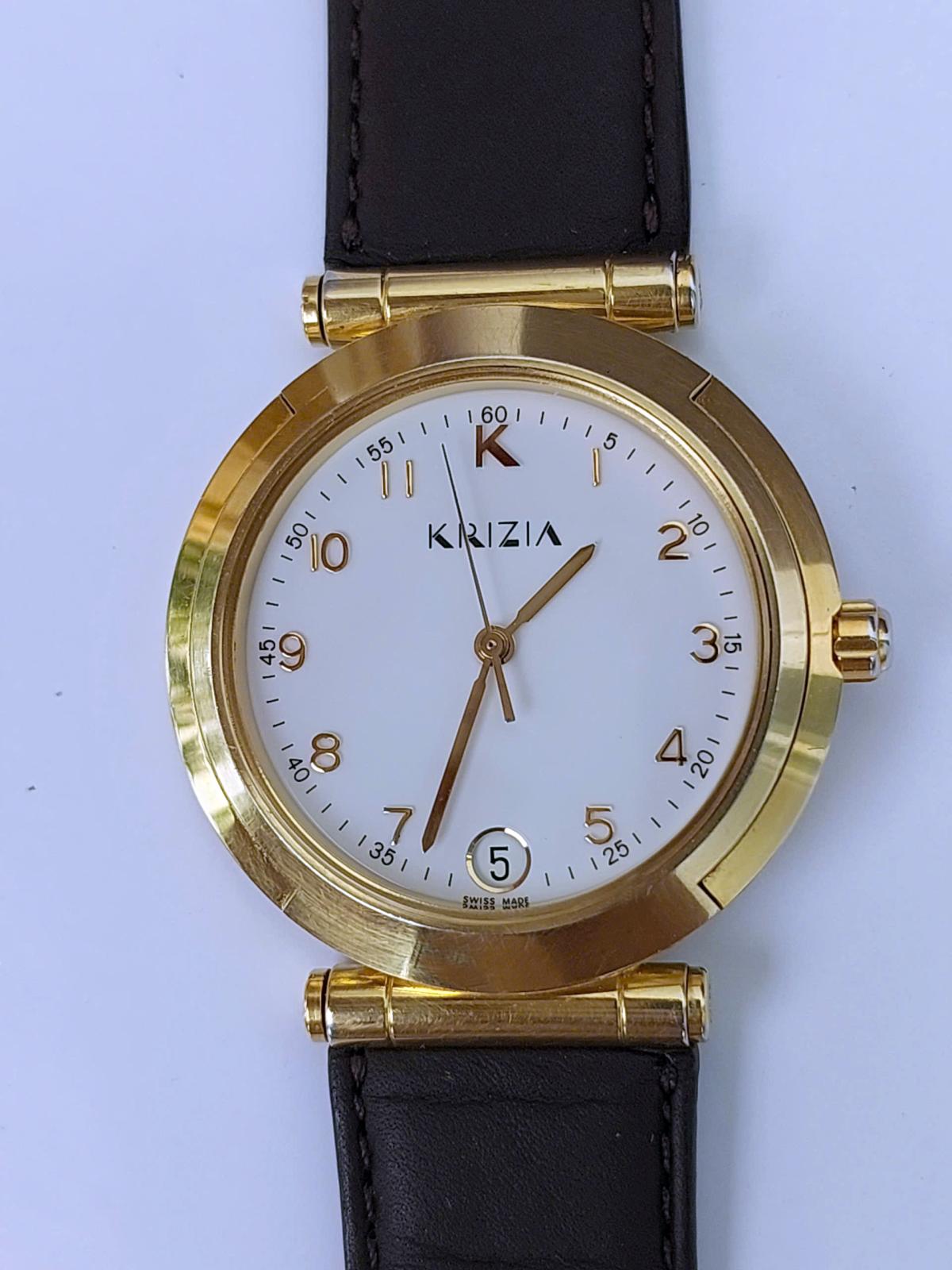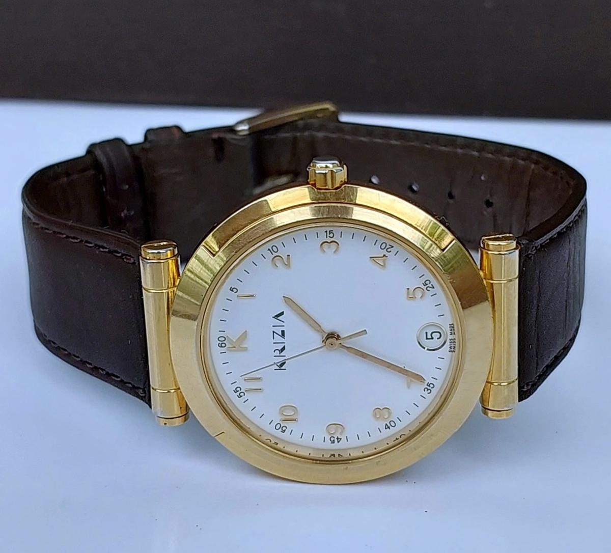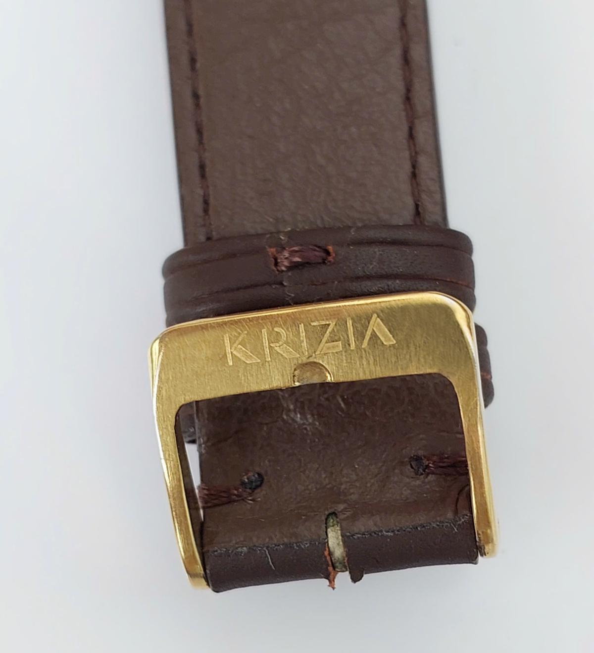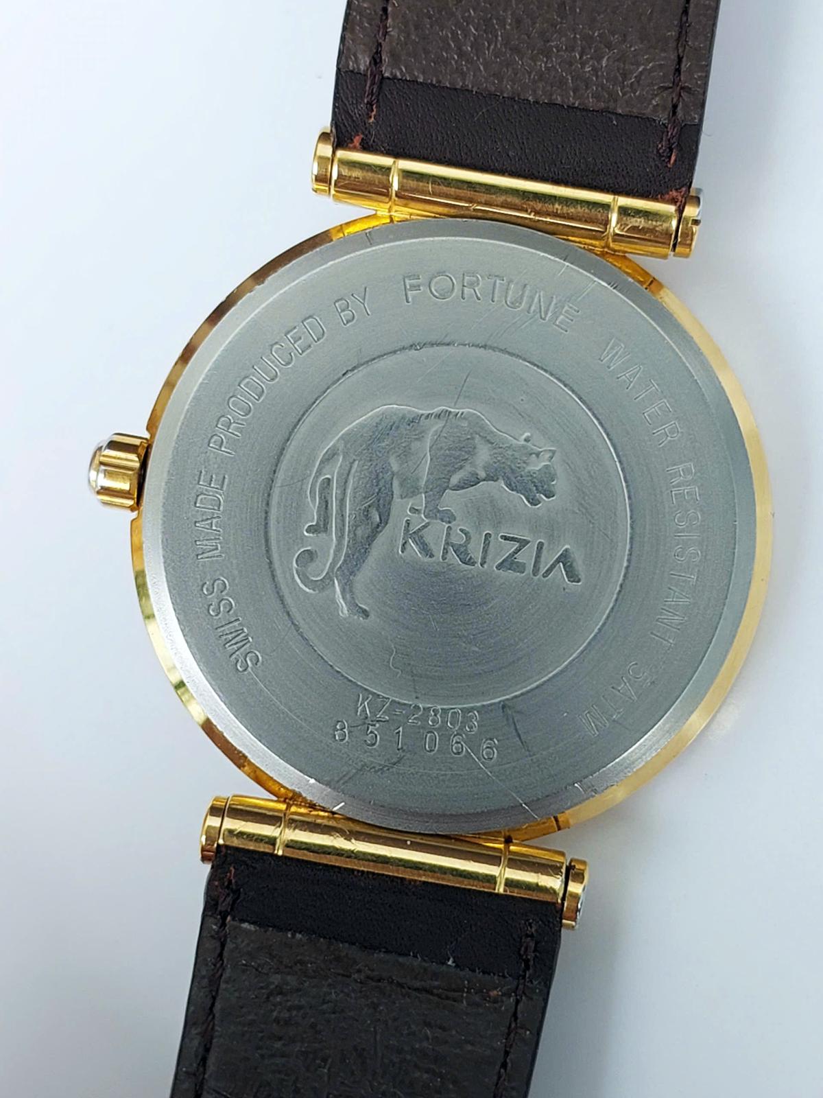 Đẹp thanh lịch cùng Kri-zia - thương hiệu thời trang Ý, nắp đáy gây ấn tượng mạnh từ biểu tượng đúc nổi màu titan chú bá0 đen đang tư thế rình mồi. Mặt trước đẹp theo cách đơn giản, tinh tế, cọc số học trò nổi dễ thương, 3 kim vàng óng và 1 lịch lộc góc 6h. Chính ahngx Krizia, sử dung máy Pin Thụy Sỹ, khóa zin, dây da thay thế, size 33mm (kính saphire) cho Nữ, độ mới tầm 95%