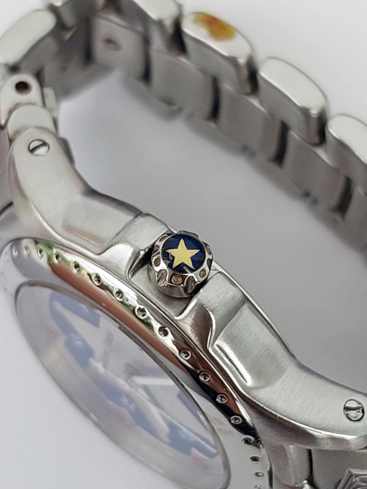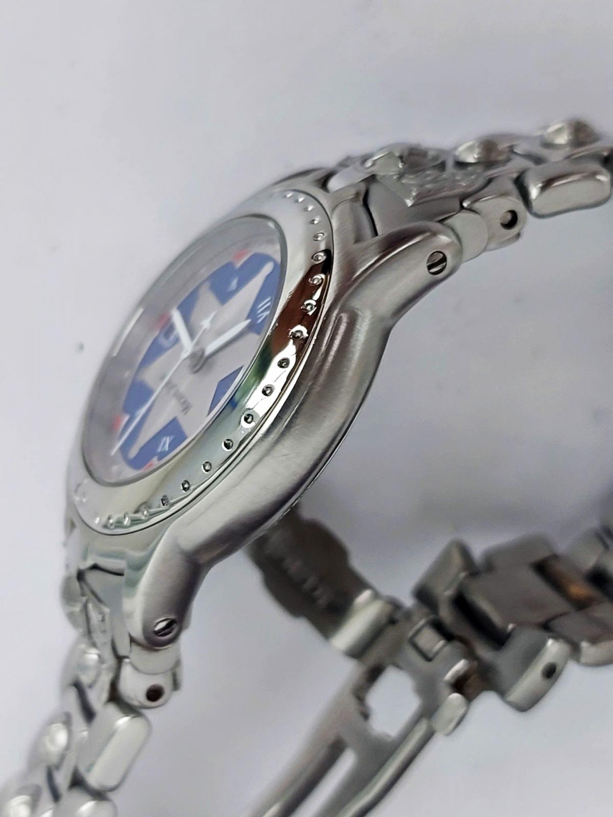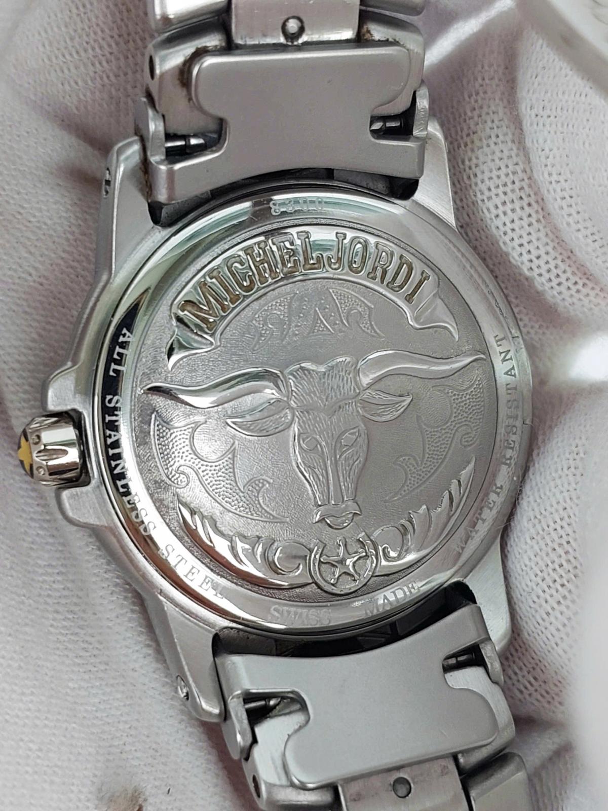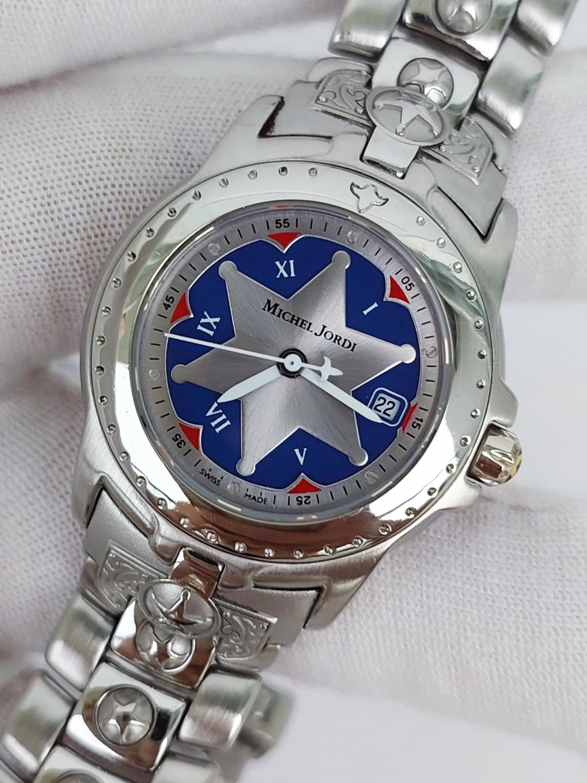 Tựa như một bức phù điêu lộng lẫy bước ra từ những lâu đài cổ kính của Châu Âu thời Phục Hưng, mẫu nữ Michel Jordi với thiết kế độc đáo, dialtâm điểm là ngôi sao bạc sáu cánh tỏa sáng trên nền mặt số xanh Royal Blue huyền bí được bao quanh bởi vòng số La Mã cổ điển gợi nhớ đến những tháp đồng hồ vĩ đại nơi thánh đường, kết hợp hoàn hảo cùng dây đeo thép không gỉ được chạm trổ những hoa văn nổi khối tinh xảo, cầu kỳ tựa như những họa tiết trang trí trong kiến trúc Baroque tráng lệ hay những chi tiết trên bộ giáp của các hiệp sĩ huyền thoại. Chính hãng Michel Jordi sx tại Thụy Sỹ, sd máy pin Thụy Sỹ, nguyên bản dây khóa hãng, size 29mm cho Nữ, độ mới tầm 98%.