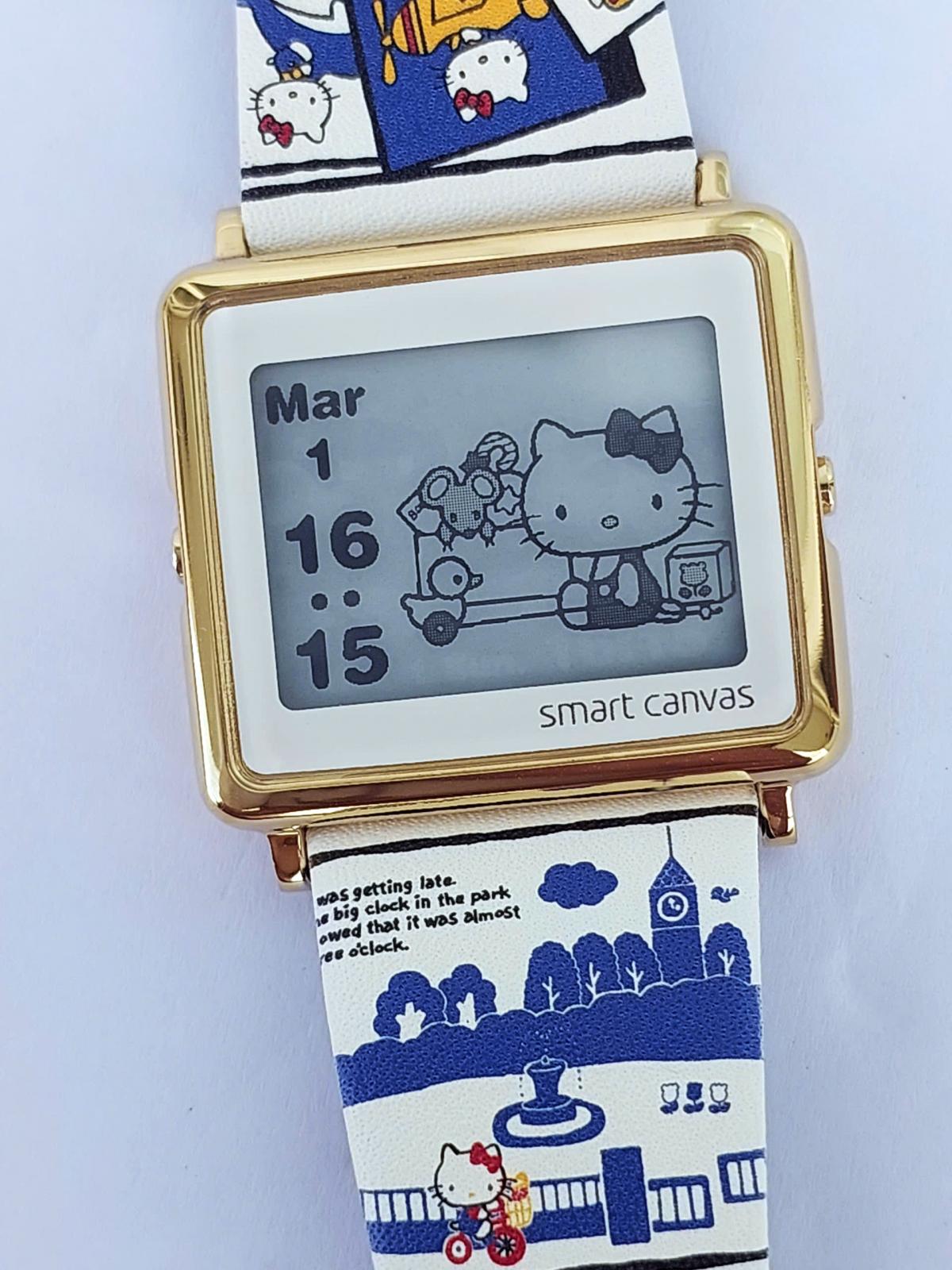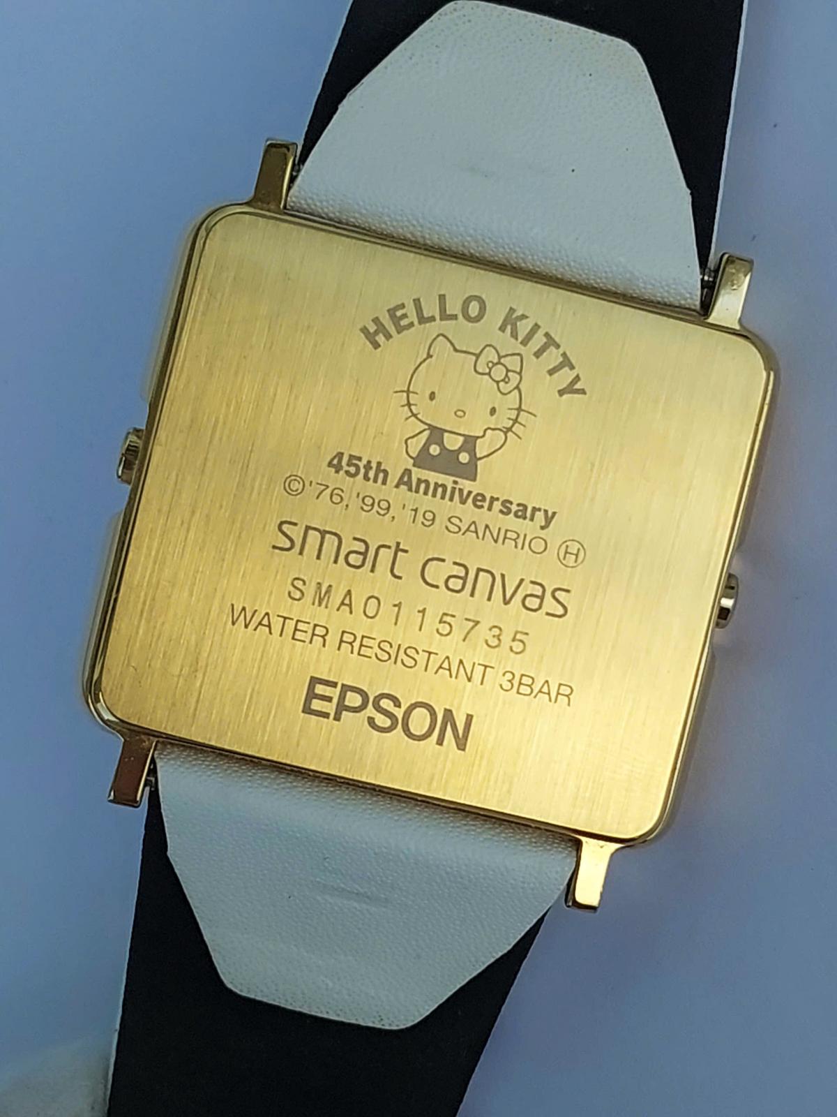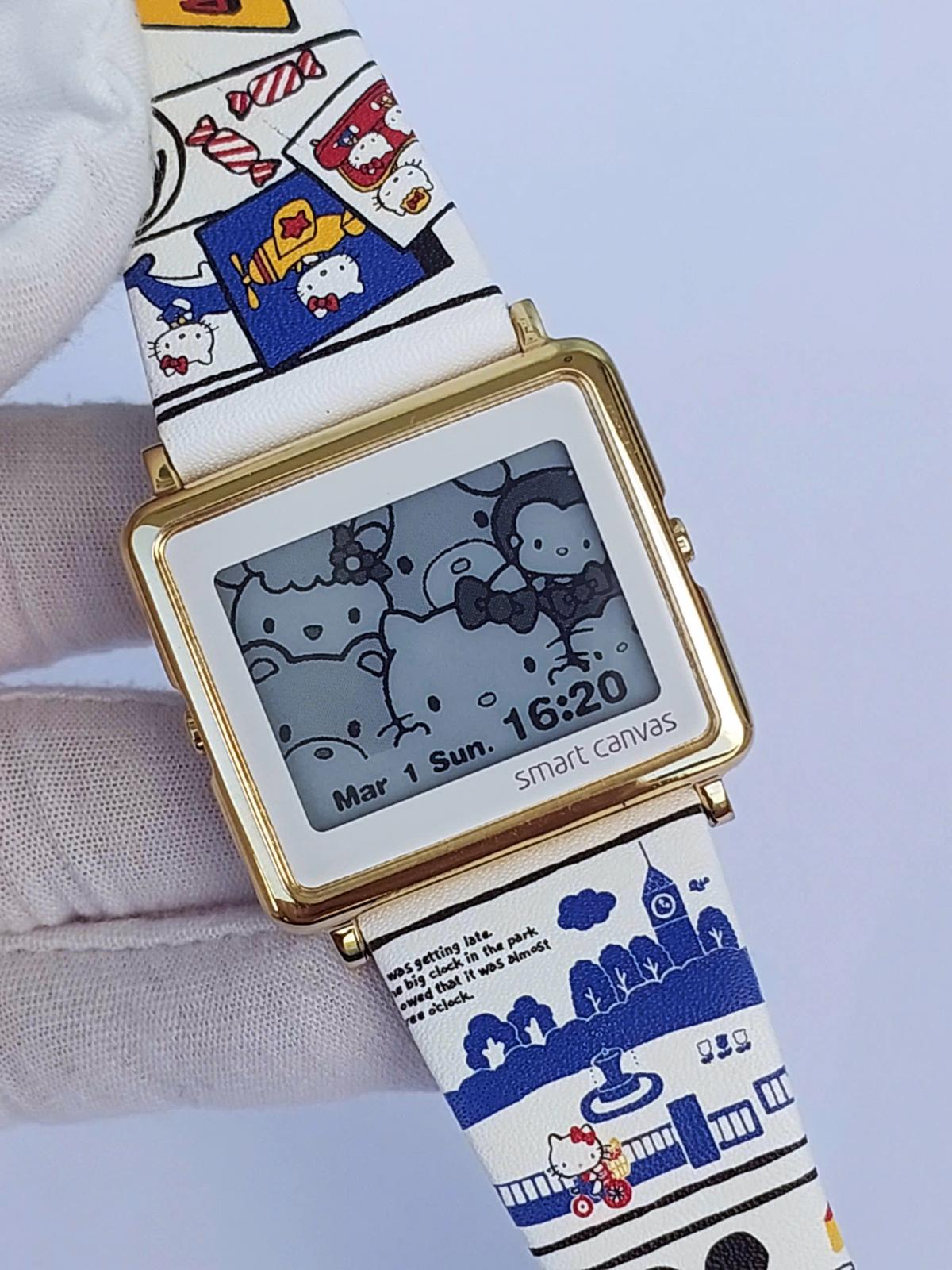 Smart Canvas phiên bản đặc biệt kỷ niệm 45 năm Hello Kitty sx giới hạn 300 chiếc (được chế tác bởi Epson, thuộc tập đoàn Seiko) mang đến sự kết hợp hoàn hảo giữa nét thanh lịch hiện đại và vẻ đáng yêu vượt thời gian. Ôm trọn lấy màn hình e-ink độc đáo có khả năng biến đổi hình ảnh linh hoạt, tái hiện rất nhiều những khoảnh khắc sinh động của cô mèo Hello Kitty thay đổi theo thời gian trong ngày như đang say sưa đánh đàn piano, chơi xếp hình, hay rạng rỡ bên những người bạn nhỏ. Phần dây đeo còn là một tác phẩm nghệ thuật thực thụ với vô số hình minh họa rực rỡ sắc màu, kể lại những chuyến hành trình vui nhộn của Hello Kitty Mặt đáy đồng hồ lại mang vẻ đẹp sắc nét với logo kỷ niệm 45 năm được khắc tinh xảo, khẳng định giá trị sưu tầm của một ấn bản đặc biệt. Mang trên tay cỗ máy thời gian này không chỉ là cách để theo dõi giờ giấc mà còn giống như bạn đang sở hữu một bức tranh hoạt hình thu nhỏ trên cổ tay, đầy ắp niềm vui, sự ngọt ngào và chắc chắn sẽ làm bừng sáng phong cách mỗi ngày của những quý cô yêu thích sự mộng mơ. ĐH sx nội địa Nhật, sd máy pin Japan, nguyên bản, size 33x37mm. Độ mới tầm 98%