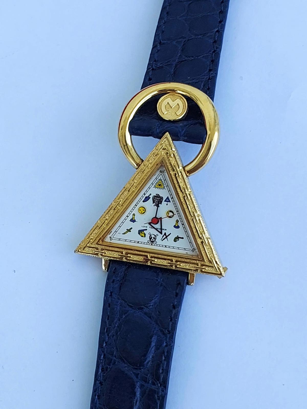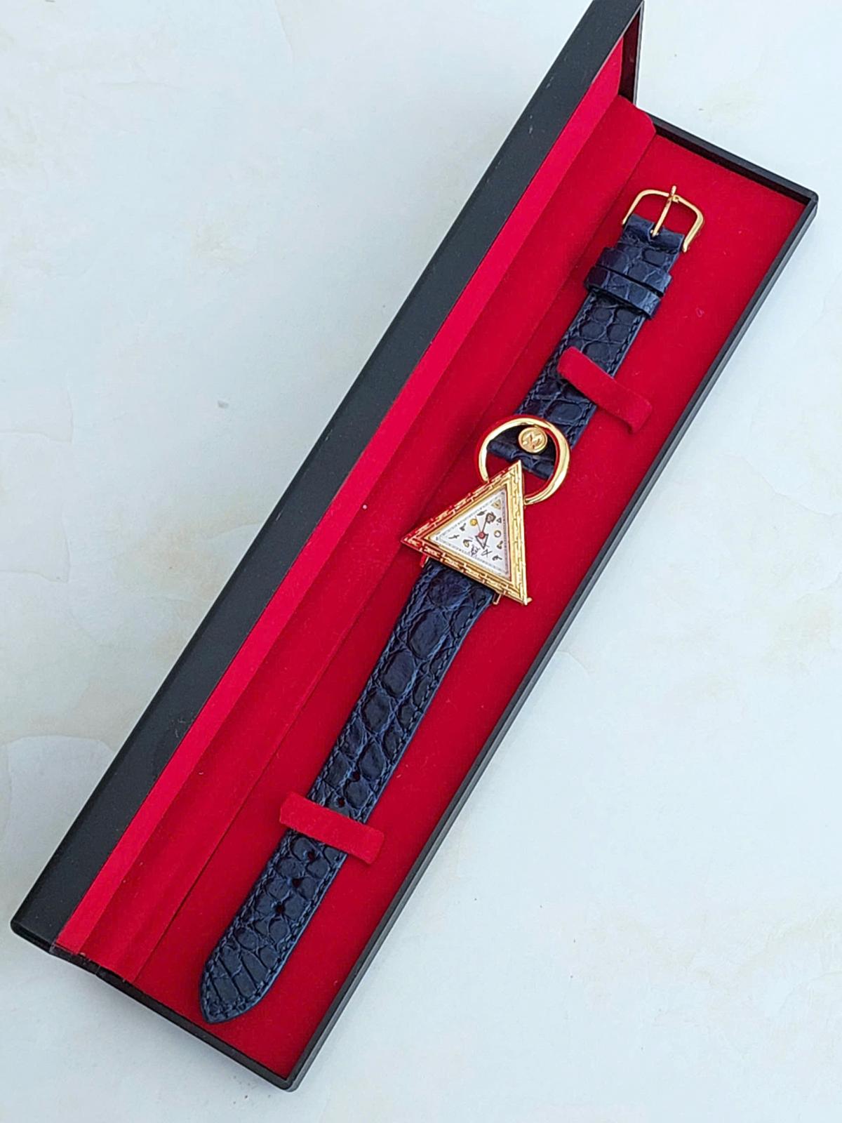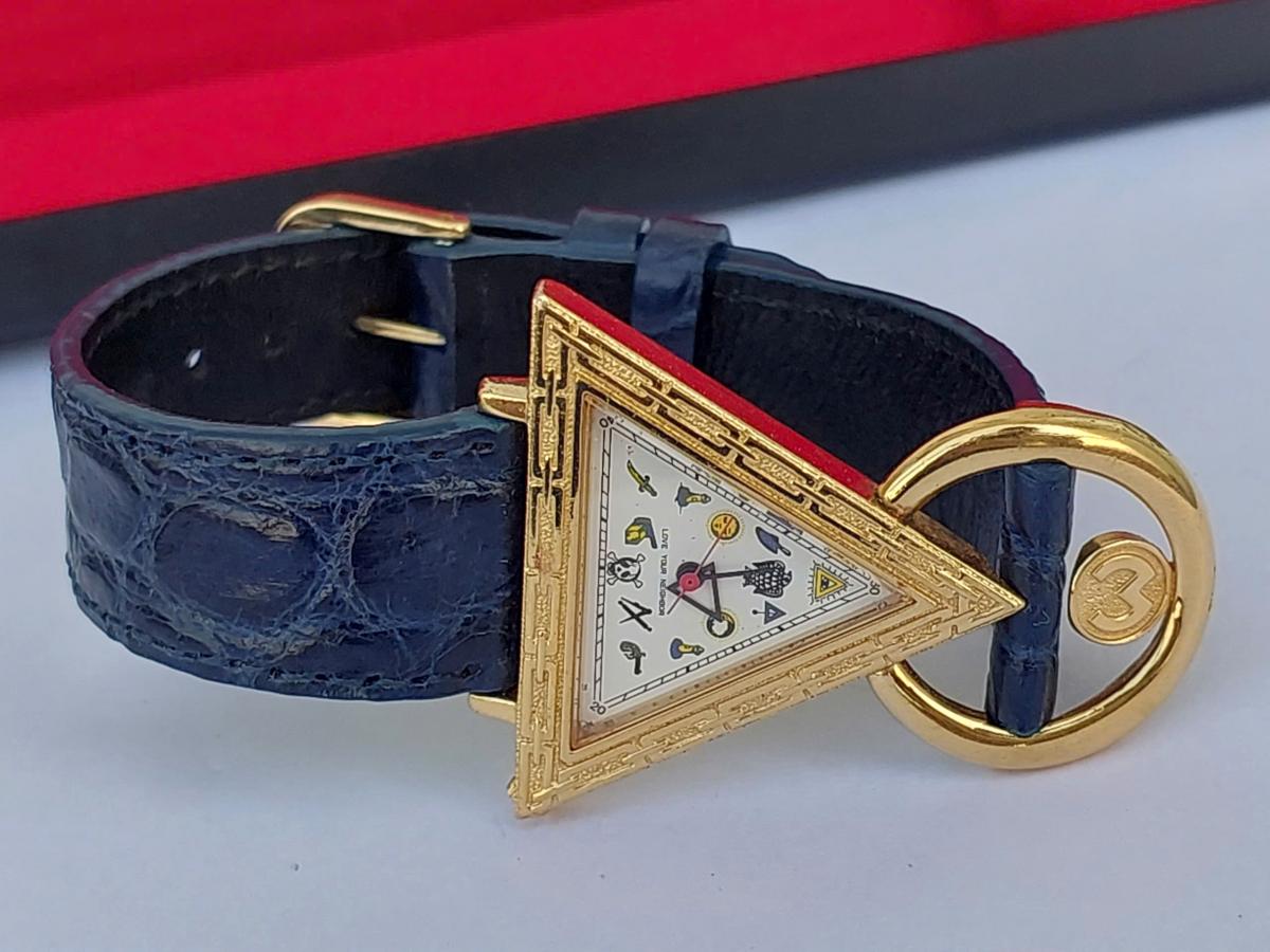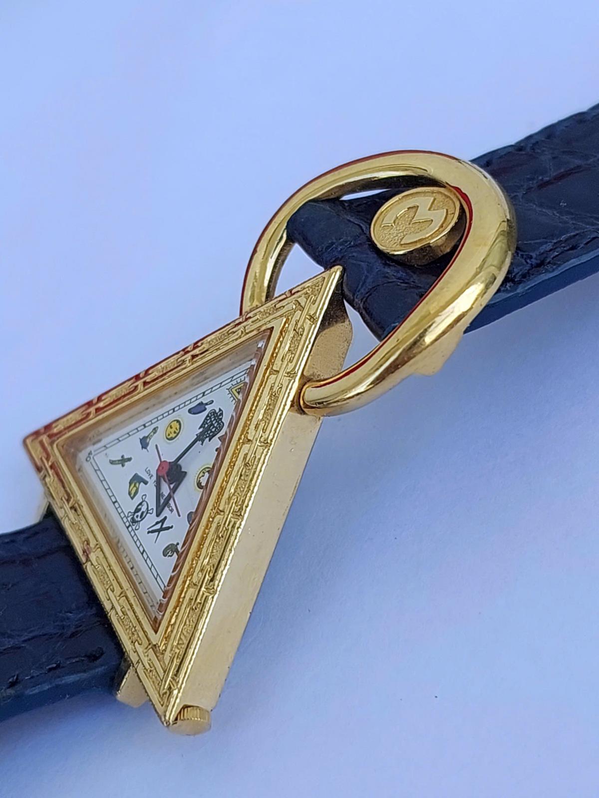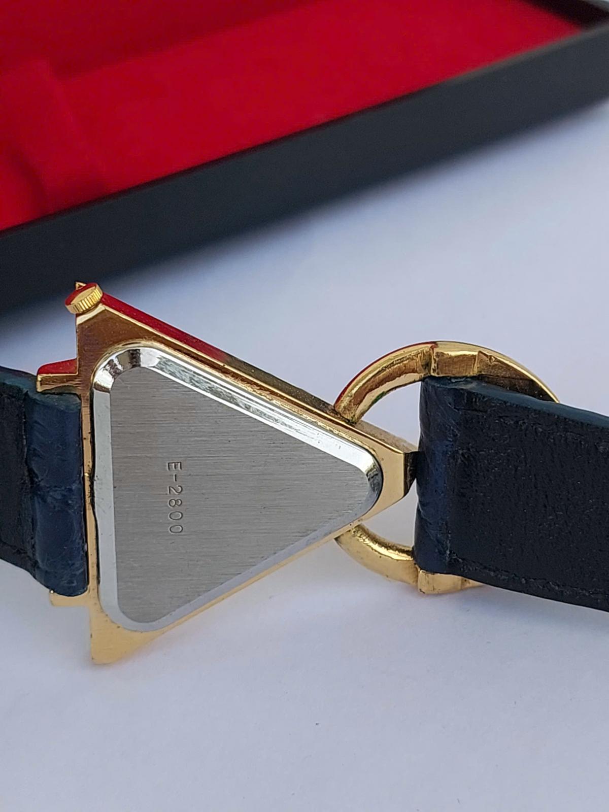 Mang trong mình vẻ đẹp vượt thời gian cùng tinh thần phá cách đầy nghệ thuật, chiếc đồng hồ nữ vintage này như một tuyệt tác dành cho những quý cô say mê phong cách cổ điển nhưng vẫn muốn khẳng định dấu ấn riêng biệt. Điểm nhấn nổi bật nằm ở thiết kế mặt số tam giác được mạ vàng sang trọng gợi liên tưởng đến hình tượng kim tự tháp cổ đại, biểu tượng của sự trường tồn và những bí ẩn chưa lời giải. Khung vỏ được viền bởi những họa tiết hình học chạm khắc tinh xảo càng làm nổi bật chiều sâu nghệ thuật và nét huyền bí cuốn hút. Không chỉ dừng lại ở hình dáng độc đáo, mặt dial trắng còn như một bức tranh thu nhỏ đầy mê hoặc với các biểu tượng giàu ý nghĩa như con mắt, mặt trời, mặt trăng, thanh gươm... tạo nên một tổng thể vừa bí ẩn vừa có chiều sâu. Sự hòa quyện giữa bộ kim thanh mảnh cách điệu, chi tiết vòng nối tròn lớn khắc logo thương hiệu “W” mang lại 1 tổng thê độc đáo trên cổ tay phái đẹp. Chính hãng Wako sx nội địa Nhật, sd máy pin Nhật, khóa zin, dây da cá s.ấu thay thế, size các cạnh tam giác 34mm, độ mới tâm 97%