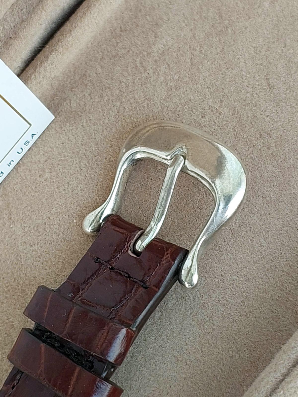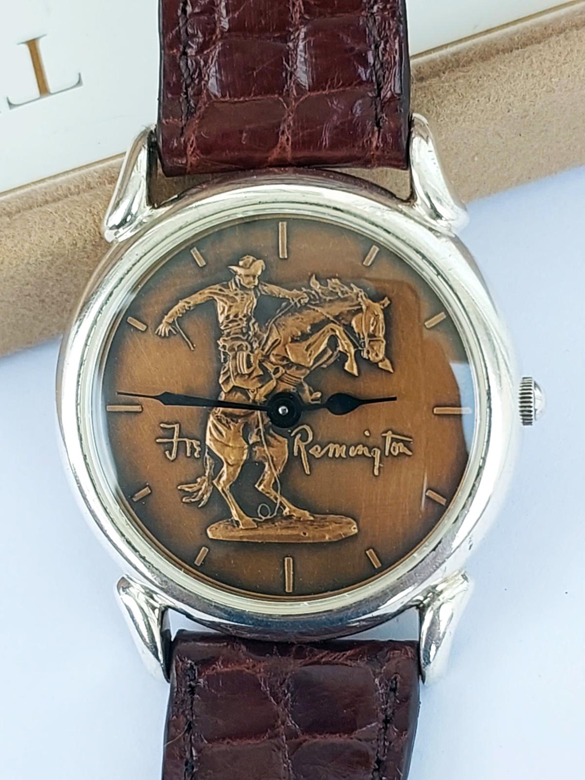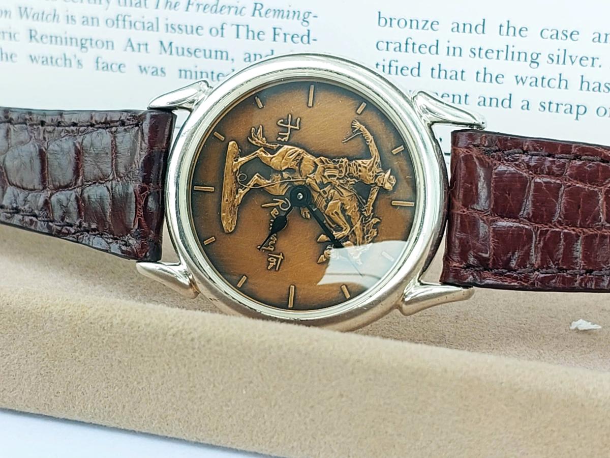 Chào đón năm mới Bính Ngọ bằng một tuyệt phẩm mang linh hồn của sự chinh phục – chiếc đồng hồ The Frederic Remington Museum Watch. Không đơn thuần là cỗ máy thời gian, đây là một di sản nghệ thuật thu nhỏ được chế tác độc quyền bởi The Franklin Mint từ năm 1988, mang giá trị sưu tầm cực cao với đầy đủ giấy tờ chứng nhận nguồn gốc từ Bảo tàng Nghệ thuật Frederic Remington (New York). Điểm 'độc bản' nằm ở sự kết hợp xa xỉ giữa lớp vỏ Bạc đúc nguyên khối (Sterling Silver) sáng bóng bao bọc lấy mặt số Đồng đặc (Solid Bronze) trầm mặc – nơi tái hiện sống động bức tượng đài 'Bronco Buster' huyền thoại. Hình ảnh chàng cao bồi dũng mãnh thuần phục chú ngựa hoang đang tung vó không chỉ tôn vinh nghệ thuật điêu khắc miền Tây nước Mỹ mà còn là lá bùa phong thủy 'Mã đáo thành công' hoàn hảo nhất, tượng trưng cho sức mạnh bứt phá và khí chất tiên phong dành riêng cho chủ nhân xứng tầm trong năm Ngựa này. Chính hãng Franklin Mint sx tại Thụy Sỹ sx năm 1987, sd máy Pin Thụy Sỹ, full hộp, giấy tờ, khóa zin, dây cá s.ấu thay thế, size 34mm cho Nam tay nhỏ hoặc nữ, độ mới tầm 94%.