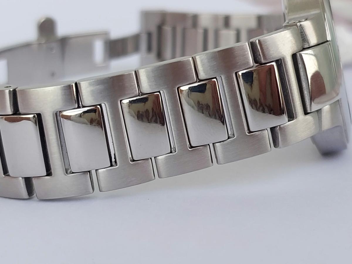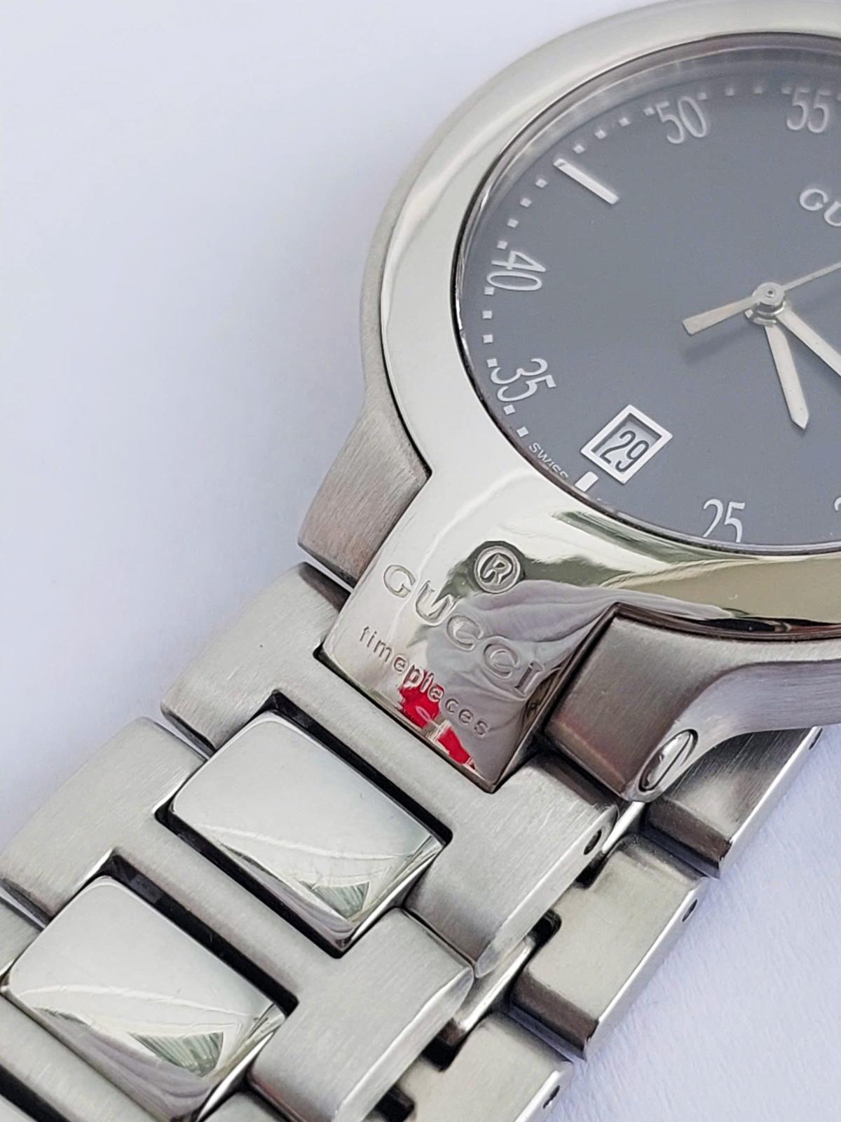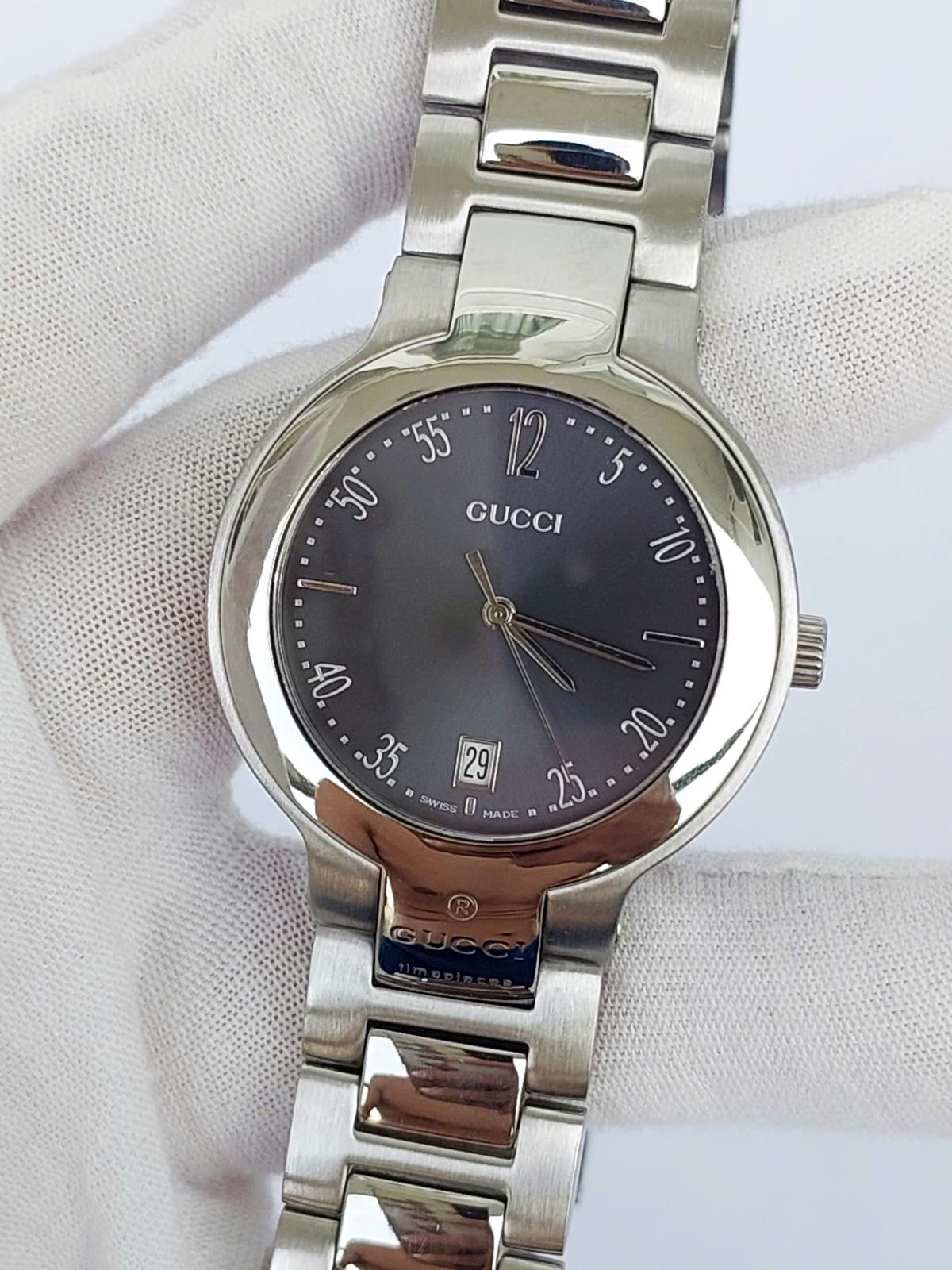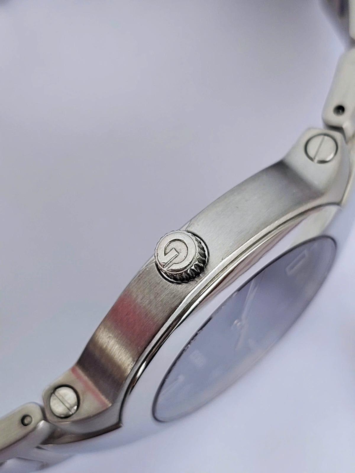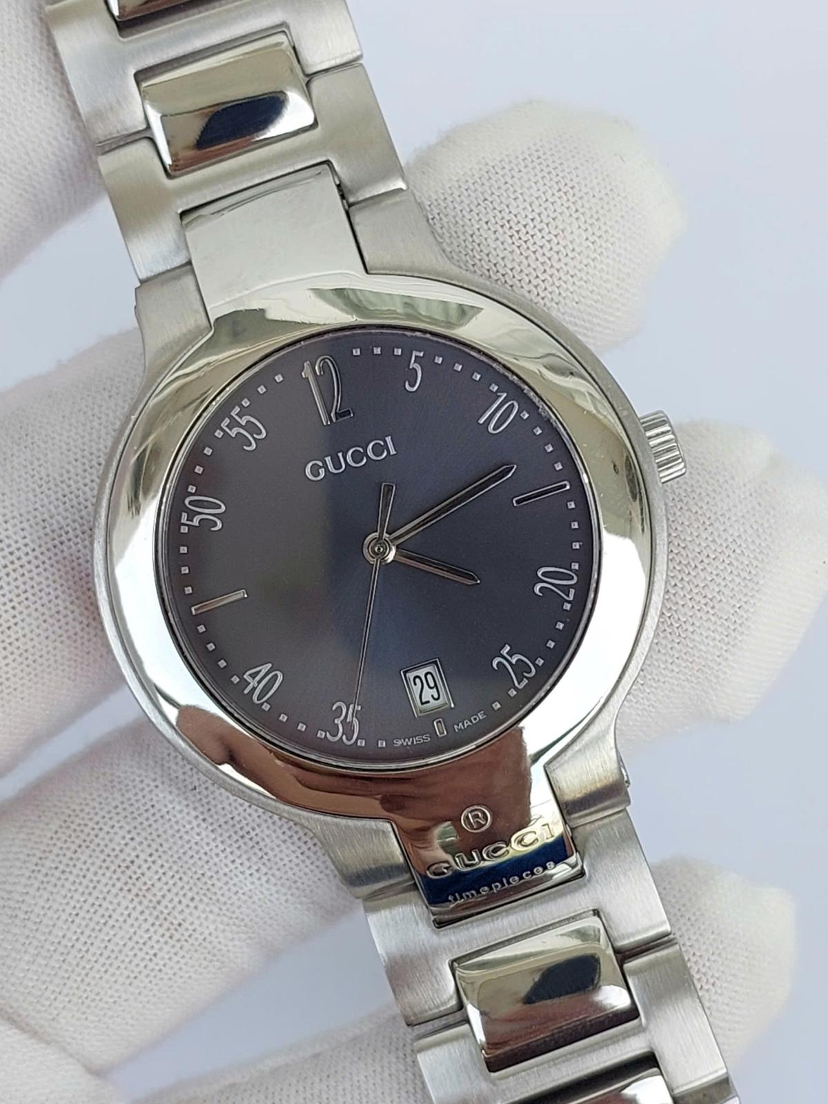 Mẫu Gu.cci Unisex hoàn hảo cho những cổ tay nam trung bình, nổi bật với thiết kế toàn thân từ thép không gỉ cao cấp sáng bóng ôm trọn lấy mặt số màu xám đen chải tia sunburst đầy chiều sâu và cuốn hút. Điểm nhấn trên nền mặt số là các cọc số Ả Rập cách điệu hiện đại kết hợp cùng bộ kim bạc thanh mảnh và ô lịch ngày tiện dụng đặt tại góc 6 giờ tạo nên tổng thể hài hòa, tinh tế. Với kích thước mặt size 35mm chuẩn mực, đây là sự lựa chọn "tỷ lệ vàng" dành cho những quý ông có cổ tay trung bình hoặc nhỏ, yêu thích phong cách classic gọn gàng và khỏe khoắn. Chính hãng Gu.cci , sx tại Thụy Sỹ, sd máy pin Thụy Sỹ, nguyên bản size 35mm, độ mới tầm 97-98%.
