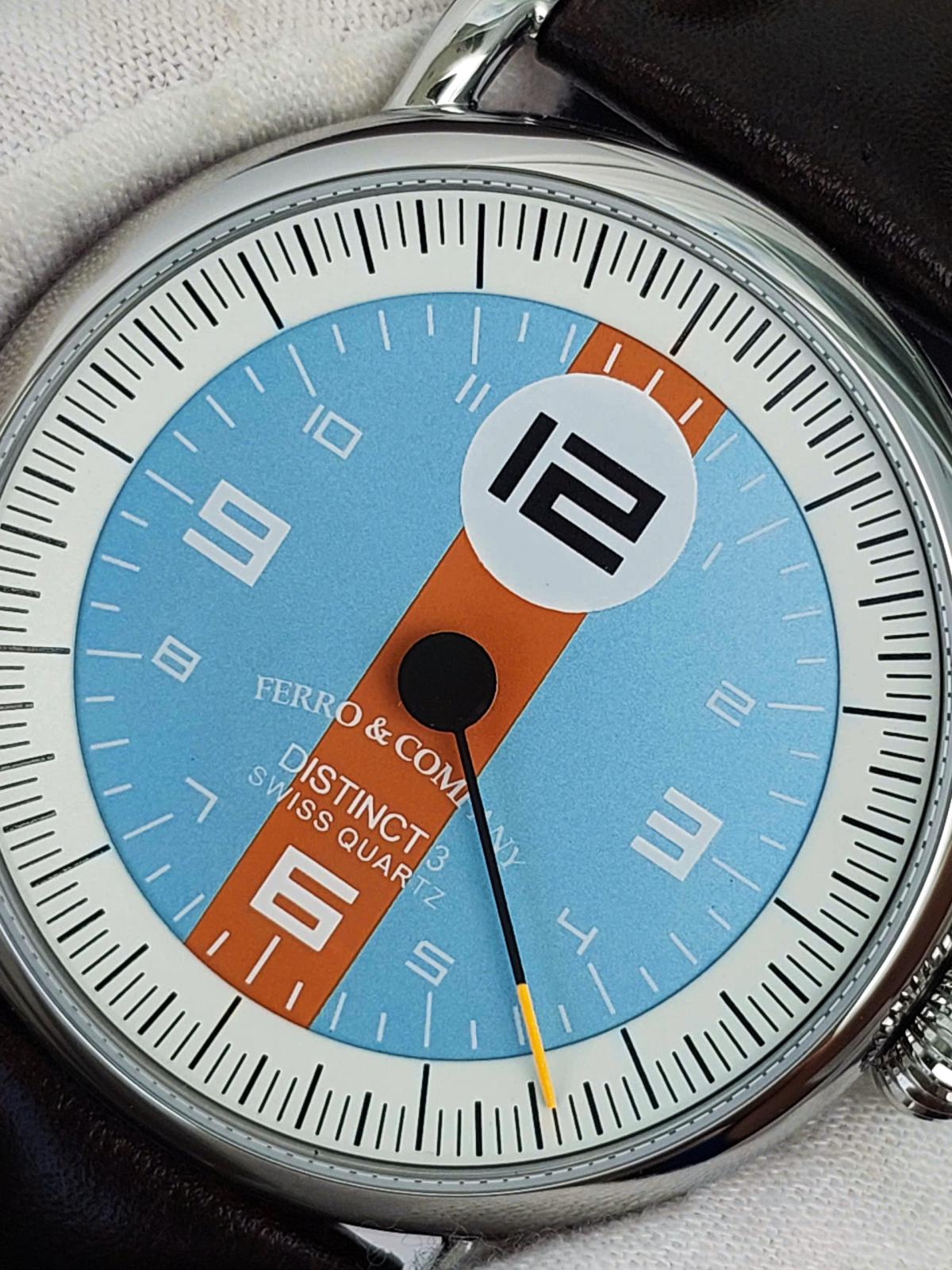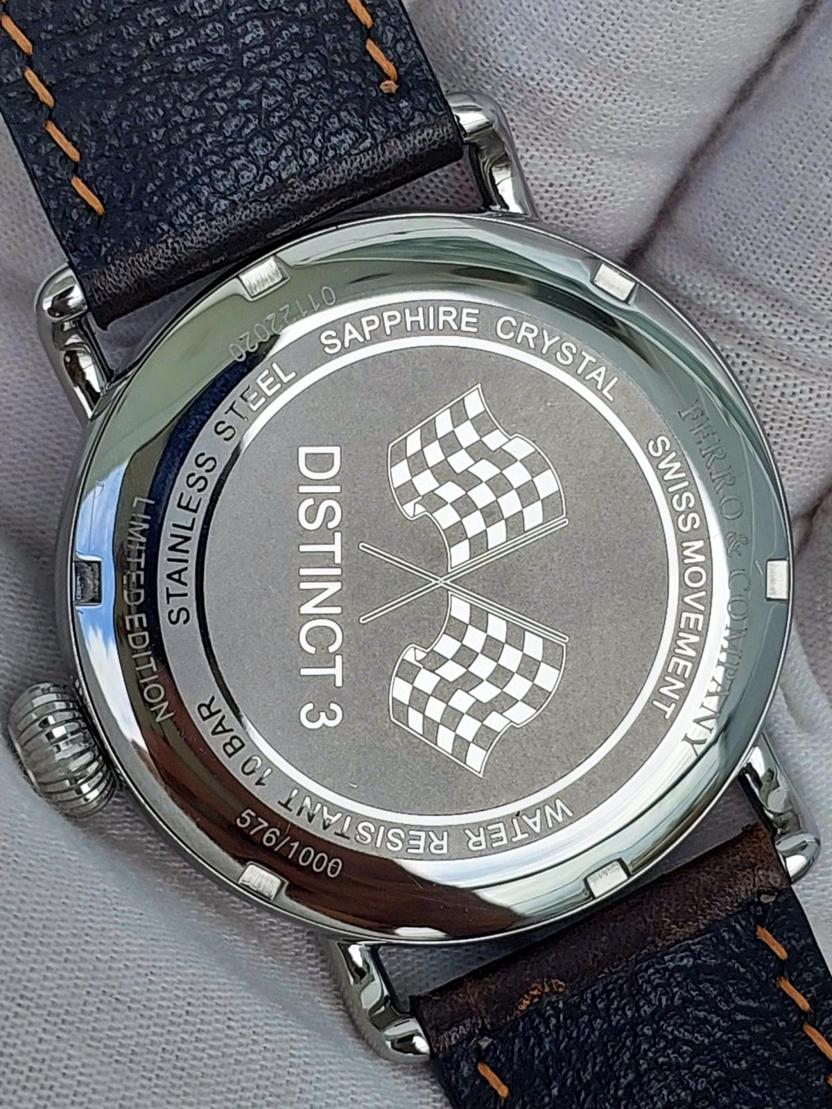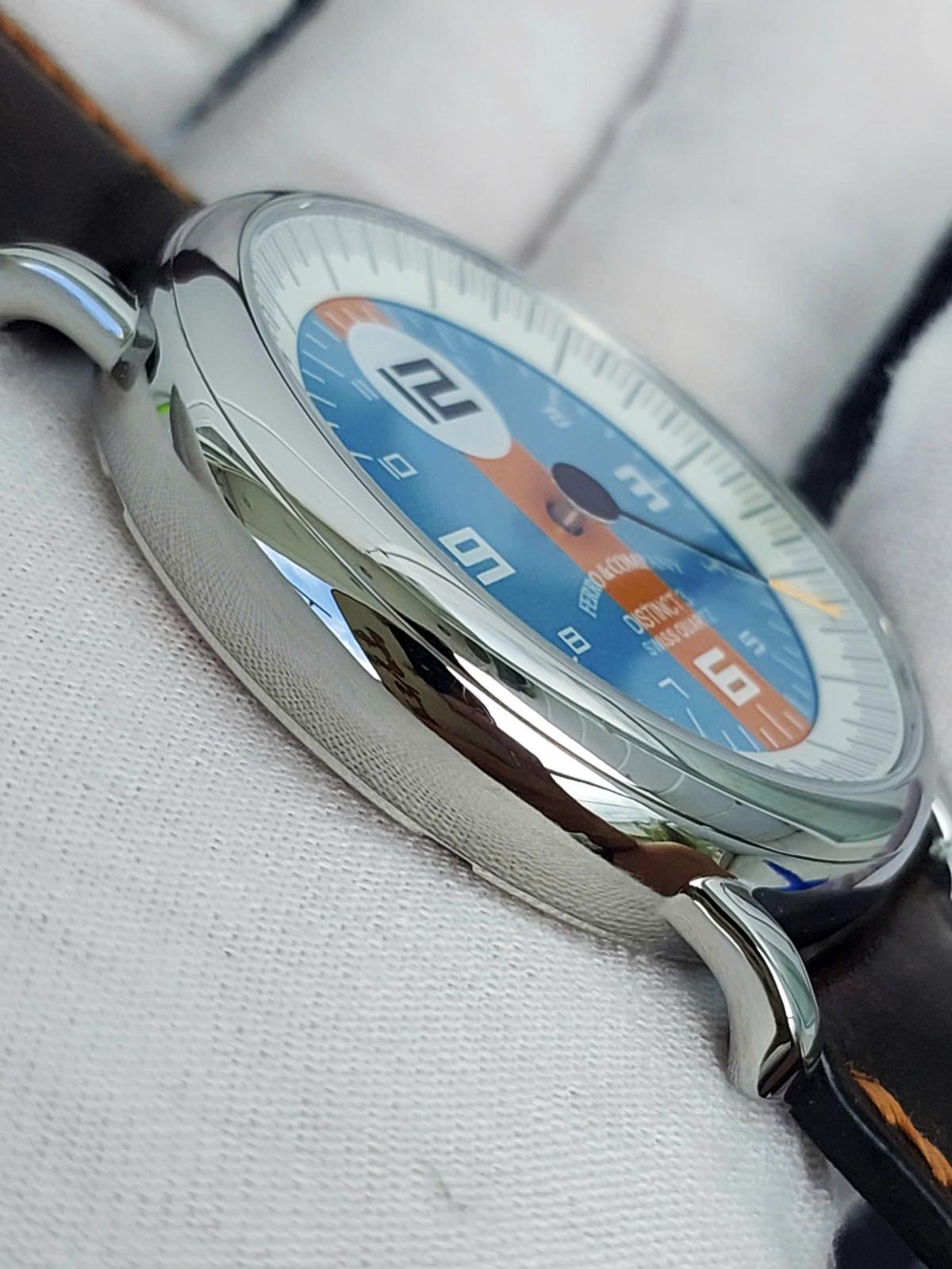 Sx giới hạn 1000 chiếc trên toàn TG, mẫu đồng hồ Fe.rro & Company Distinct 3 với thiết kế độc đáo, nổi bật với chỉ một kim duy nhất là kim giờ, mang lại vẻ đẹp tinh tế và khác biệt. Kim giờ dài và thanh mảnh di chuyển nhẹ nhàng trên mặt số xanh da trời tươi sáng, tạo nên một sự đơn giản đầy ấn tượng. Thiết kế này không chỉ tiết kiệm không gian mà còn thể hiện sự thanh thoát và tinh tế, phù hợp với những ai yêu thích sự tối giản mà vẫn đầy sang trọng. Dải cam chạy dọc mặt đồng hồ làm nổi bật kim giờ, đồng thời tăng thêm nét trẻ trung, năng động cho mẫu đồng hồ này. Phía sau của đồng hồ được trang trí tỉ mỉ với biểu tượng cờ đua thể thao, cùng các chi tiết nổi bật như số hiệu phiên bản giới hạn, tạo nên nét độc đáo và giá trị riêng biệt cho mỗi chiếc đồng. Với kiểu dáng đặc biệt, Ferro & Company Distinct 3 chính là lựa chọn lý tưởng cho những người muốn khẳng định phong cách riêng biệt và yêu thích sự tinh tế, đơn giản mà vẫn đầy cuốn hút . Chính hãng Fe.rro & Company, sd máy Pin Thụy Sỹ, full hộp, thẻ, khóa zin, dây zin tặng thêm dây da handmade thay thế, size 42mm, độ mới cao 99%.